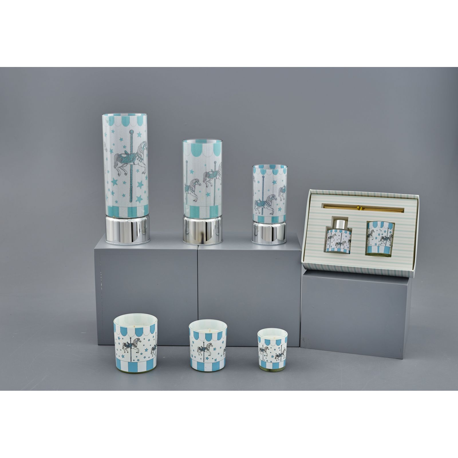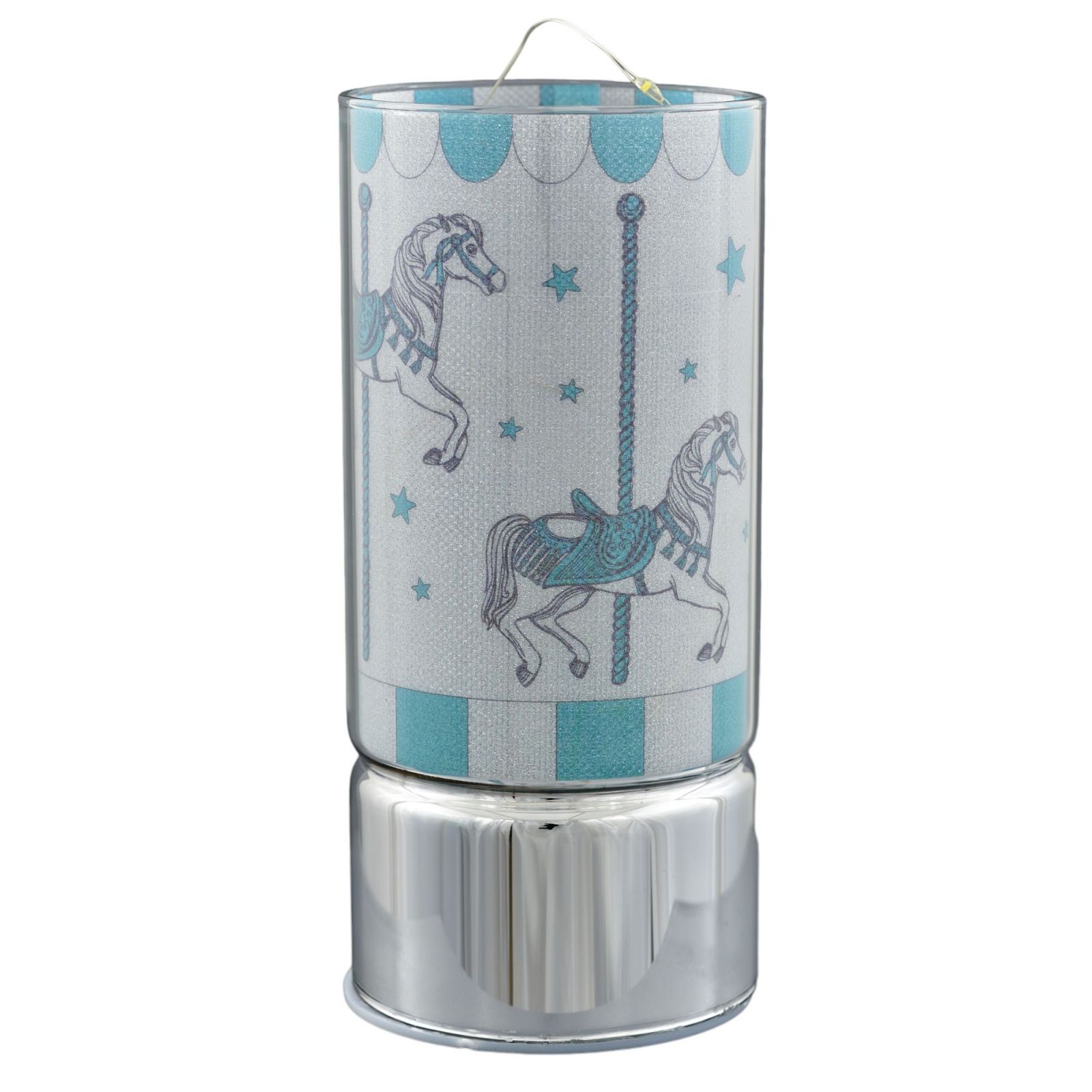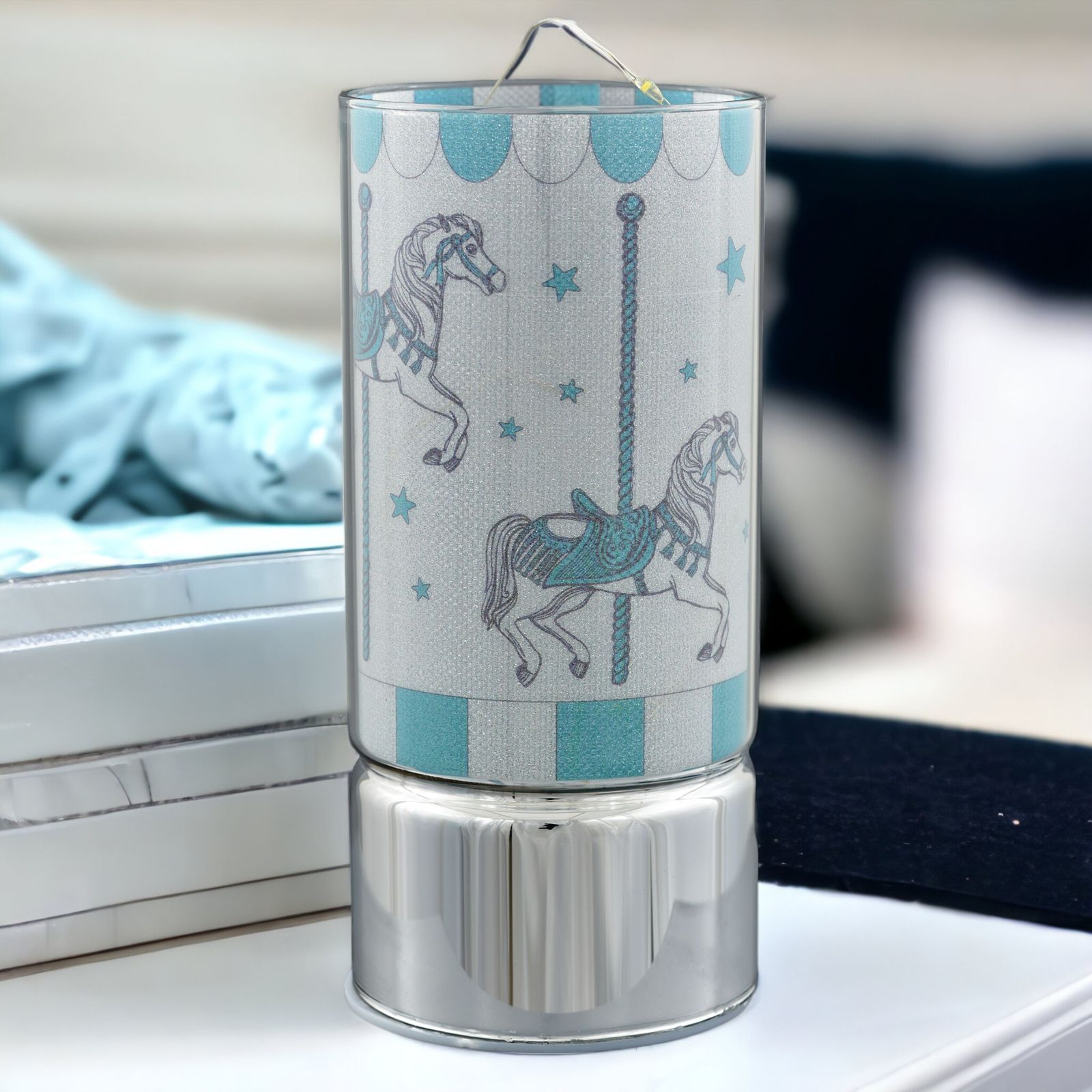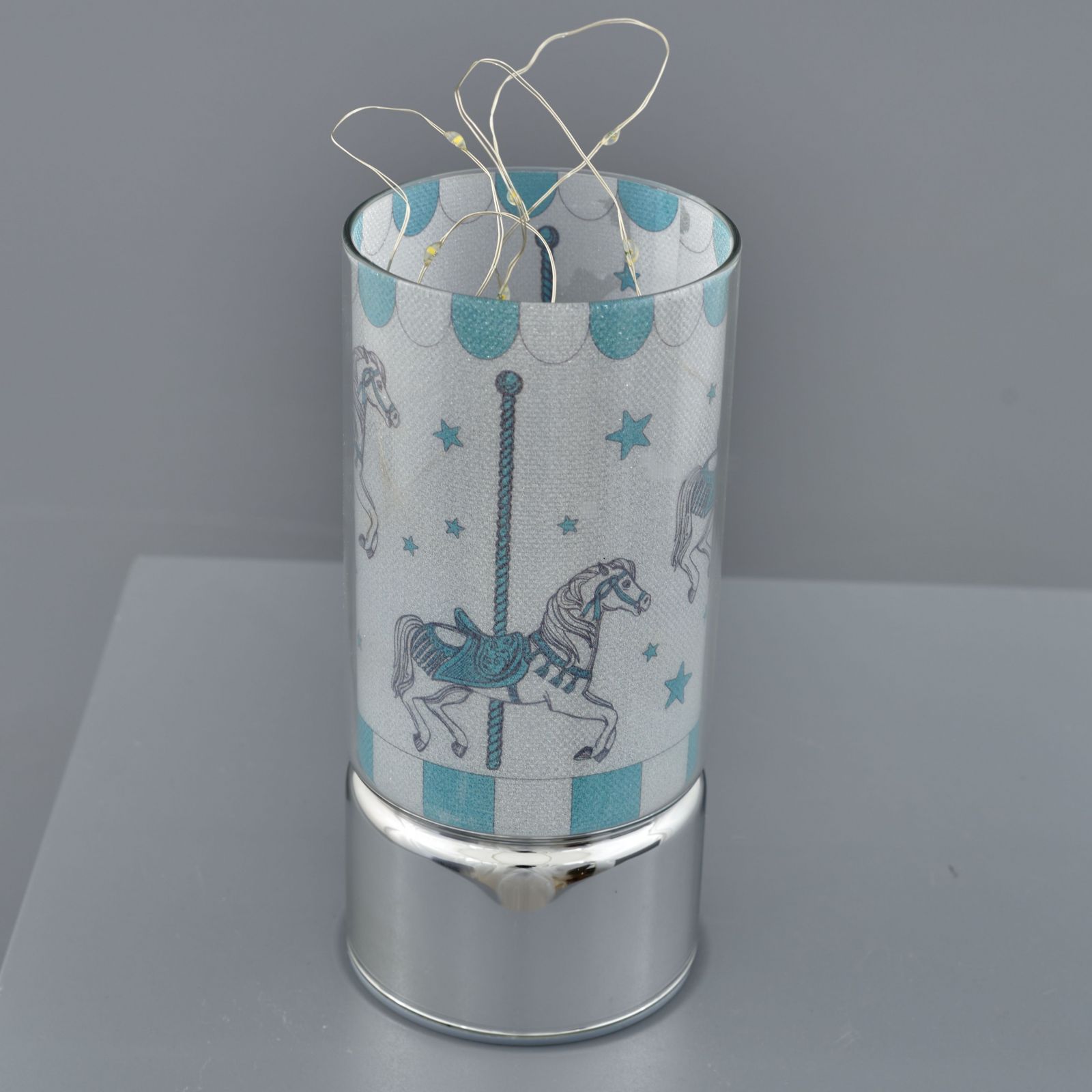Se stai cercando una bomboniera unica per un battesimo o un primo compleanno del tuo bimbo, questa incantevole Lampada a Cilindro con la raffigurazione di una giostrina con cavalli e particolari celesti è la scelta perfetta.