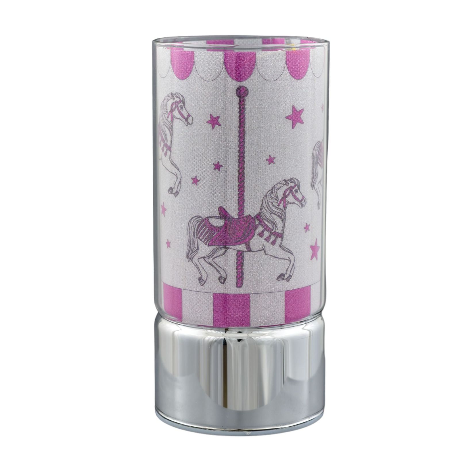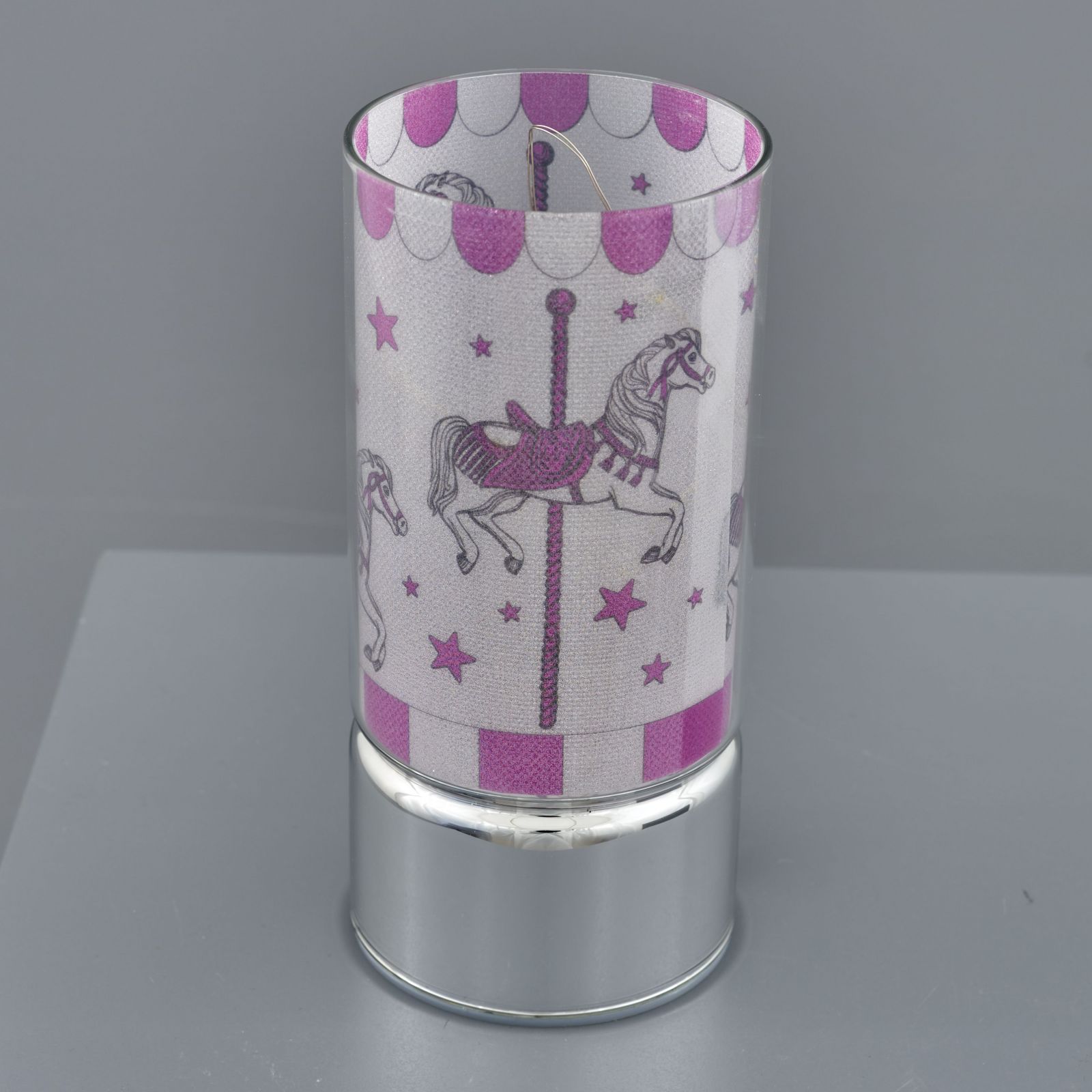 Regala una lampada notturna unica, per rendere speciale l'evento di un bambino! Questa speciale lampada a cilindro è realizzata in vetro ed è decorata con una giostrina con cavalli e particolari rosa. Disponibile in tre dimensioni Standard: 7x7x15 cm circa; Grande: 8x8x20 cm circa, Maxi: 9x9x25 cm circa, è perfetta per celebrare il battesimo o il primo compleanno di una bimba.