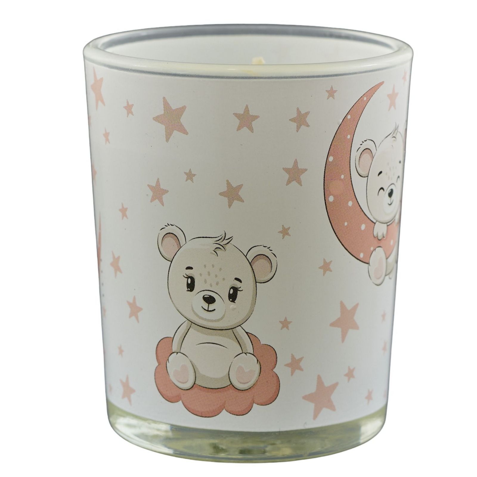Realizzata in vetro con orsetto sulla luna e stelline con dettagli rosa, è disponibile in tre dimensioni, con candela inclusa: la versione Standard da 8x8x9 cm circa con candela da 75 gr., la versione grande da 7x7x8 cm circa con candela da 150 gr, e la versione maxi da 5,5x5,5x6,8 cm circa con candela da 200 gr.