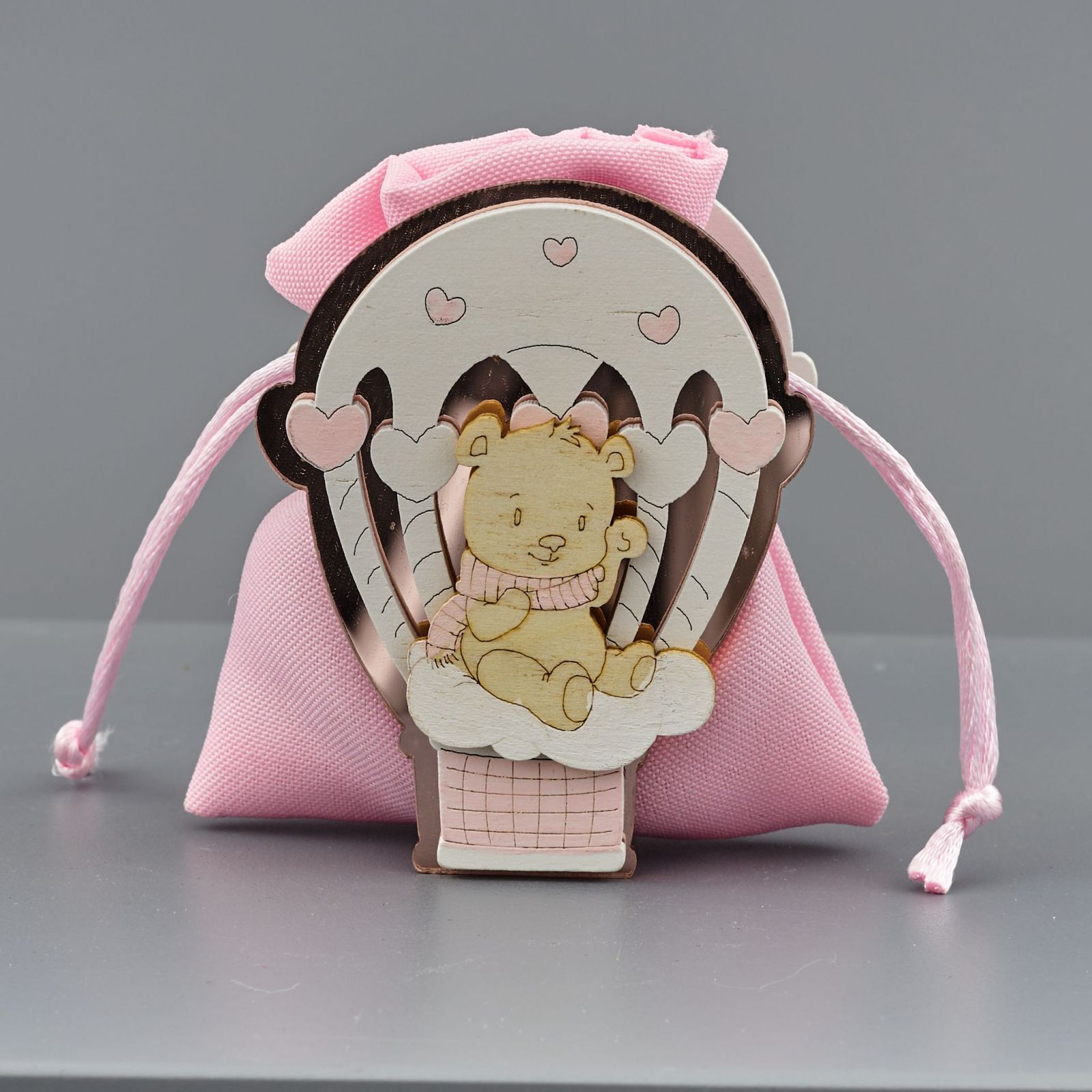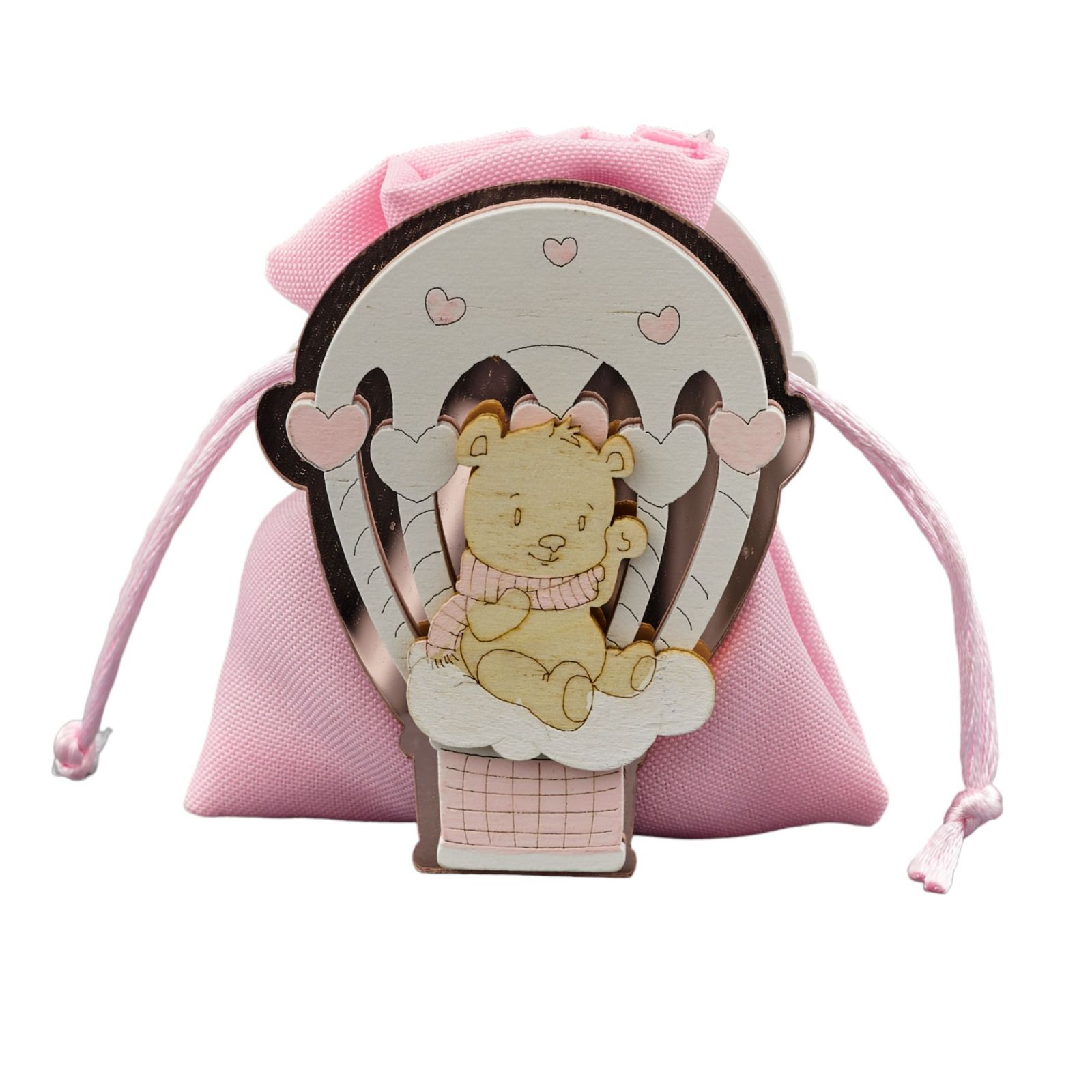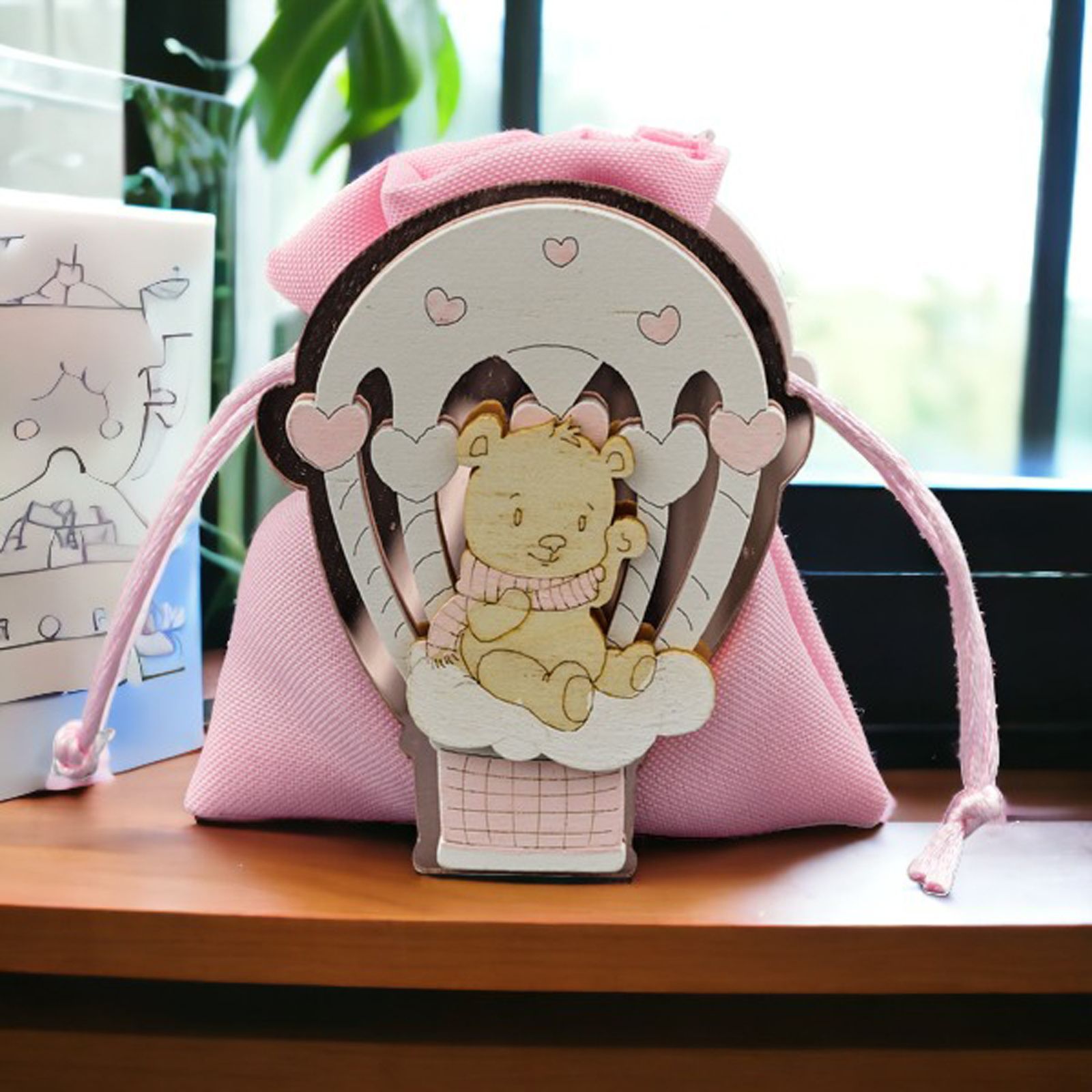 Regala una bomboniera ai tuoi invitati in occasione di una nascita, di un battesimo o di qualsiasi altro evento speciale, scegliendo il nostro delizioso portaconfetti a forma di mongolfiera in plexiglass rosa, a doppio strato. La parte anteriore è realizzata in legno con un grazioso orsetto su una nuvola e al centro un sacchettino rosa. Un segnaposto originale e carino da regalare ai tuoi invitati, soprattutto se si tratta di una bambina.