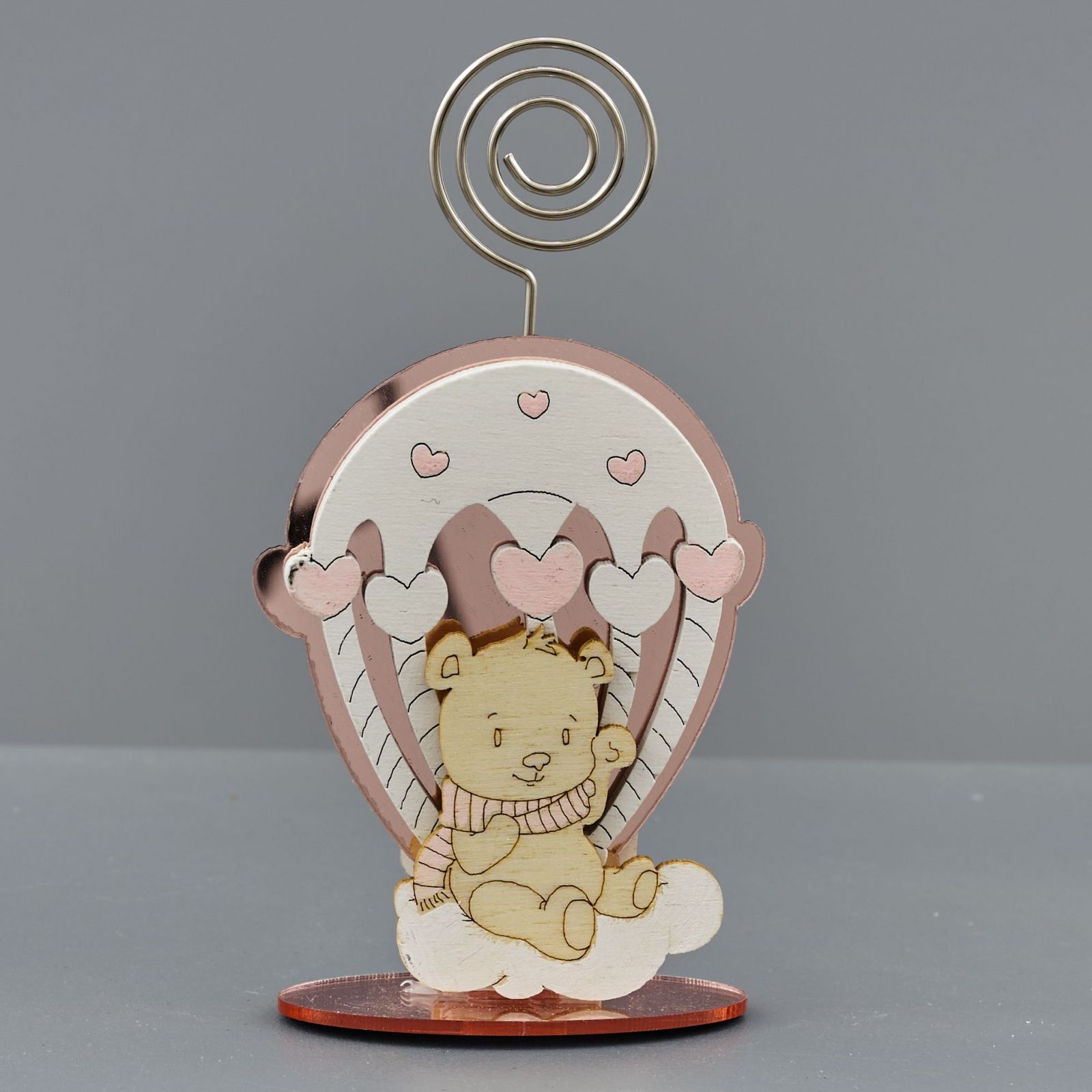 Regala questo memoclip a forma di mongolfiera in legno rosa, perfetto per i festeggiamenti di una nascita o di un battesimo. È realizzato con una parte anteriore in legno incorniciata da una struttura in plexiglass, di colore rosa, e un orsetto su nuvola. Ideale come porta foto o come segnaposto, è un dono perfetto per l'evento di una femminuccia.