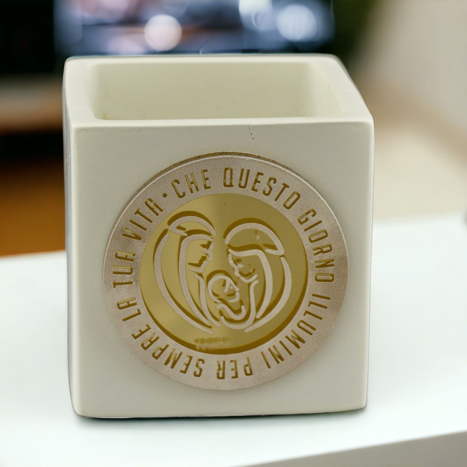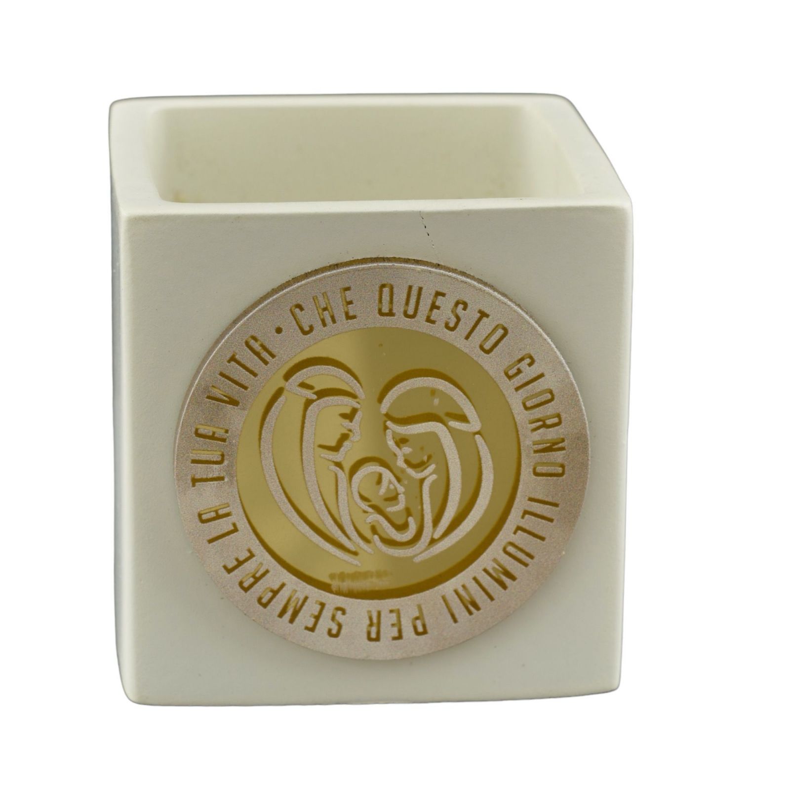 Regala un dono che illumini per sempre il cammino dei tuoi cari con il portacandela sacra famiglia! Una bomboniera originale e particolare che renderà unico il momento speciale del battesimo, della prima comunione o della santa cresima. Questo accessorio da cerimonia è realizzato in bianco con particolari color oro, ha una dimensione di H.6X6X6CM ed è inclusa nella confezione una scatola regalo.