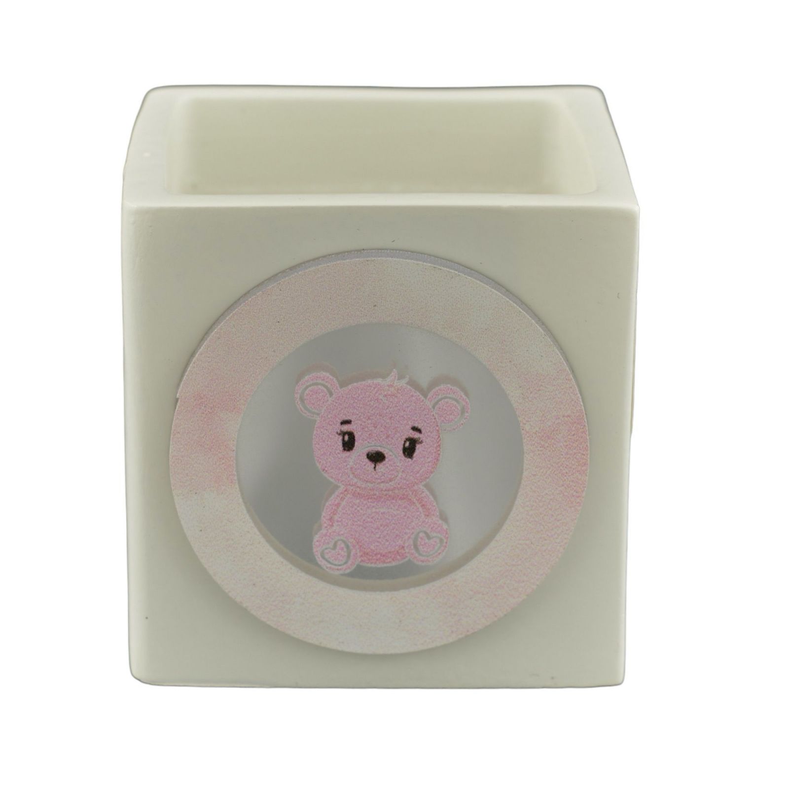 Realizzato in colore bianco con un delizioso orsetto rosa e dettagli color argento, questo vaso misura H.6X6X6CM e include una scatola regalo nel prezzo.