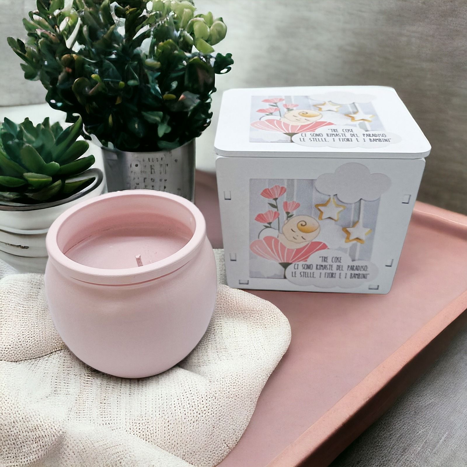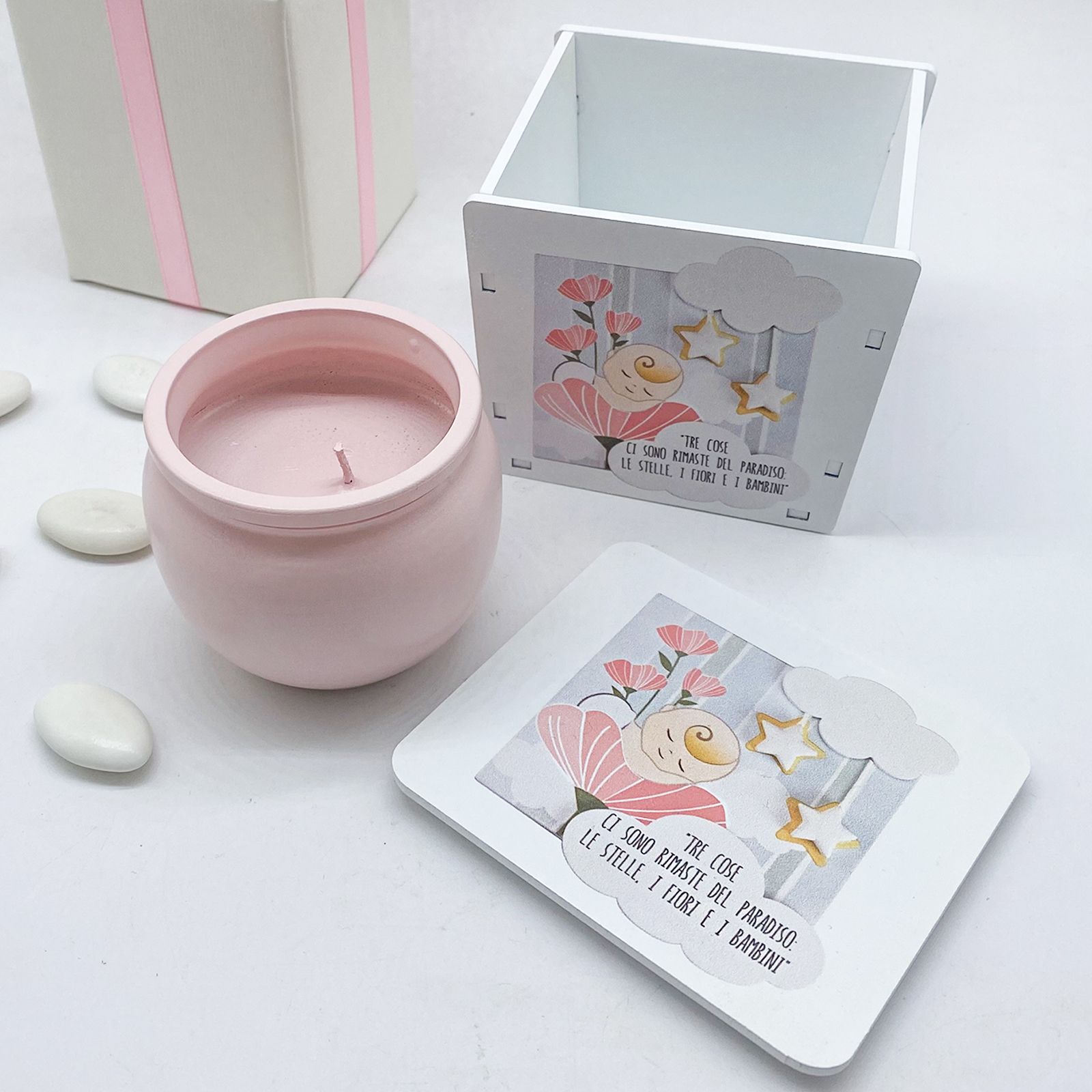 Rendi indimenticabile il Santo Battesimo della tua piccola principessa con la nostra esclusiva Candela Profumata, incastonata in un portacandela decorato da eleganti fiori rosa, stelline e una dolce immagine di una bimba sognante sul fiore. La frase incisa sottolinea l'atmosfera magica: "Tre cose ci sono rimanste del paradiso: le stelle, i fiori e i bambini".