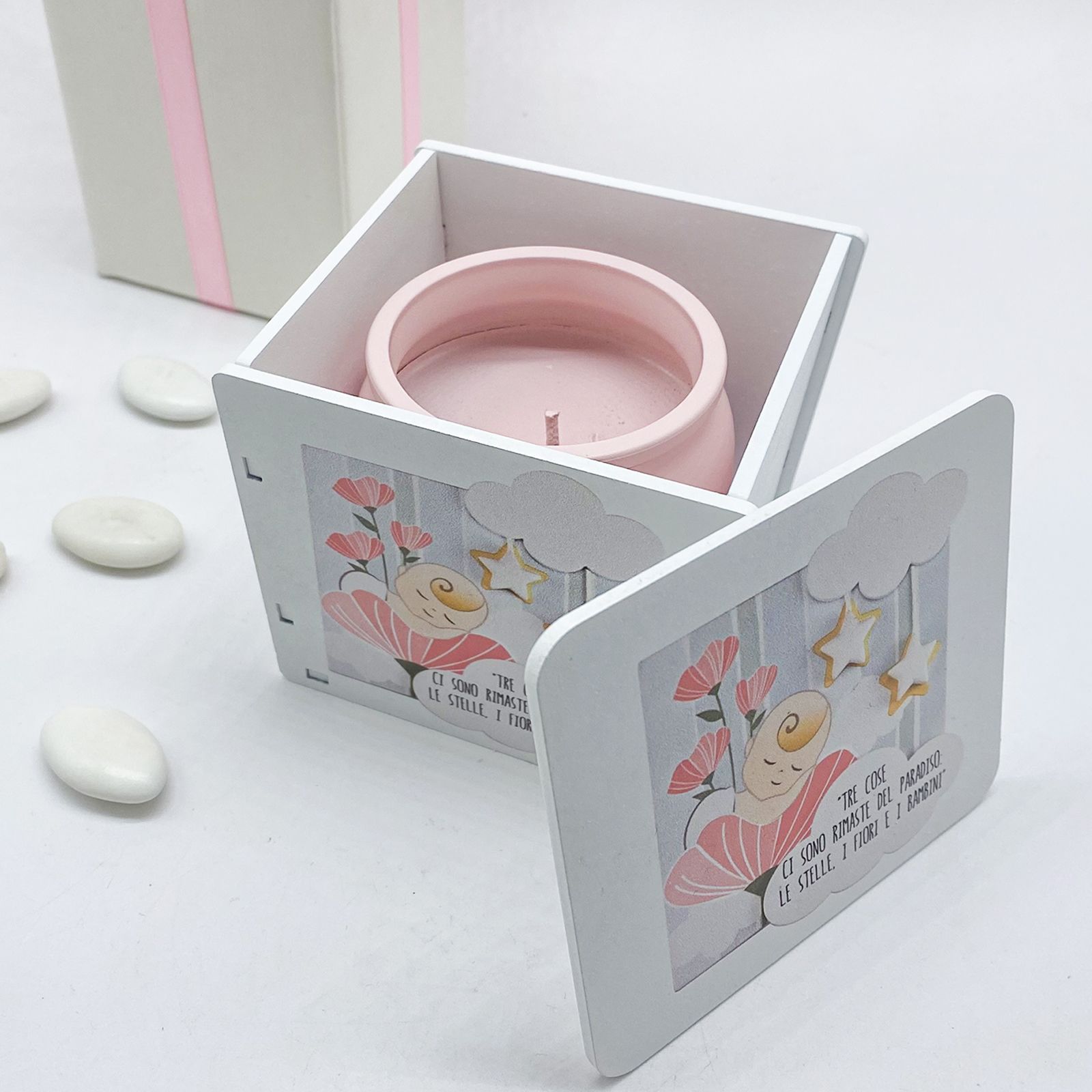 Oltre a essere un idea regalo delicata e originale, questa candela è l'opzione ideale per una bomboniera raffinata e particolare. Le sue dimensioni di cm 10 x h.9 e il colore bianco con particolari rosa aggiungono un tocco di eleganza, perfetto per celebrare il Battesimo della tua bimba.