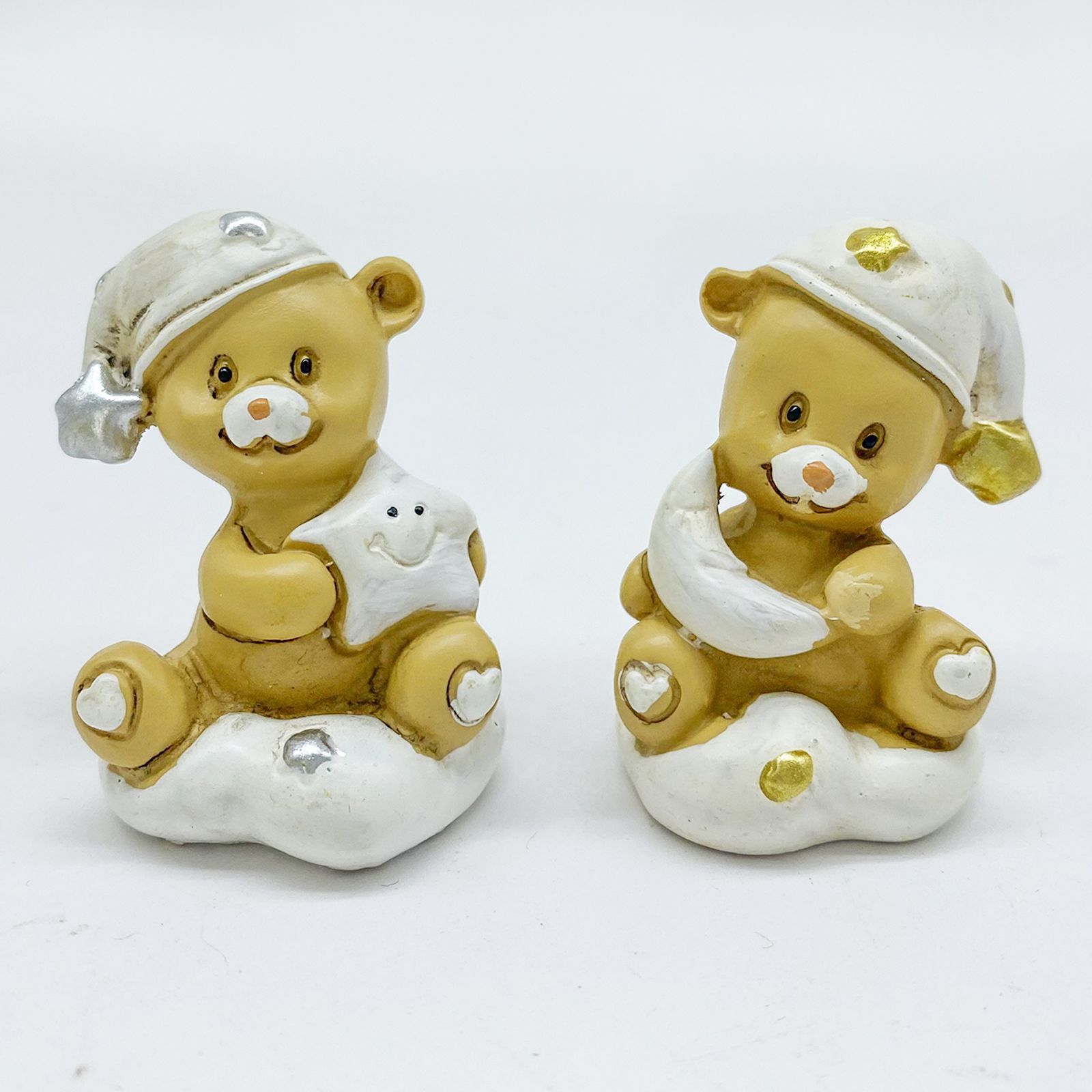 Condividi la gioia di una Nascita con la nostra tenera bomboniera: un orsetto seduto su una nuvola, indossando un cappellino da notte decorato con stelle argento o oro. Questa adorabile statuina, con dimensioni di 2.8x2.6x4.6 cm è realizzata in resina nei colori marrone e bianco, è il modo perfetto per festeggiare l'arrivo di un nuovo bimbo o bimba.