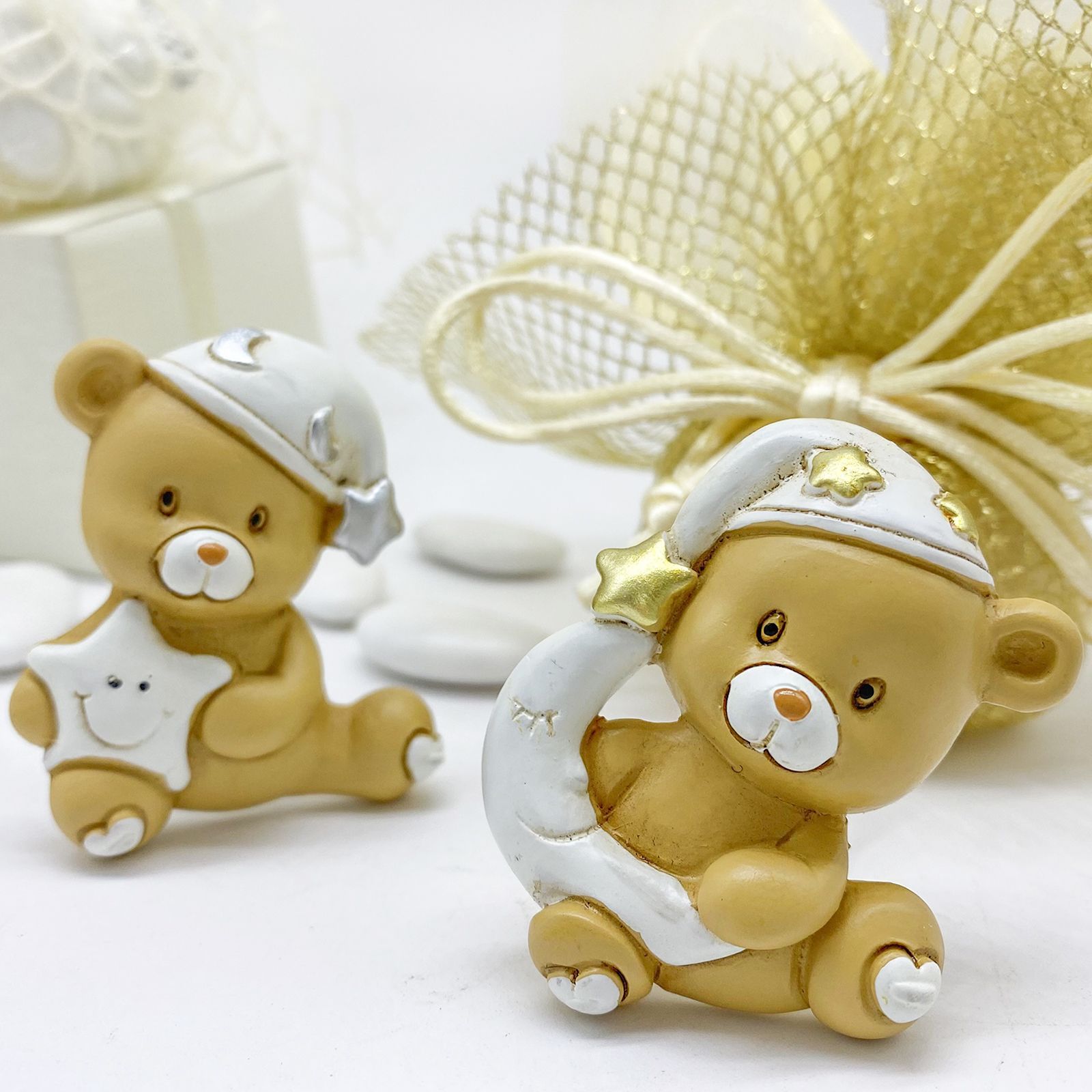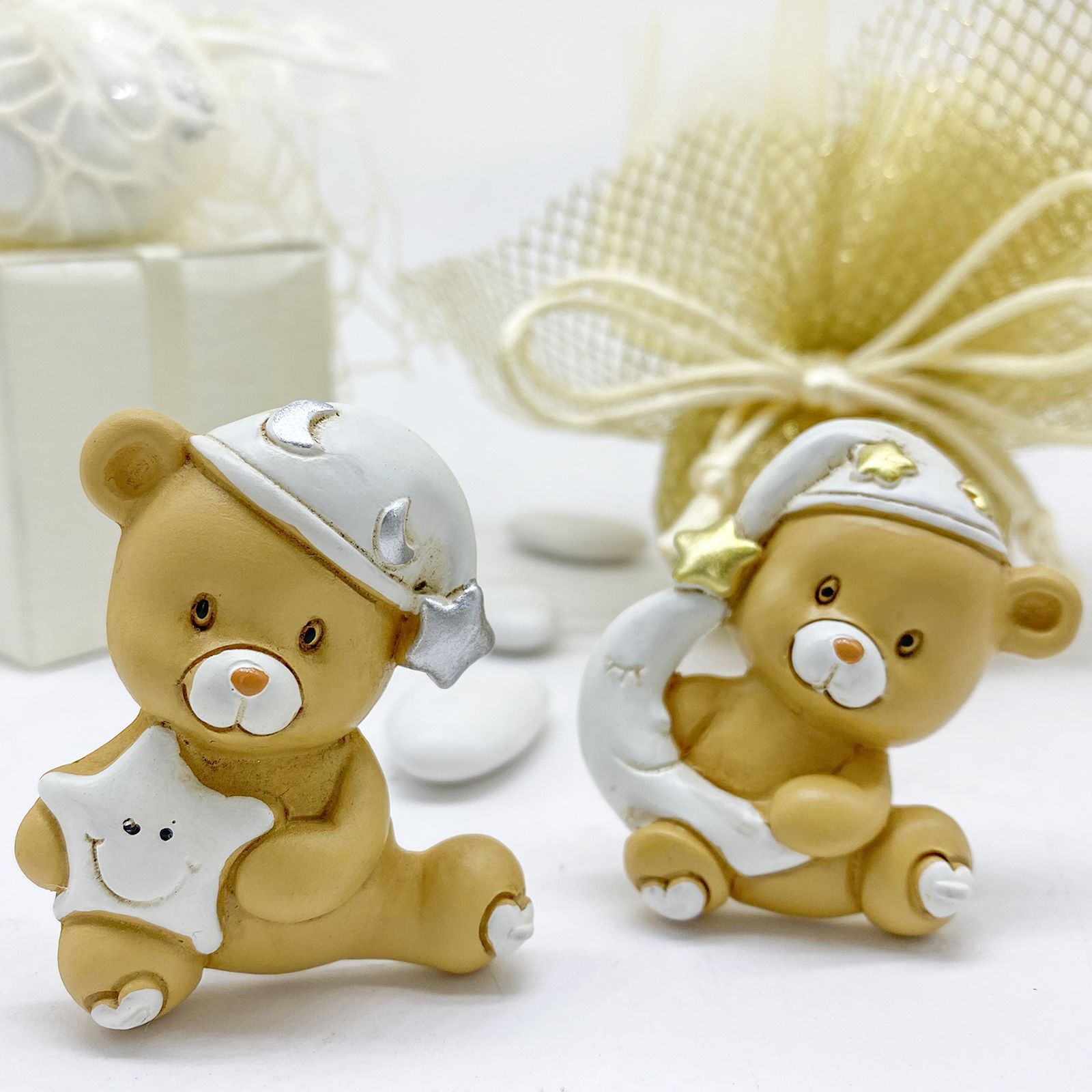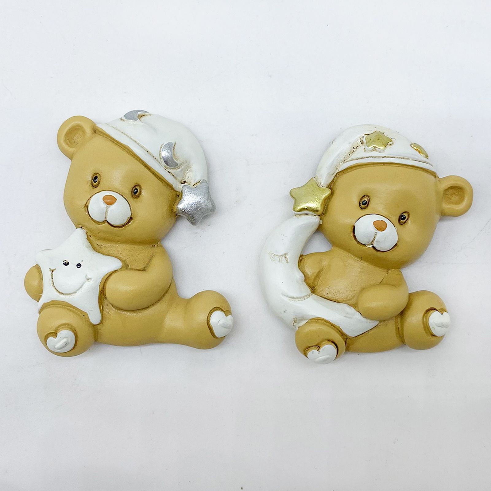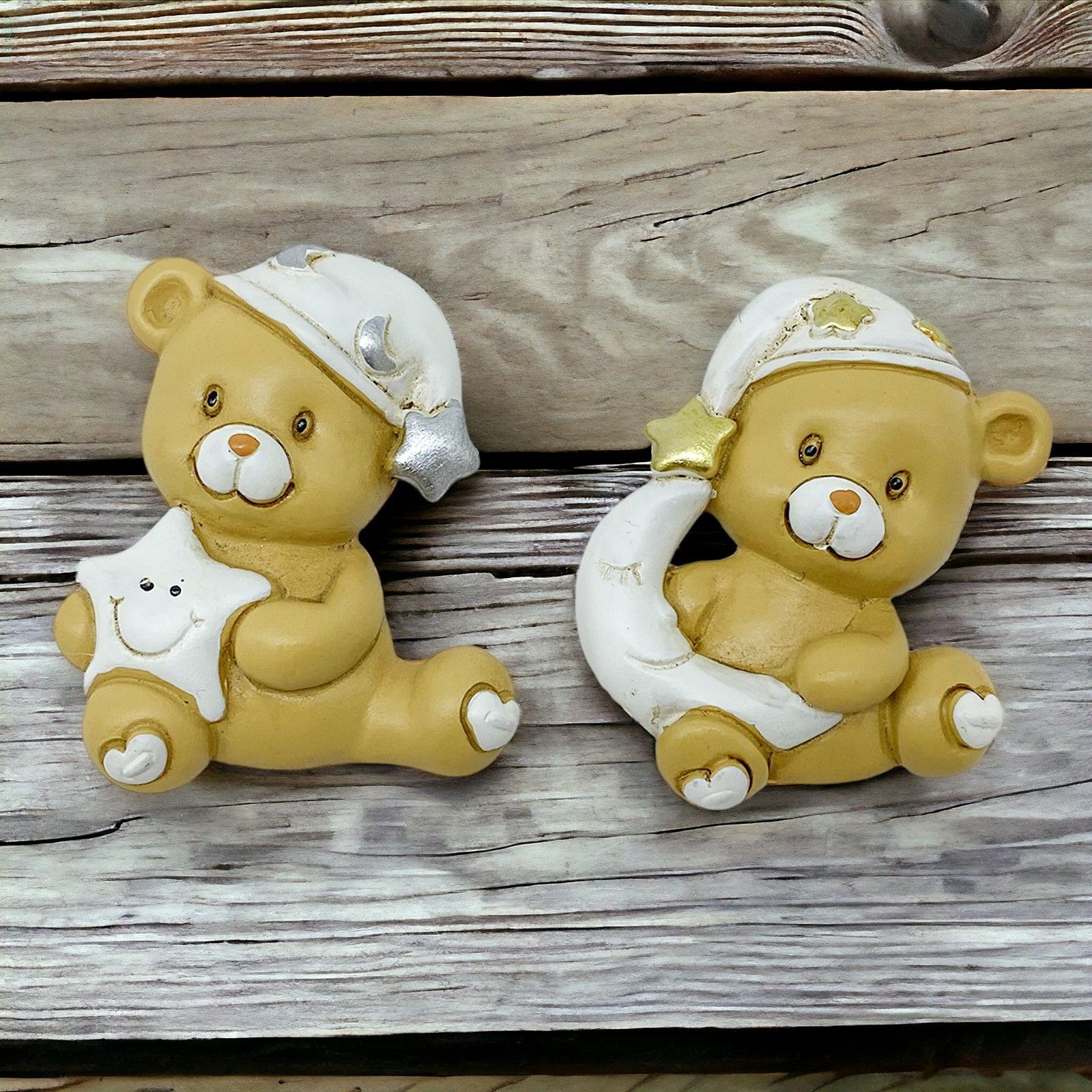 Rendi speciale l'annuncio di una Nascita con il nostro magnete orsetto. Ogni magnete presenta un adorabile orsetto con un cappellino da notte, offrendo due varianti tra le mani: una luna o una stella.