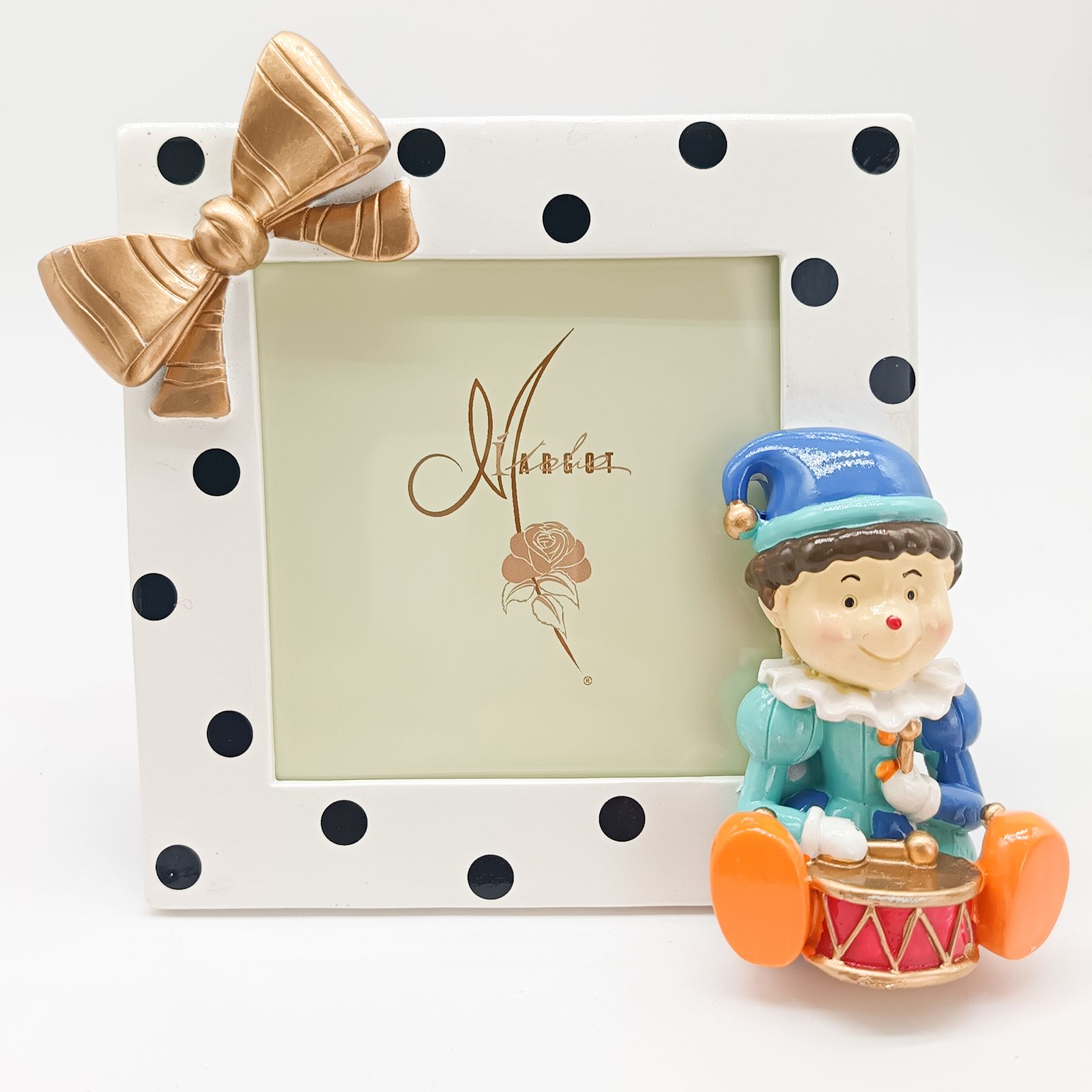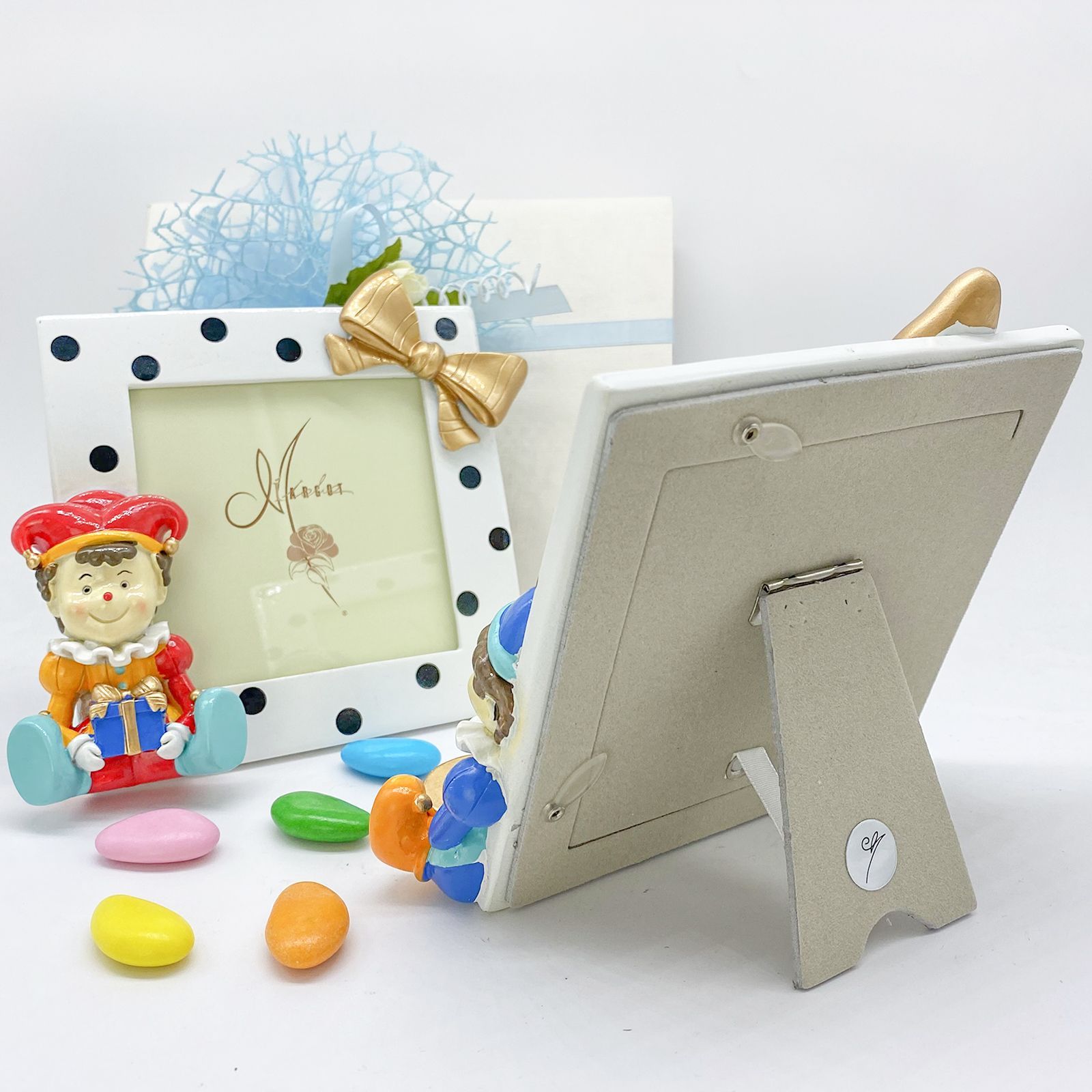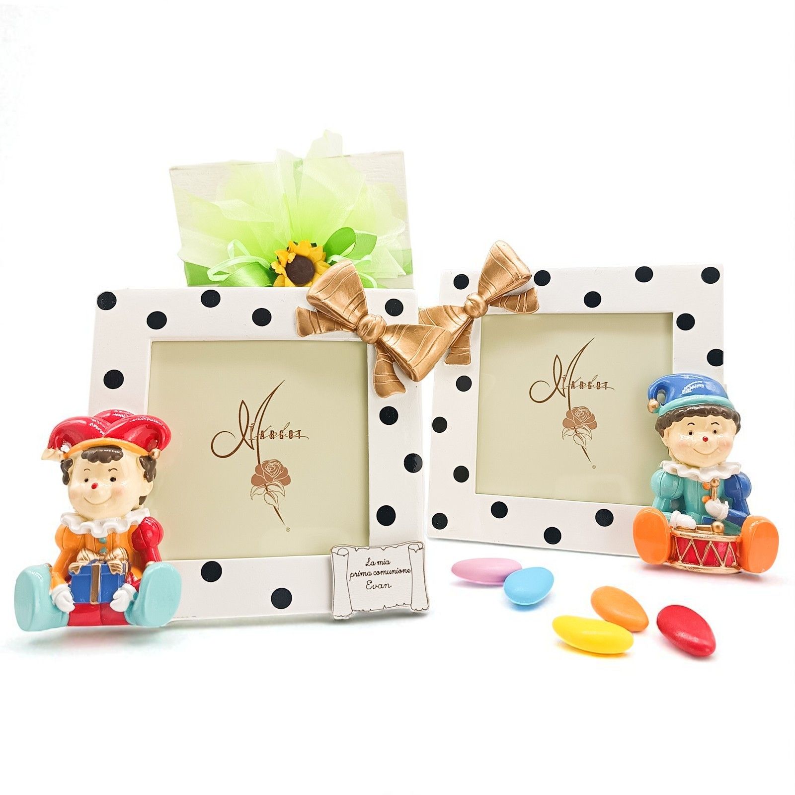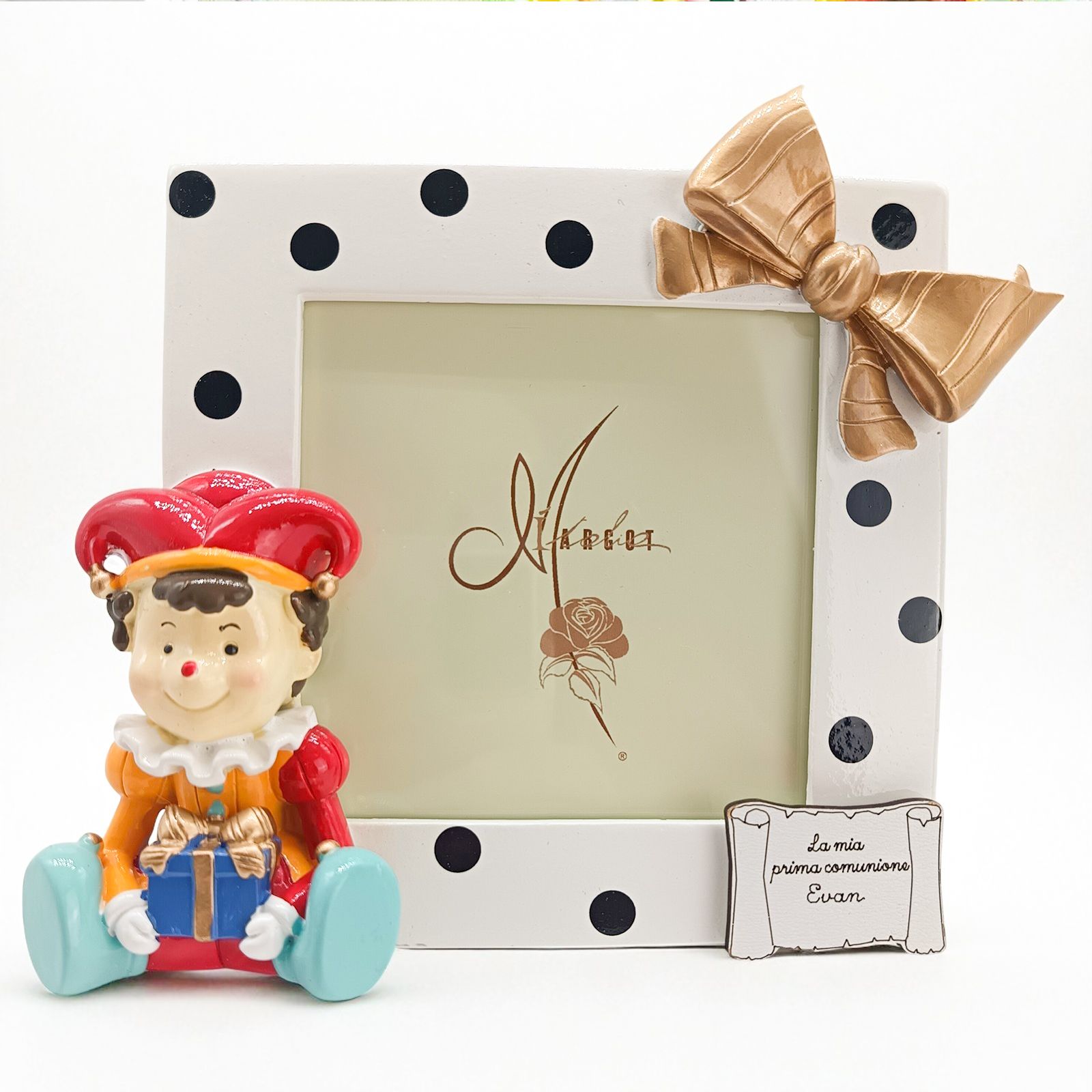 Entra nel mondo dell'emozione e della creatività con la nostra cornice portafoto Joker! Perfetta come bomboniera per battesimi, compleanni e comunioni, è realizzata in resina di qualità e assortita in due modelli e colori, con un elegante fiocco bronzo su un angolo.