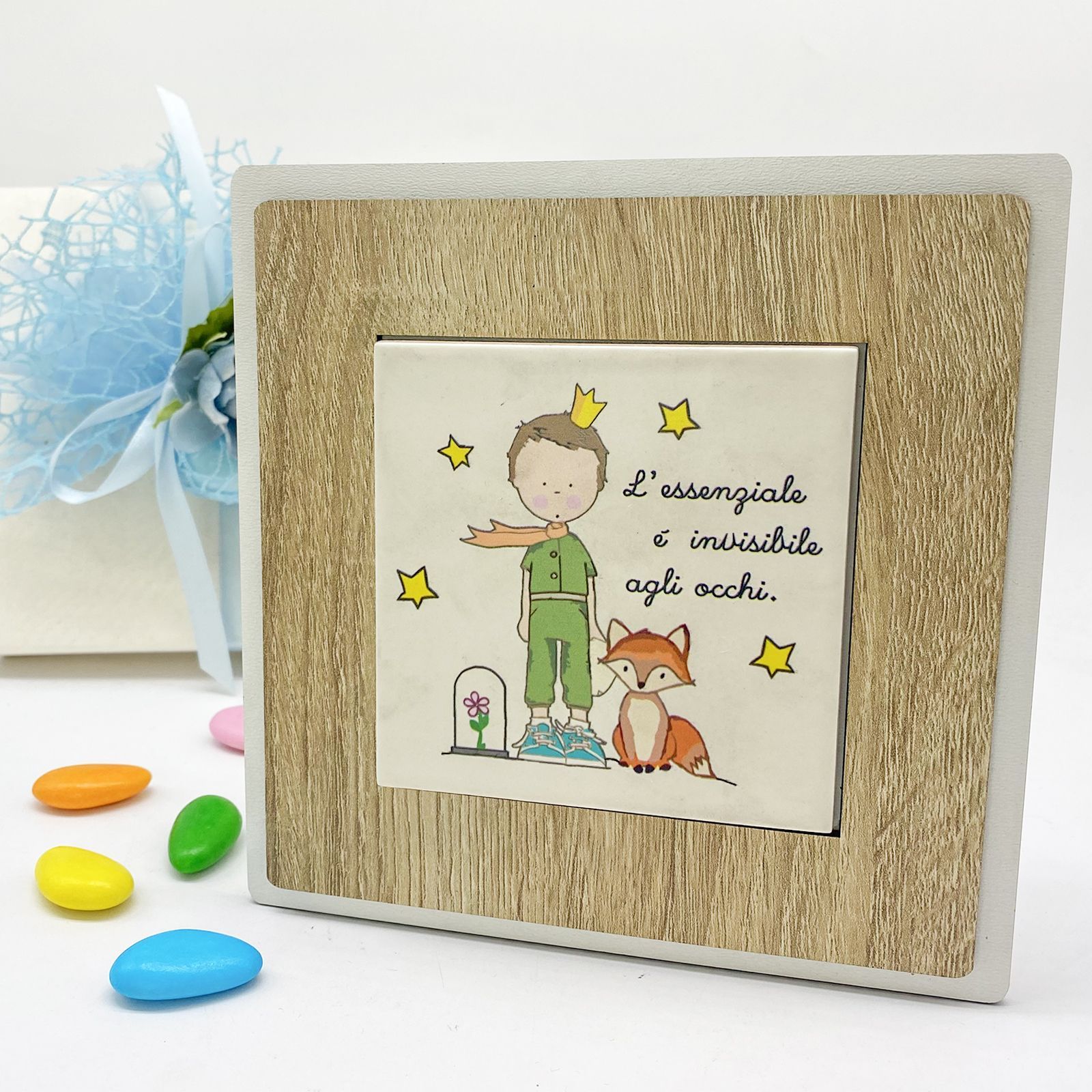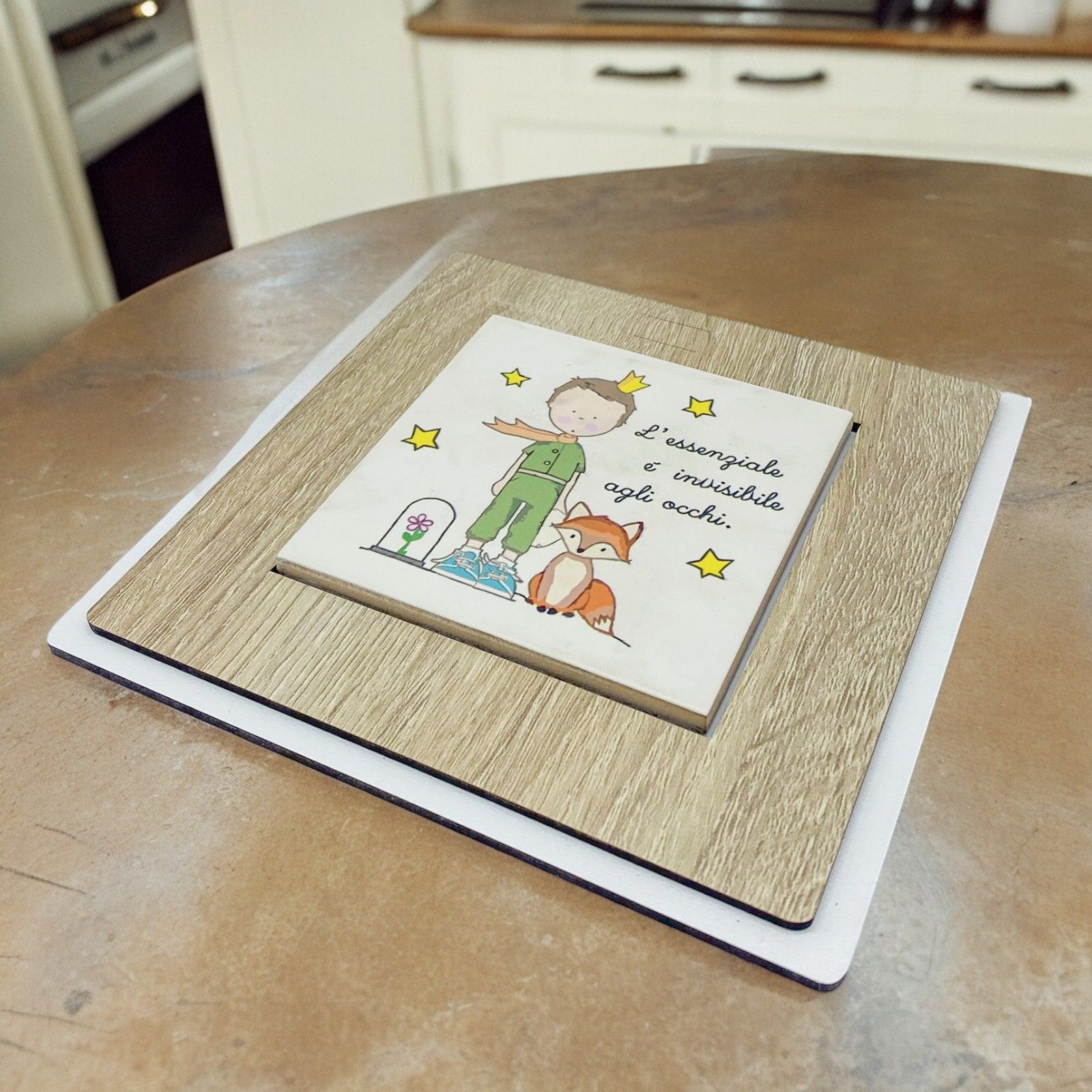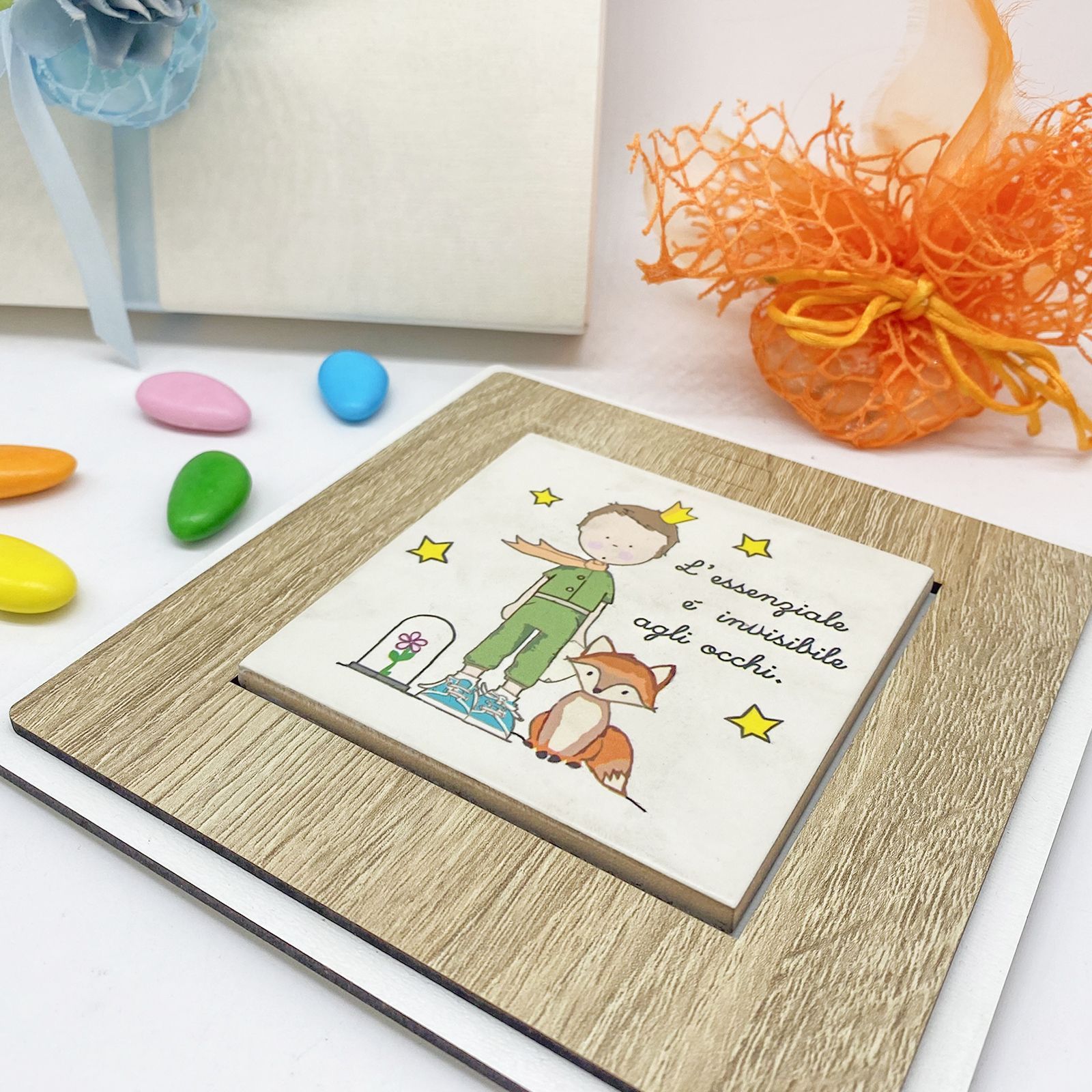 Cerchi una bomboniera originale e raffinata per battesimo o comunione? Scegli il nostro elegante sottopentola con mattonella in ceramica ispirato al Piccolo Principe, con la volpe e la rosa sotto campana.