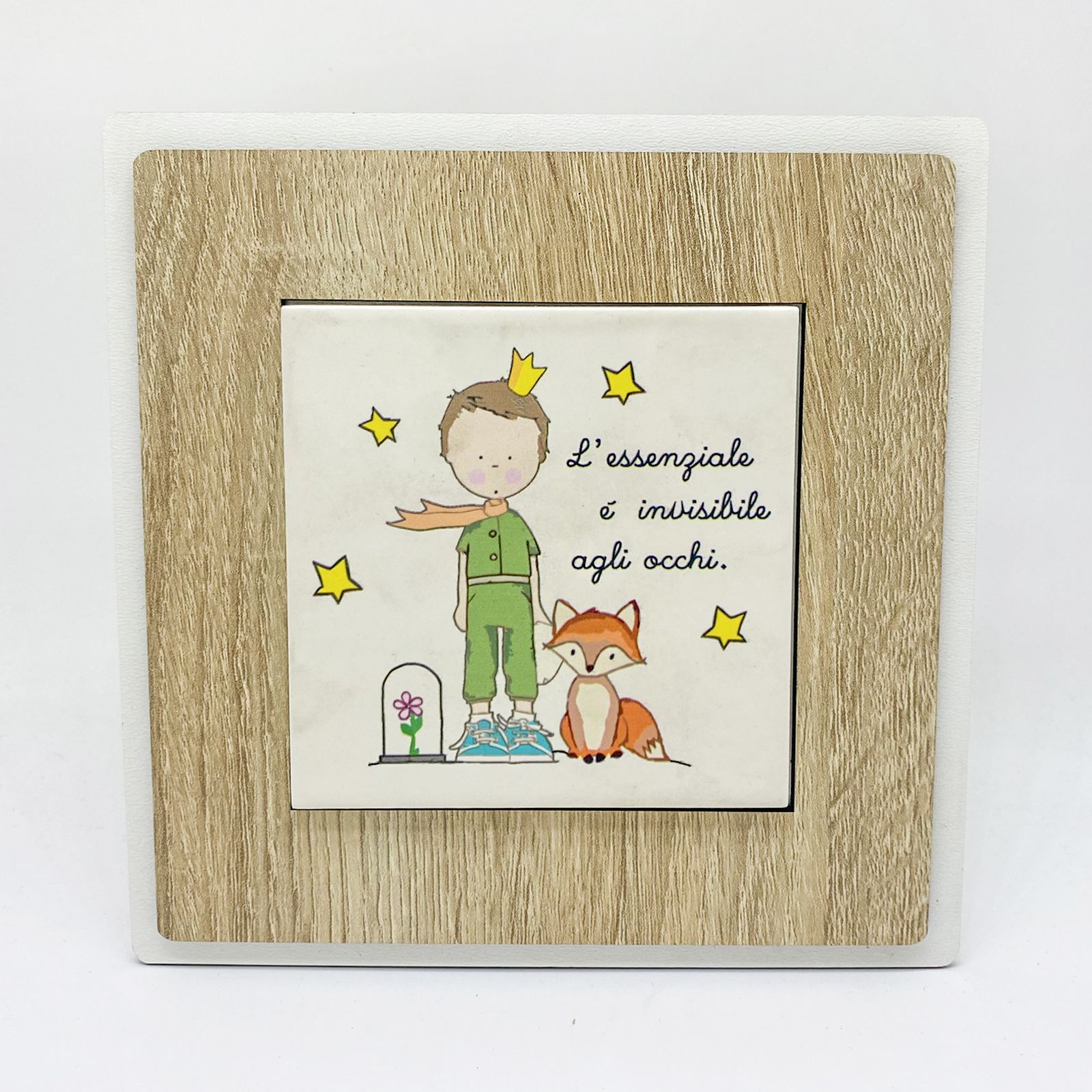 Realizzato in legno naturale e ceramica, misura circa 16,5 × 17 cm ed è decorato con la frase “L’essenziale è invisibile agli occhi”.