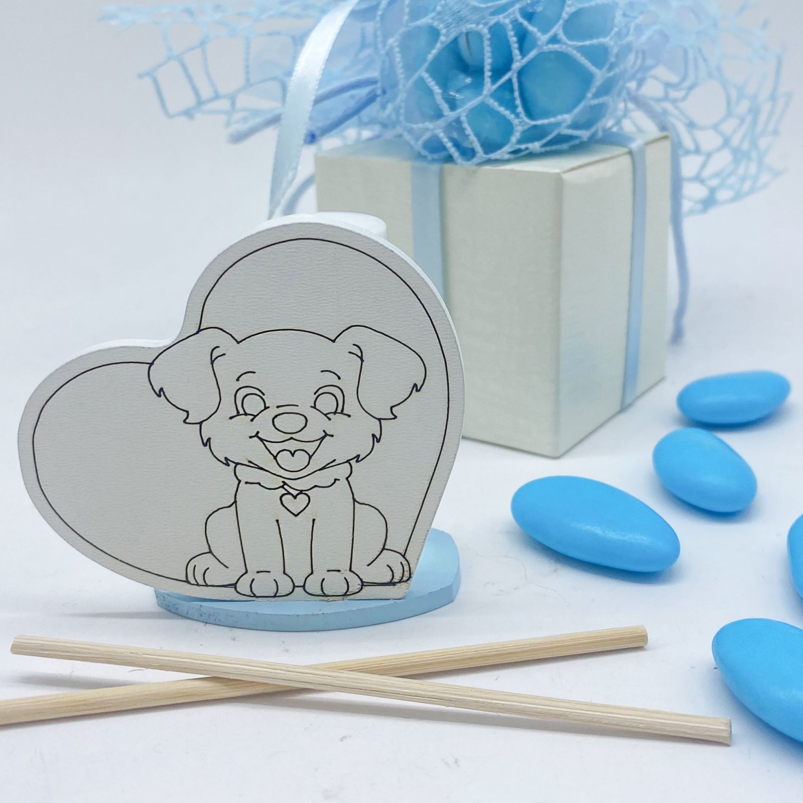 Scopri il nostro mini diffusore a forma di cuore, decorato con un adorabile cagnolino e una medaglietta a forma di cuore. Questo accessorio trasforma ogni battesimo in un evento indimenticabile con un tocco di dolcezza e eleganza.