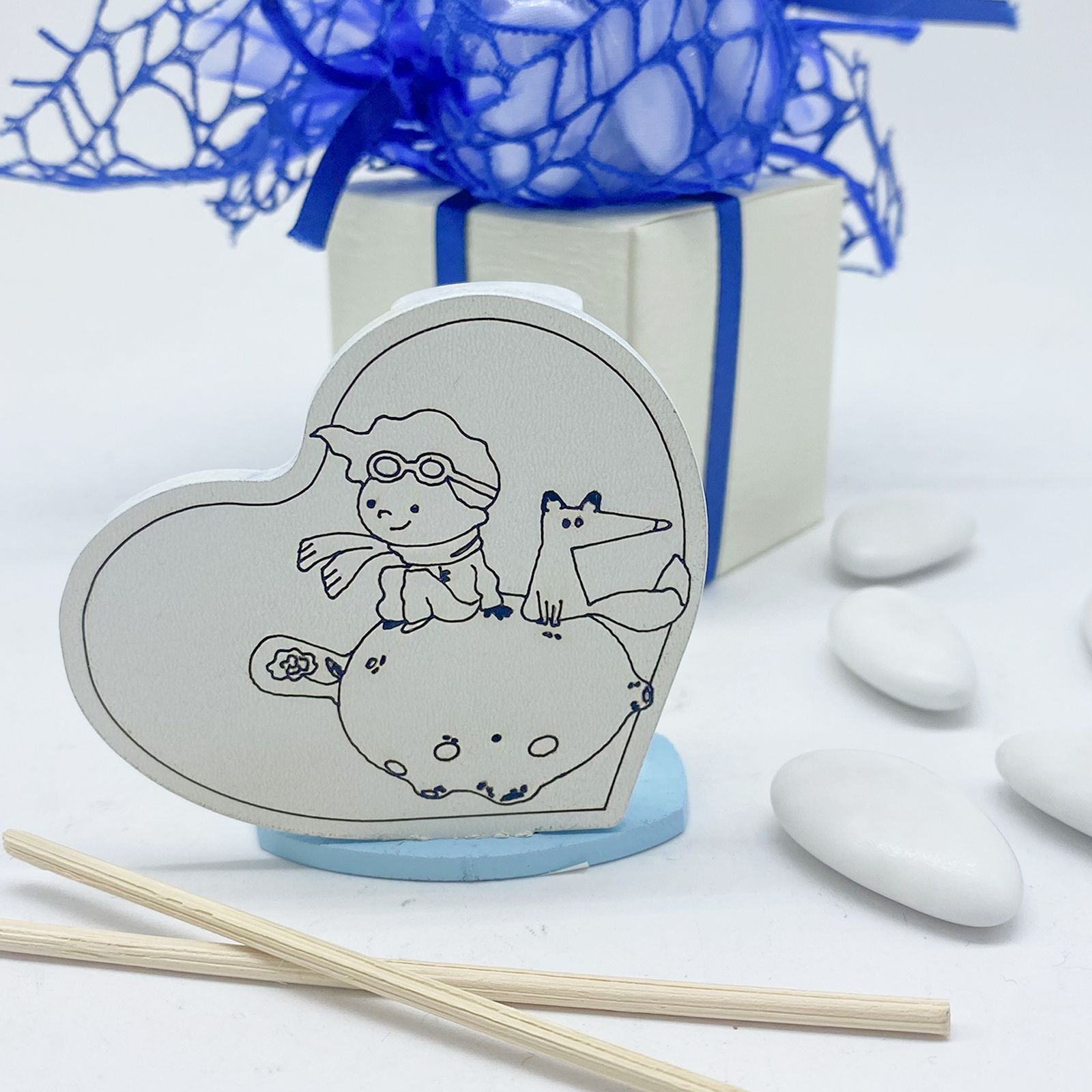 Trasforma il battesimo o la comunione in un evento da favola con il nostro profumatore a forma di cuore. Questa bomboniera presenta una raffigurazione incantevole del piccolo principe e della sua fedele volpe, perfetta per aggiungere un tocco di magia e originalità alla celebrazione.