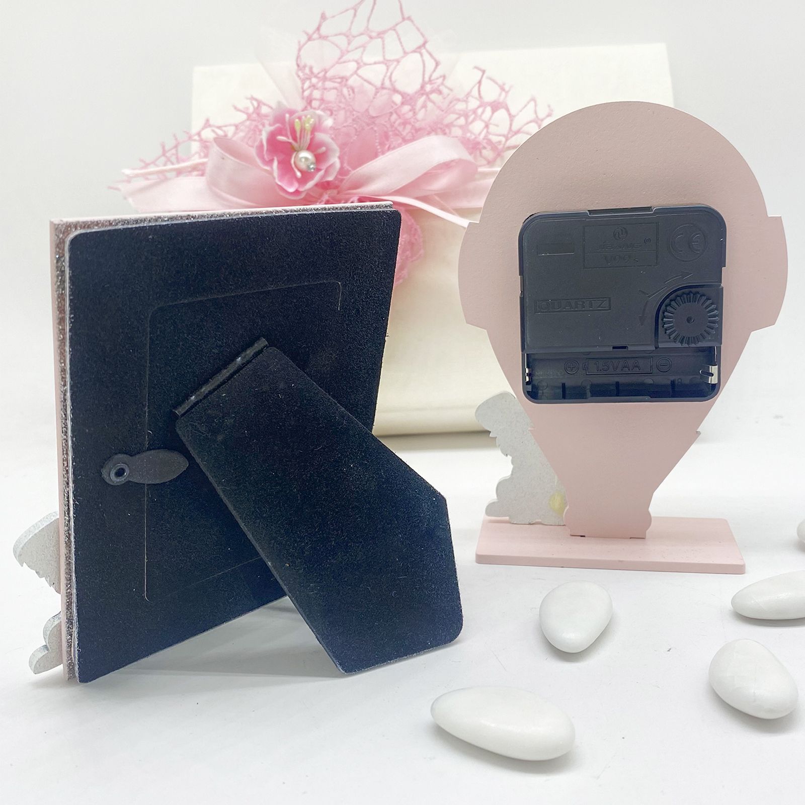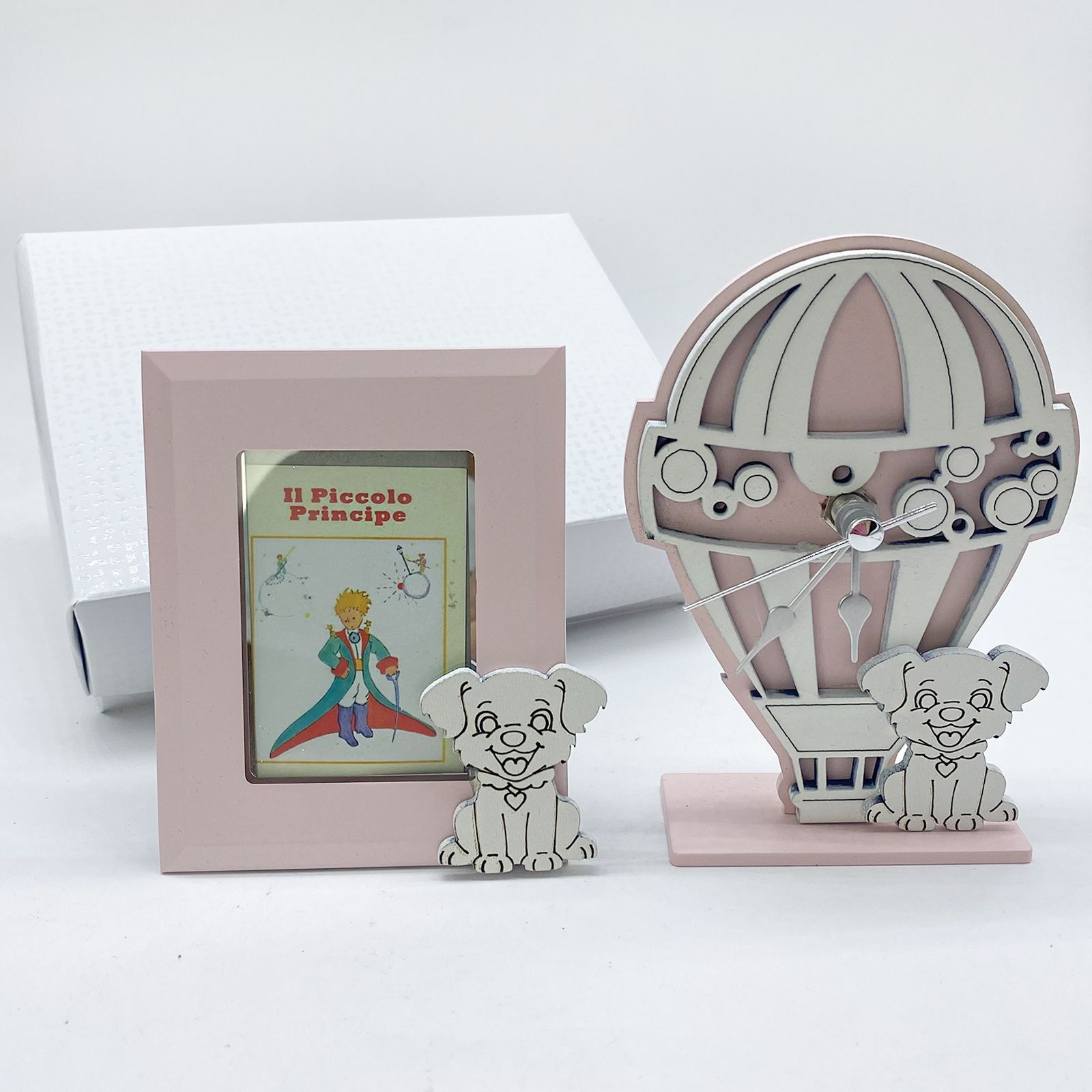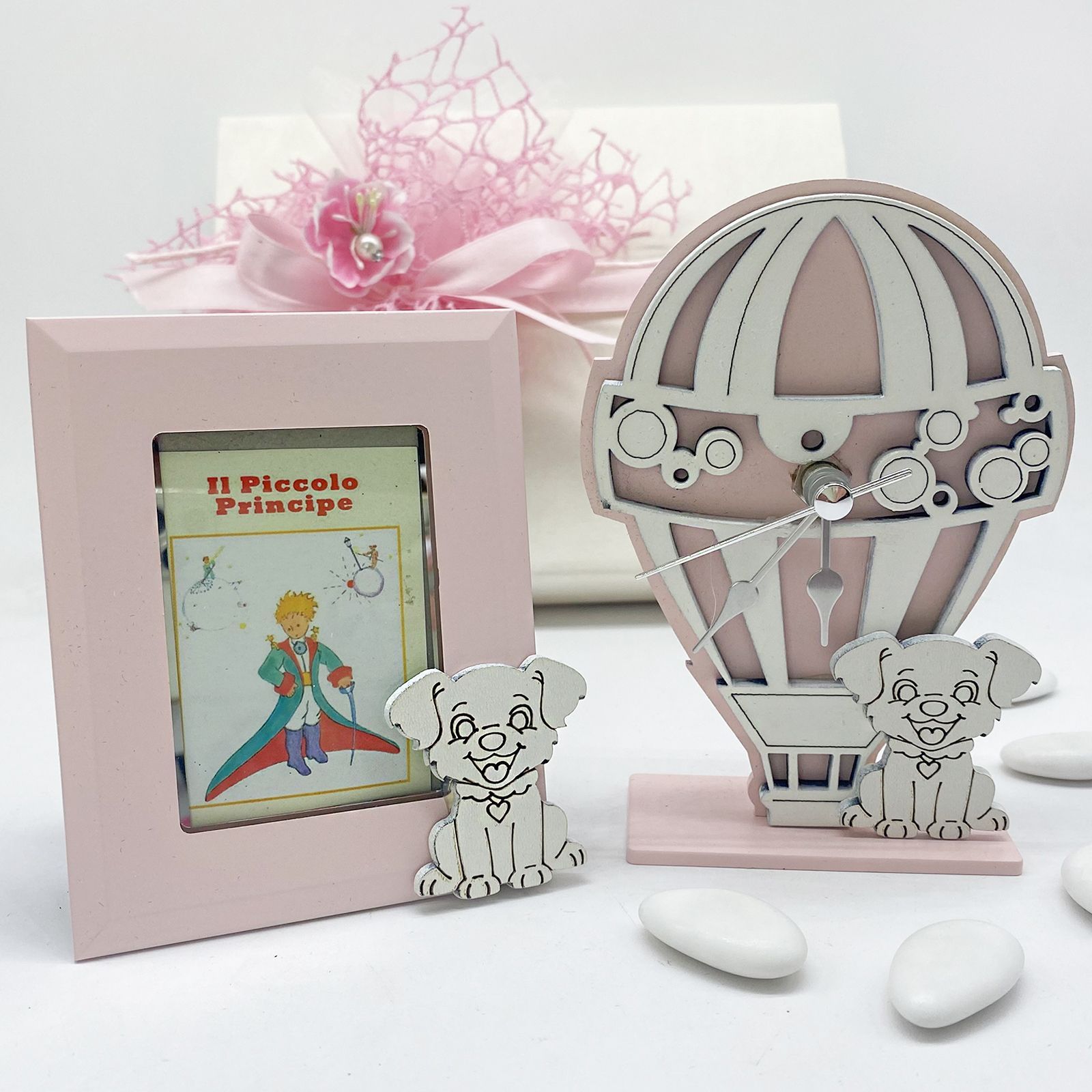 Per il battesimo della tua piccola, scegli una bomboniera che unisca eleganza e dolcezza. Questo set orologio e cornice a forma di mongolfiera, con un cagnolino alla base, è realizzato in legno e si presenta in un raffinato rosa e bianco. Perfetto per un giorno speciale.