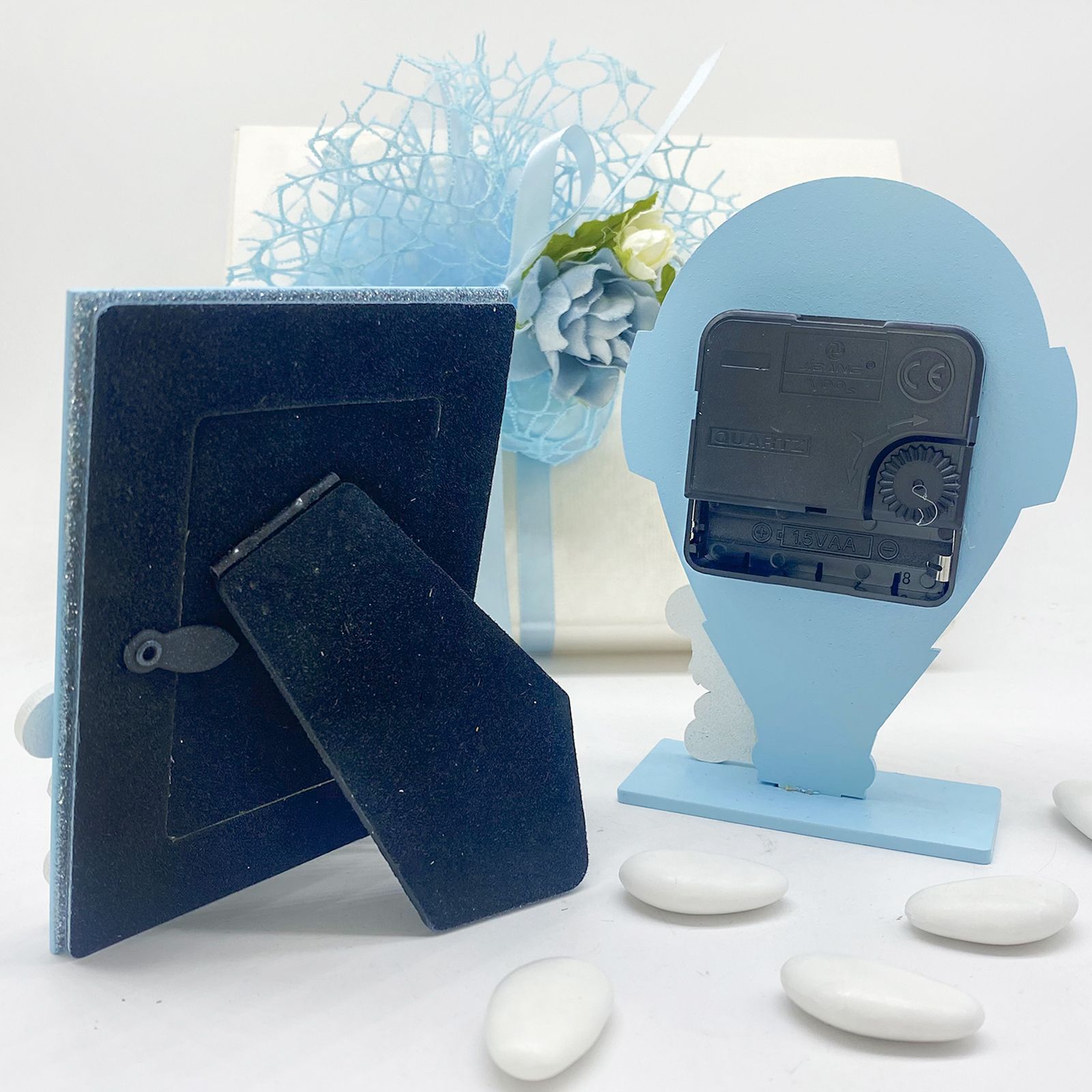 Le dimensioni dell’orologio sono 13 x 9 cm, mentre il portafoto misura 11,5 x 8,5 cm con spazio per una foto di 7,5 x 5 cm. I dettagli curati e i colori celeste e bianco rendono questo set una scelta particolarmente delicata e raffinata.
