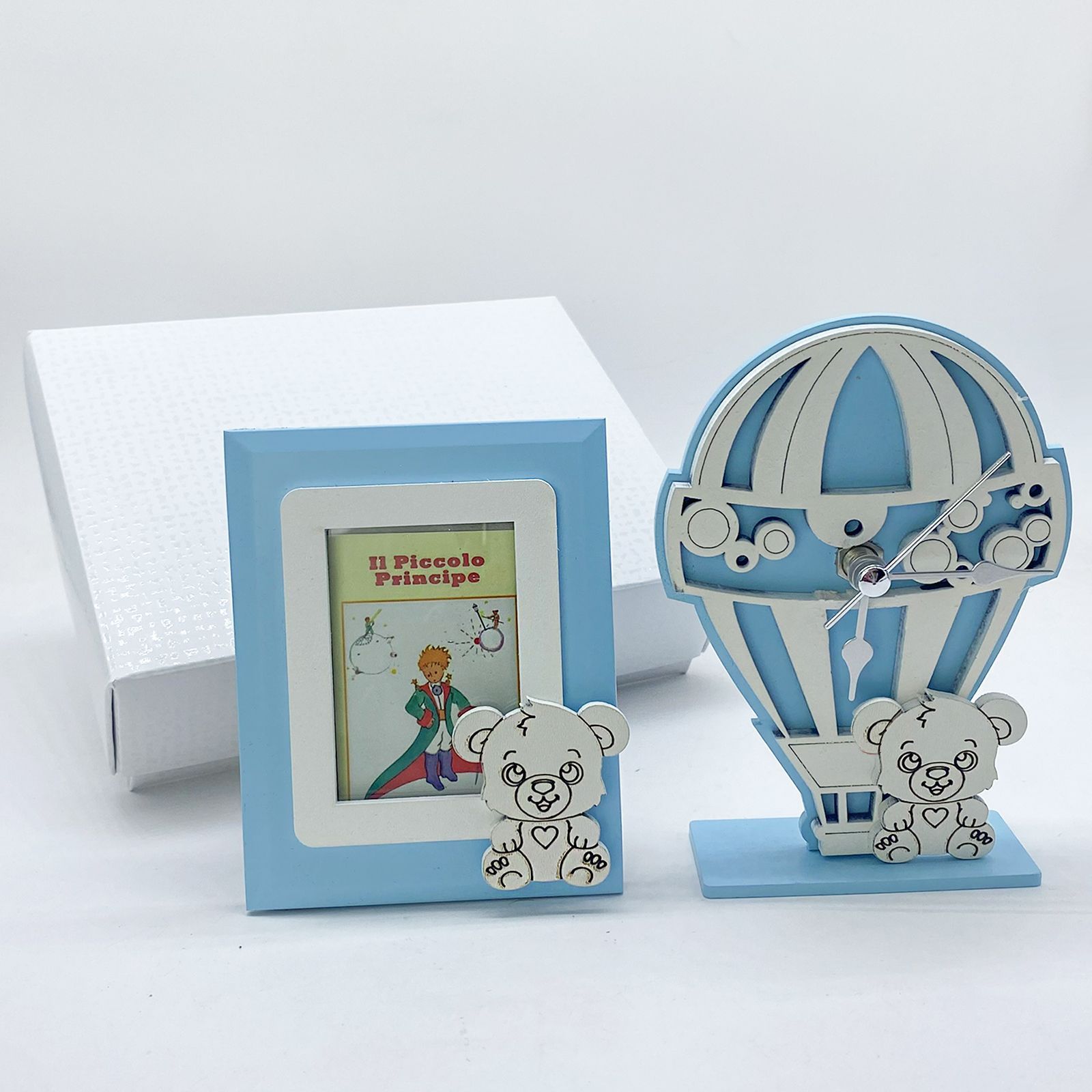 Un set unico e originale per celebrare il battesimo del tuo bimbo. Questo raffinato set in legno comprende un orologio a forma di mongolfiera con un dolce orsetto e un elegante portafoto, perfetto per lasciare un ricordo speciale agli invitati.