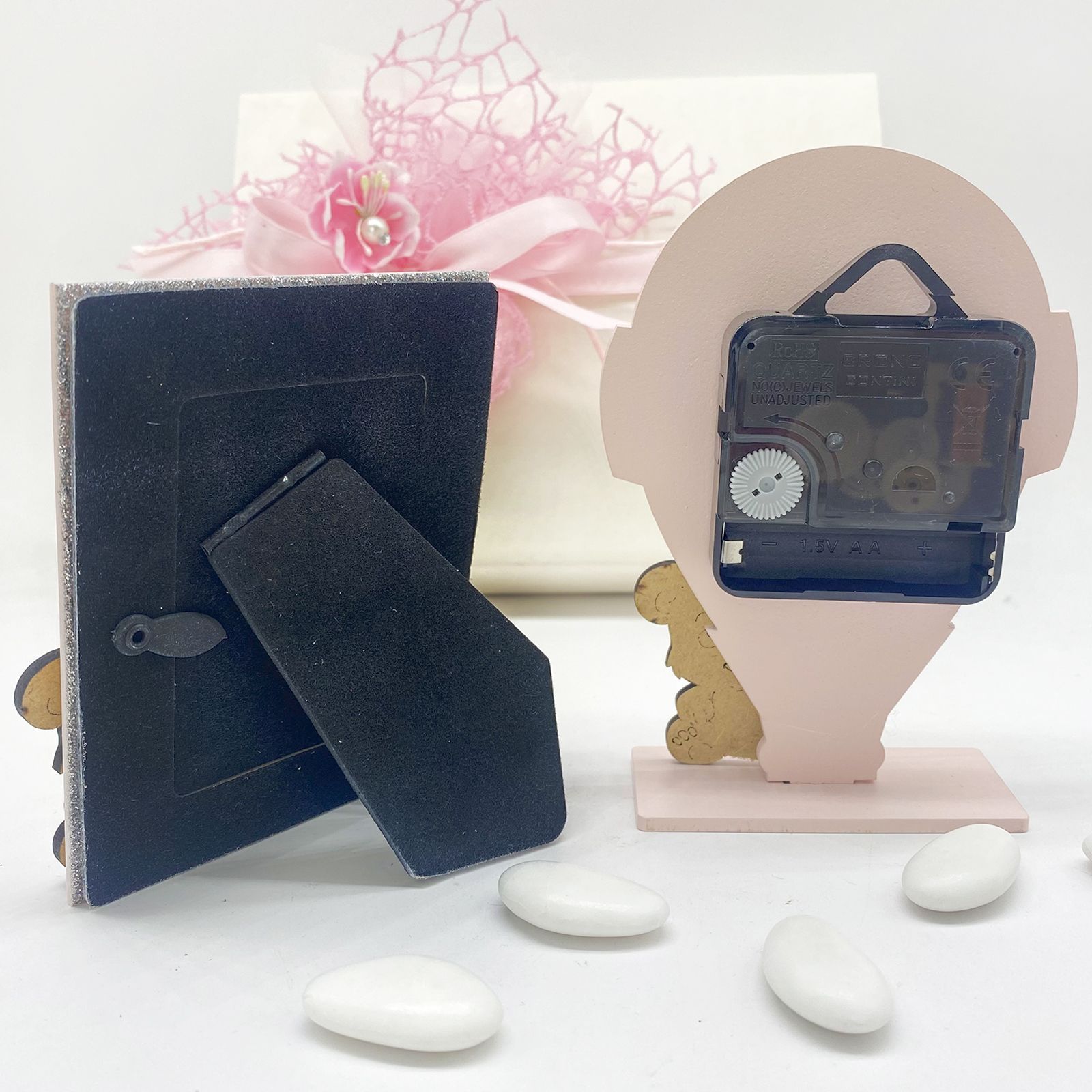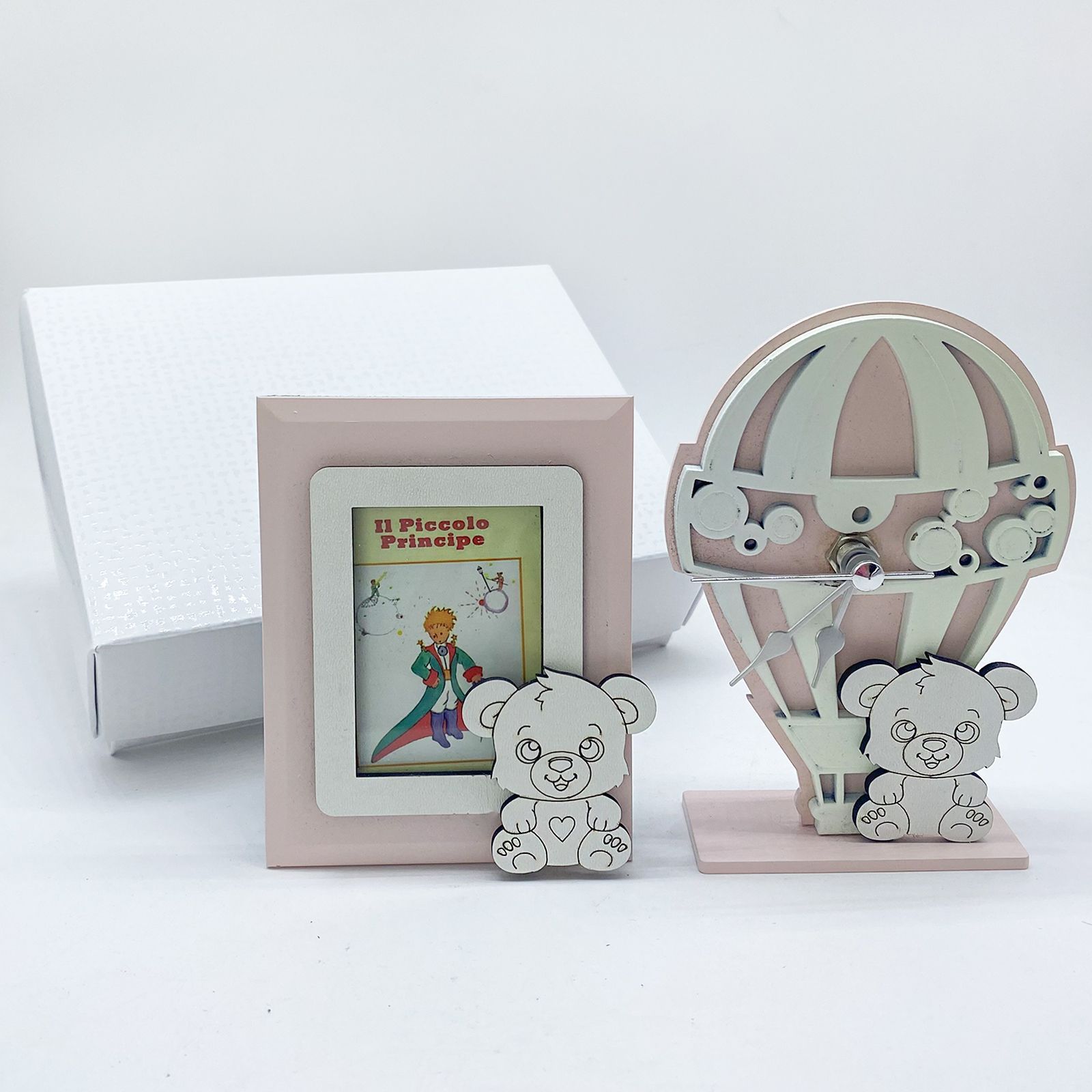 Stai cercando una bomboniera che unisca eleganza e dolcezza? Questo set orologio a forma di mongolfiera, con un tenero orsetto alla base, e il portafoto coordinato sono la scelta perfetta. Realizzati in legno rosa e bianco, sono ideali per un battesimo speciale.