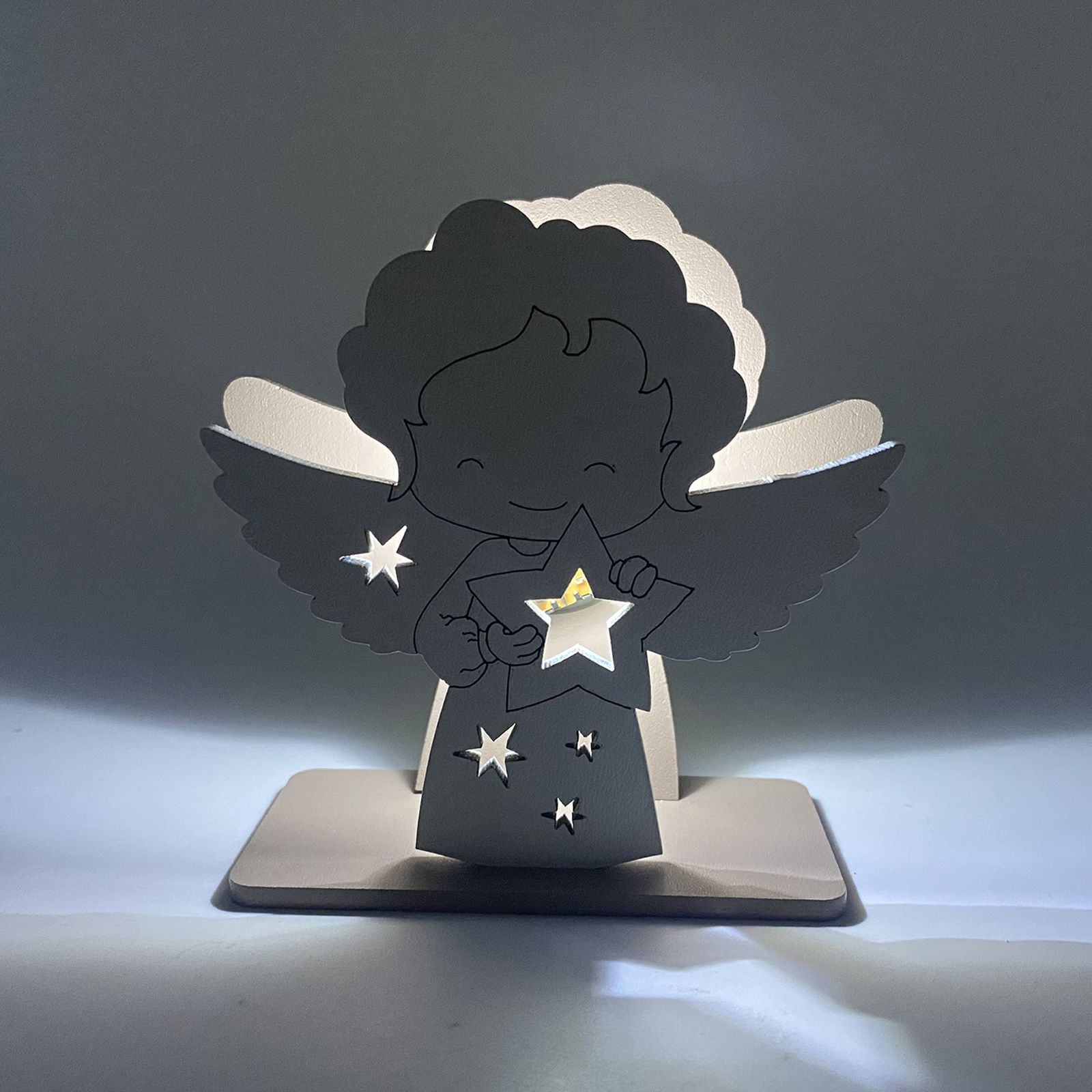 La lampada rappresenta un angioletto che tiene tra le mani una stella traforata, da cui emana una luce calda e accogliente. Le stelline traforate sulle ali e sul vestito aggiungono un tocco di magia.