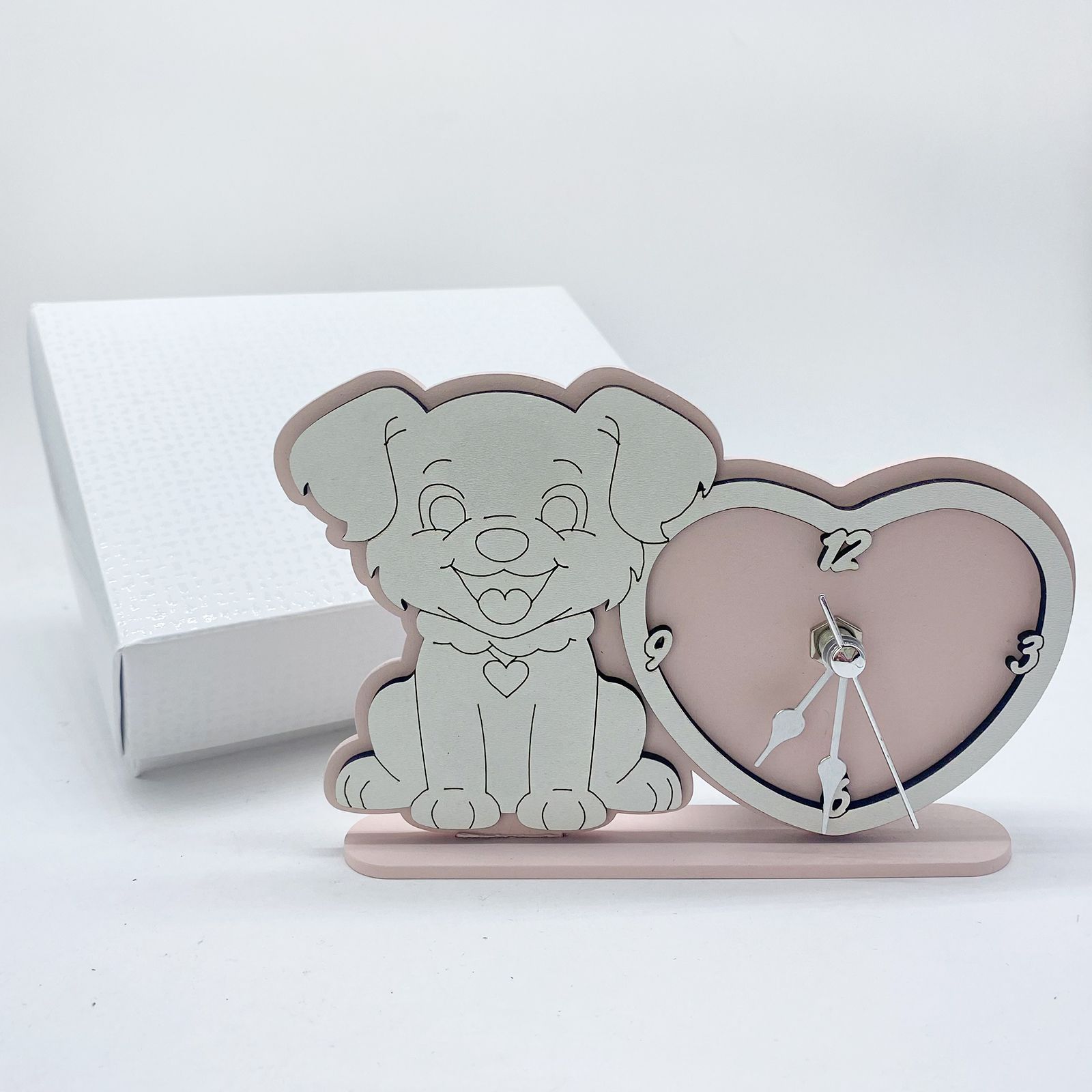 Per un battesimo indimenticabile, scegli l'orologio a forma di cuore con cagnolino e medaglietta a cuoricino. Con dimensioni di 17 x 11 cm circa, è una bomboniera ideale per una femminuccia.