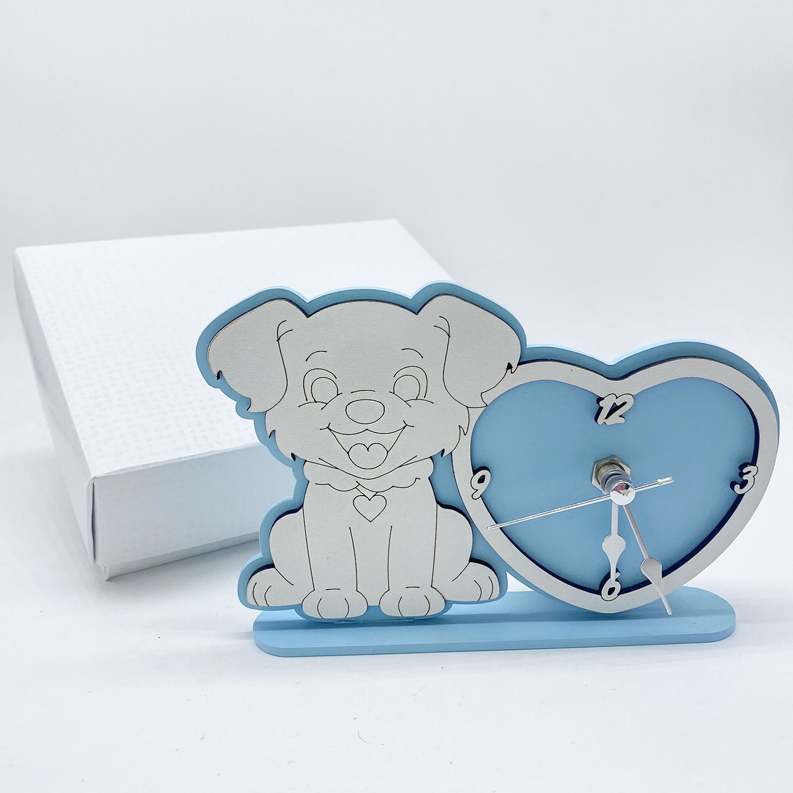 Se stai cercando una bomboniera che combini eleganza e affetto, questo orologio battesimo è la scelta ideale. Con il suo quadrante a forma di cuore e un cagnolino adorabile con una medaglietta a cuoricino, ogni dettaglio è pensato per celebrare un bimbo con stile.