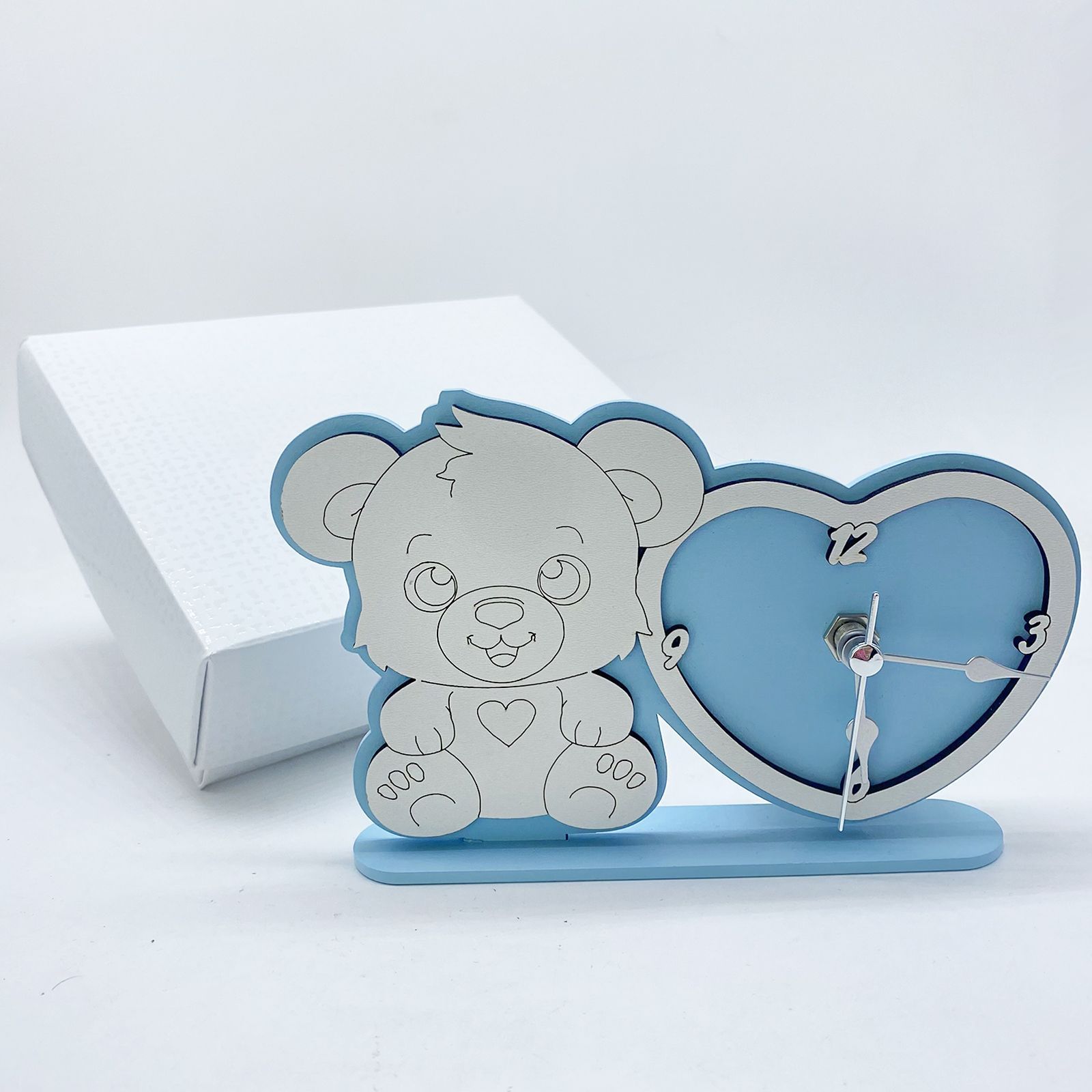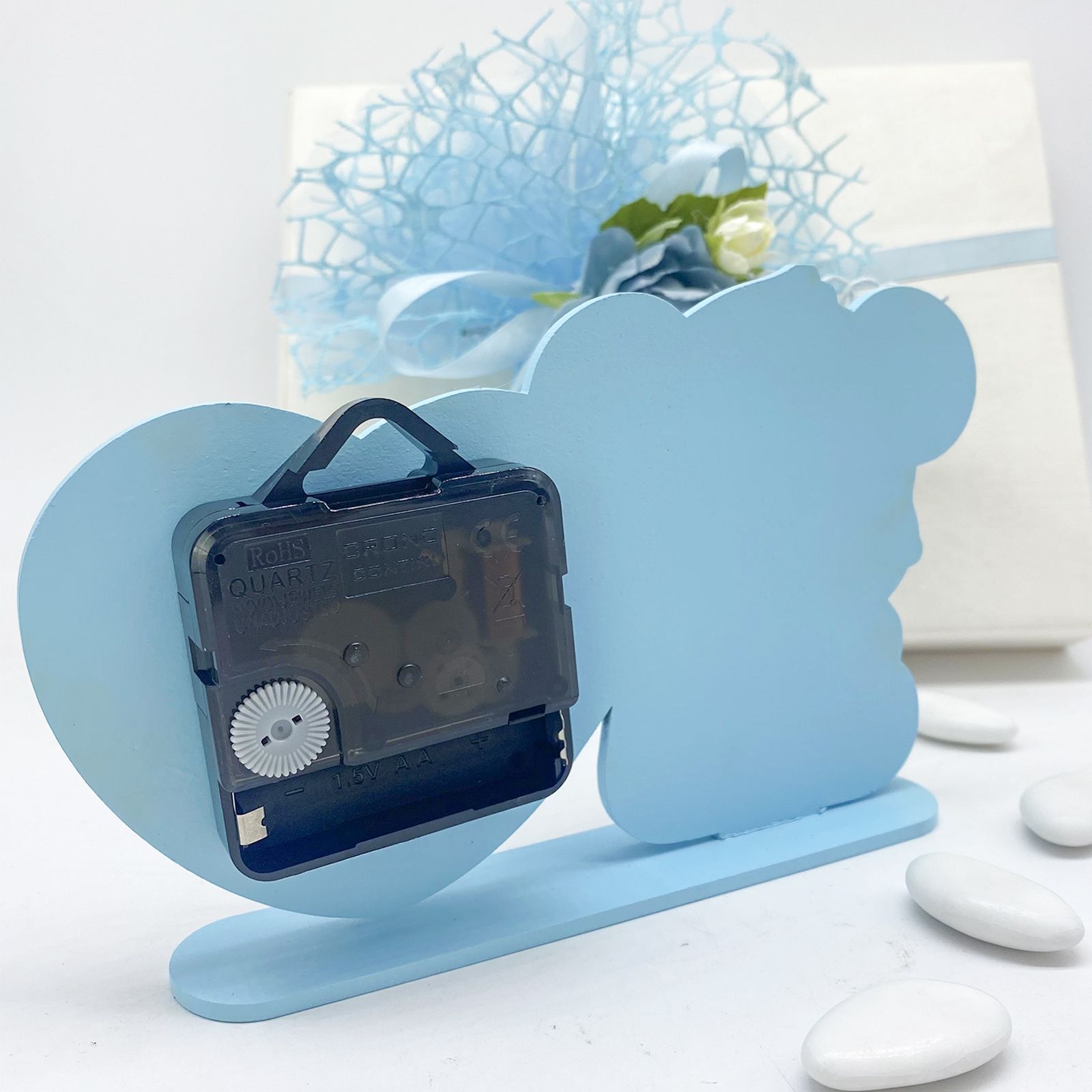 Questo orologio battesimo affascina con il suo quadrante a cuore e un tenero orsetto. Realizzato in legno celeste e bianco, è perfetto per celebrare un bimbo con eleganza.