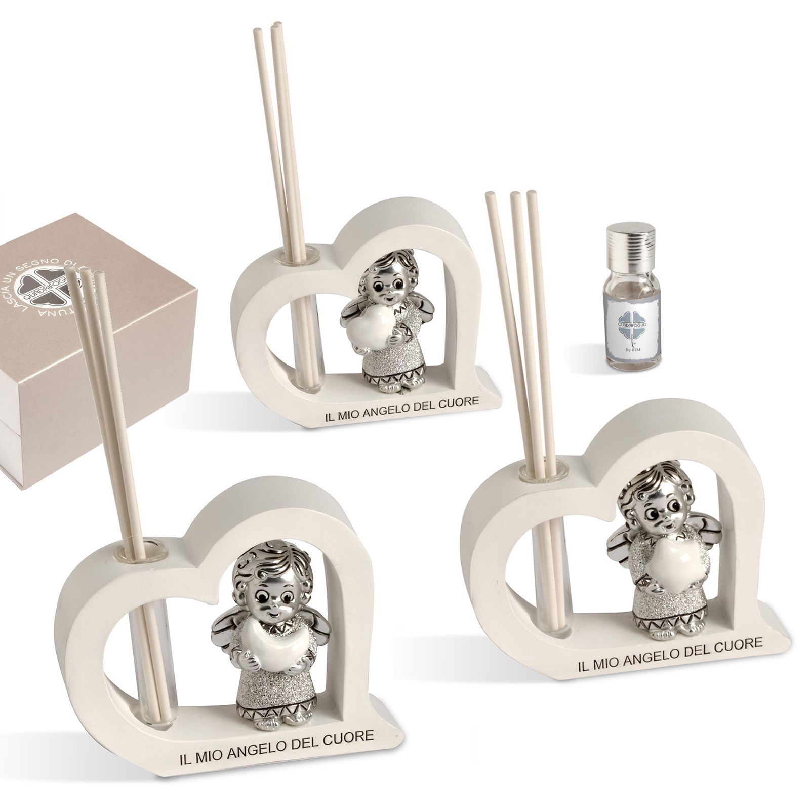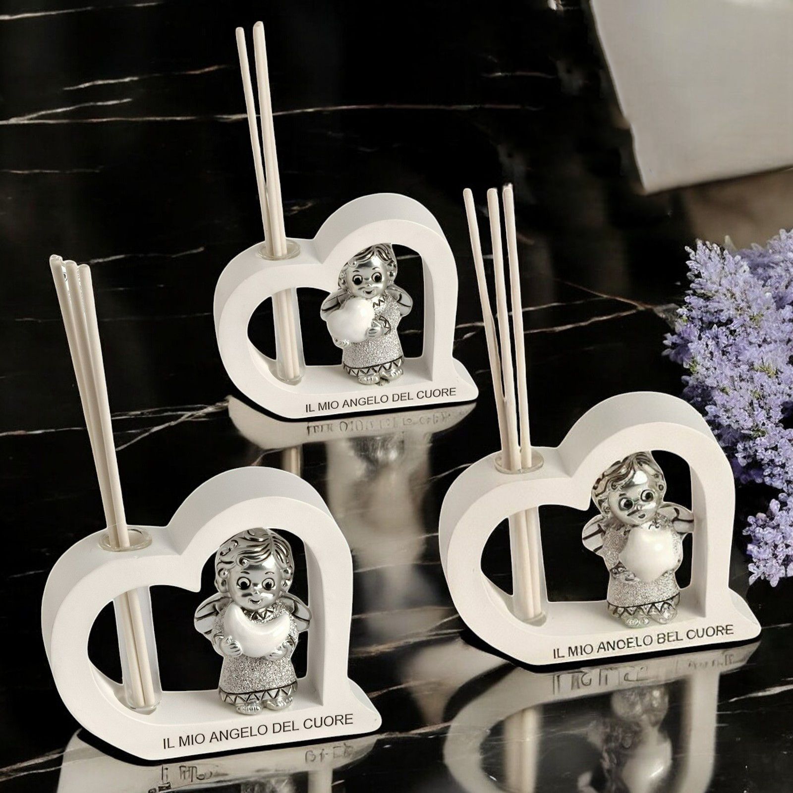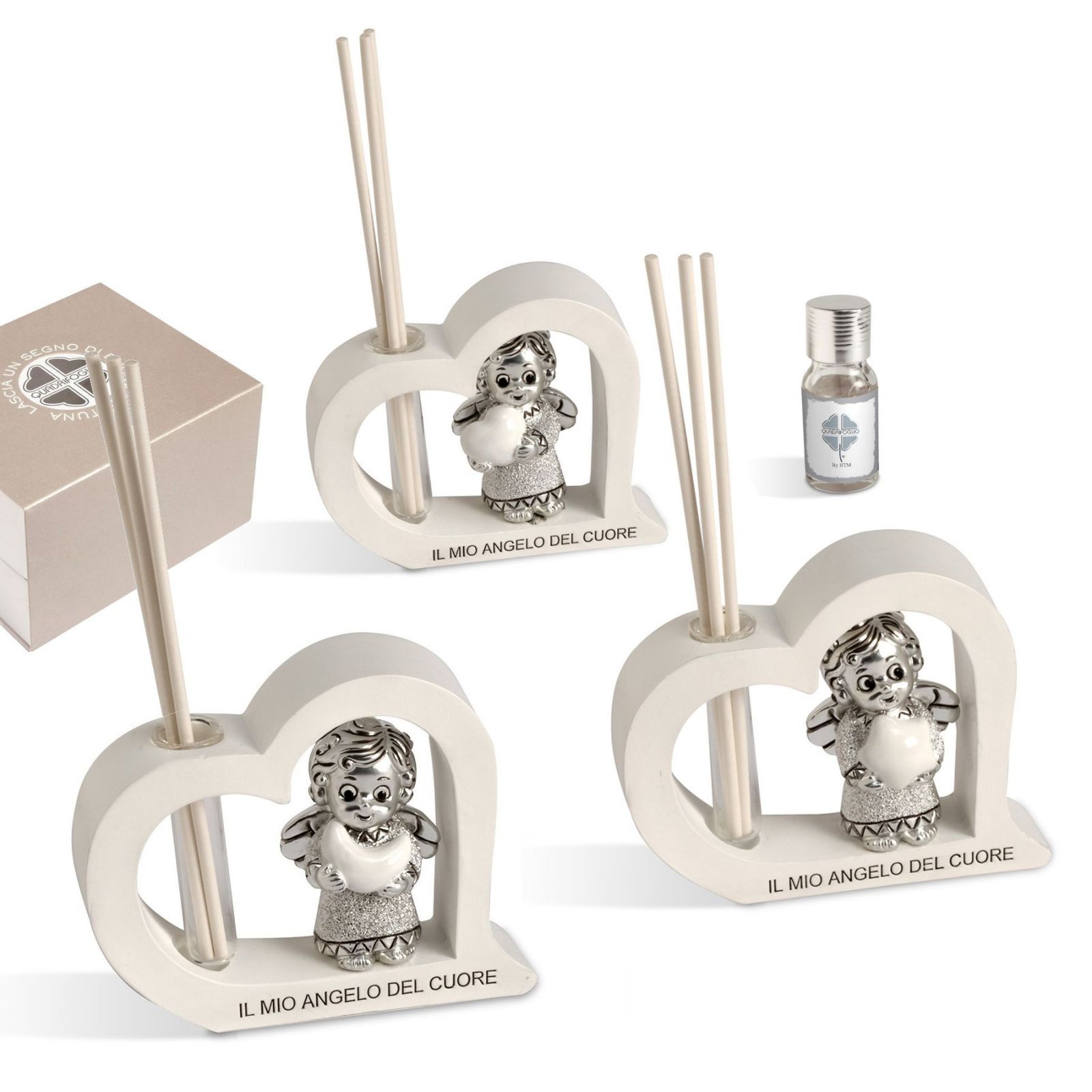 Nel giorno del battesimo o della comunione del tuo bambino, regala un tocco speciale con questo diffusore essenza a forma di cuore, completo di un tenero angioletto argentato che tiene in mano un cuore, una luna o una stella. Assortito in tre varianti, sulla base viene riportata la scritta "Il mio angelo del cuore".