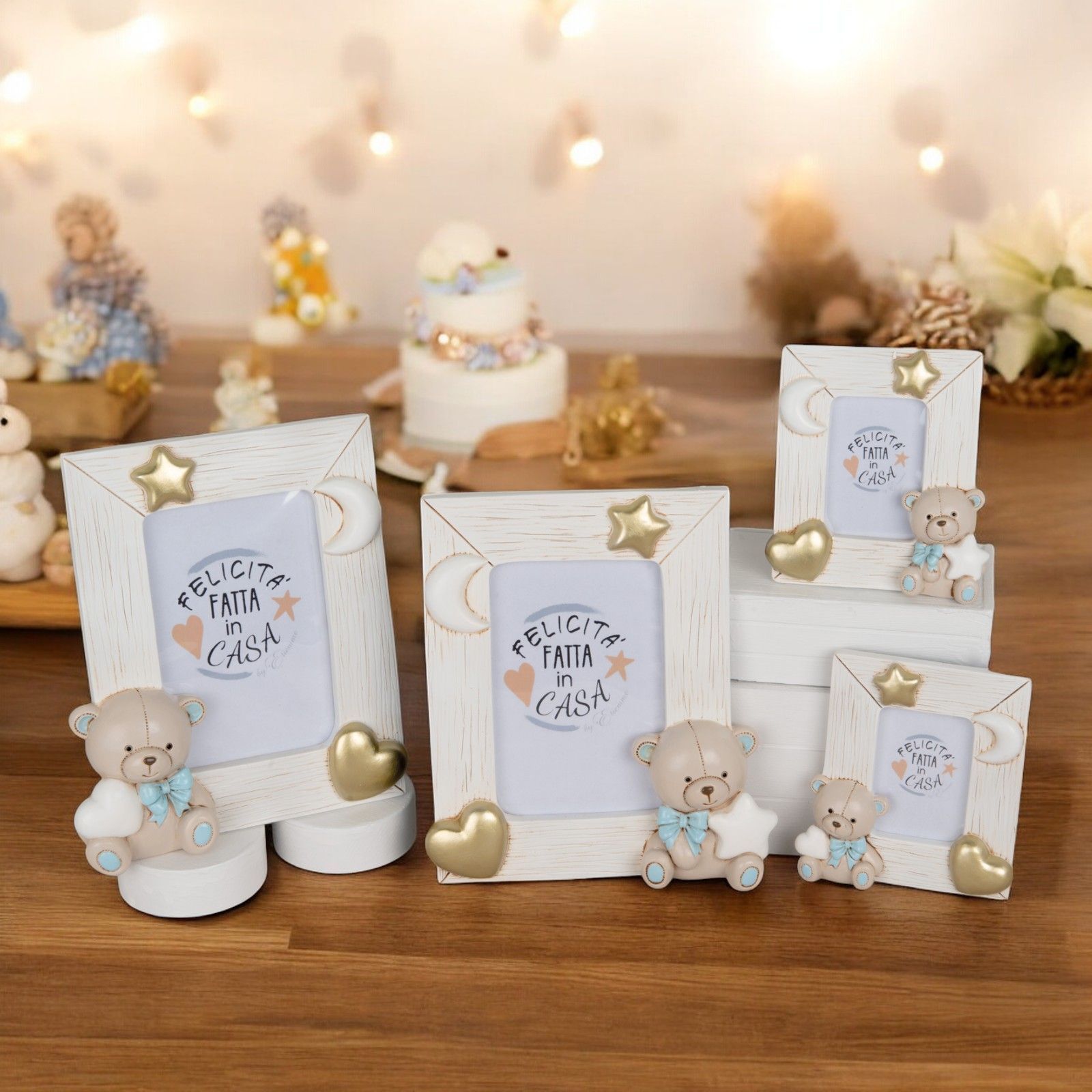 Questa deliziosa bomboniera è perfetta per celebrare momenti speciali come un battesimo o un compleanno. Il portafoto con tenero orsetto assortito con cuore e stella tra le mani è decorato con una stella e un cuore color oro, rendendolo un regalo unico e indimenticabile per i tuoi invitati.