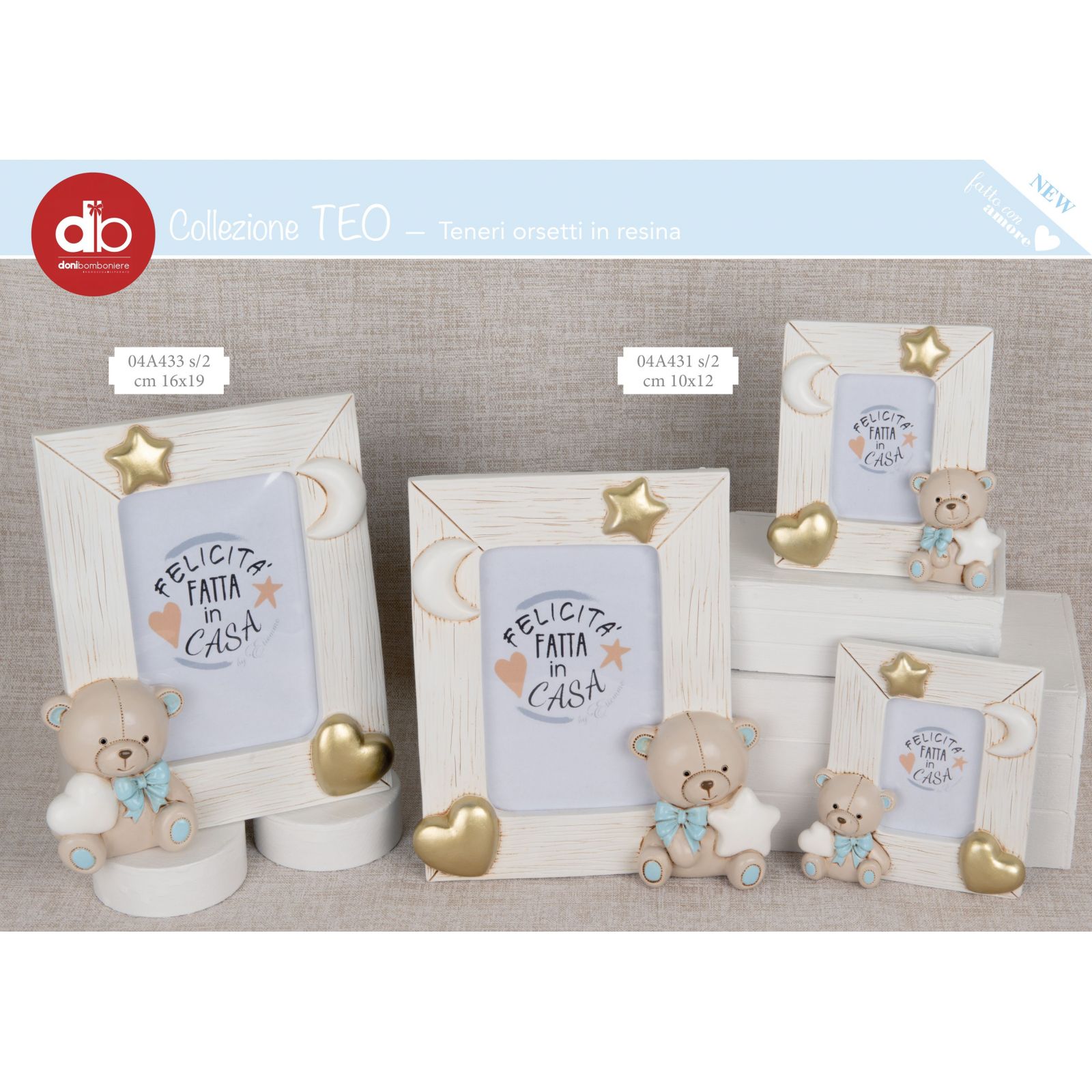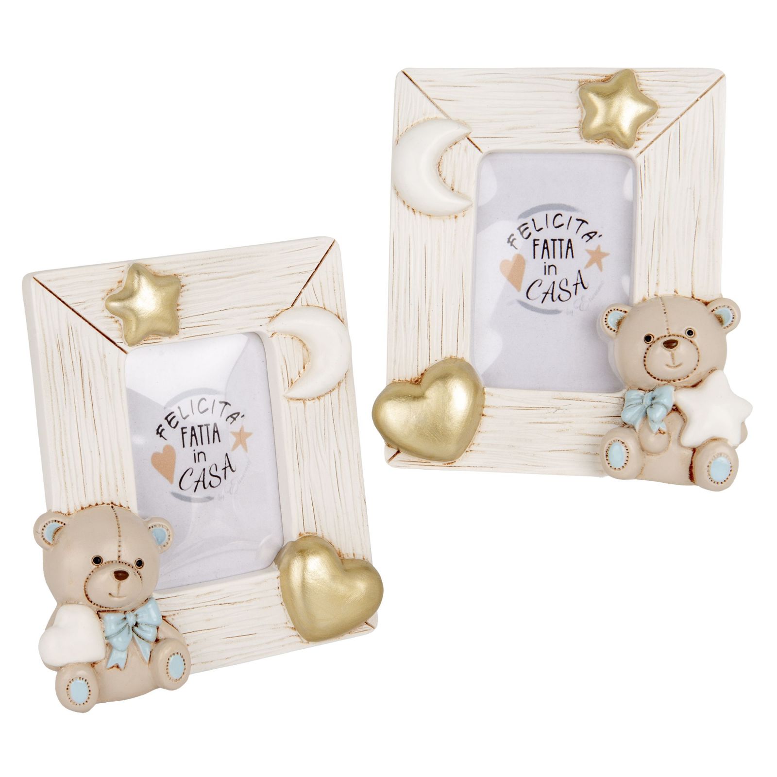 Realizzato in resina di alta qualità, questo portafoto è disponibile in due dimensioni: Standard (10 x 12 cm circa) e Grande (16 x 19 cm). Il colore panna, il fiocco celeste e i cuori dorati conferiscono un tocco elegante e raffinato a questo grazioso oggetto.
