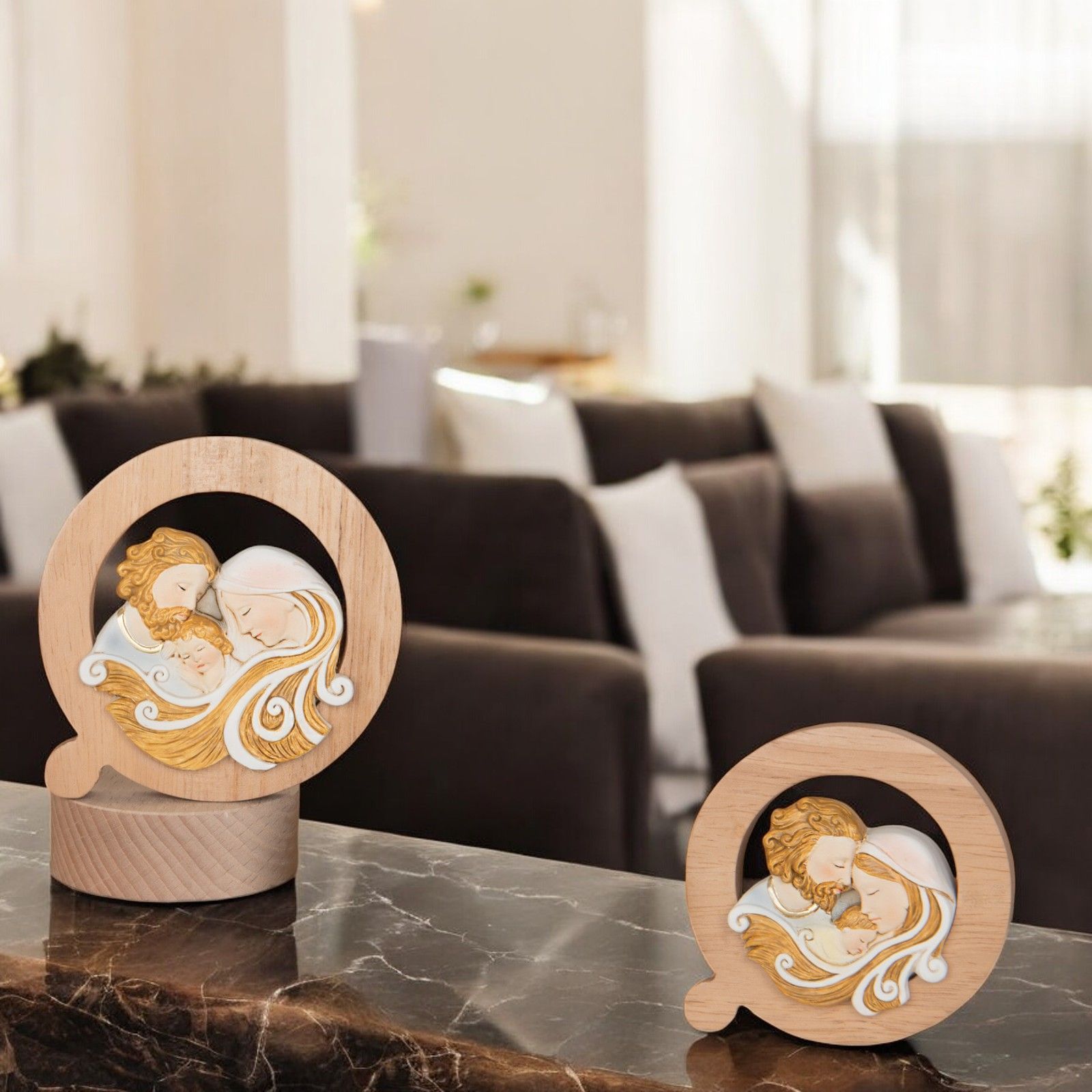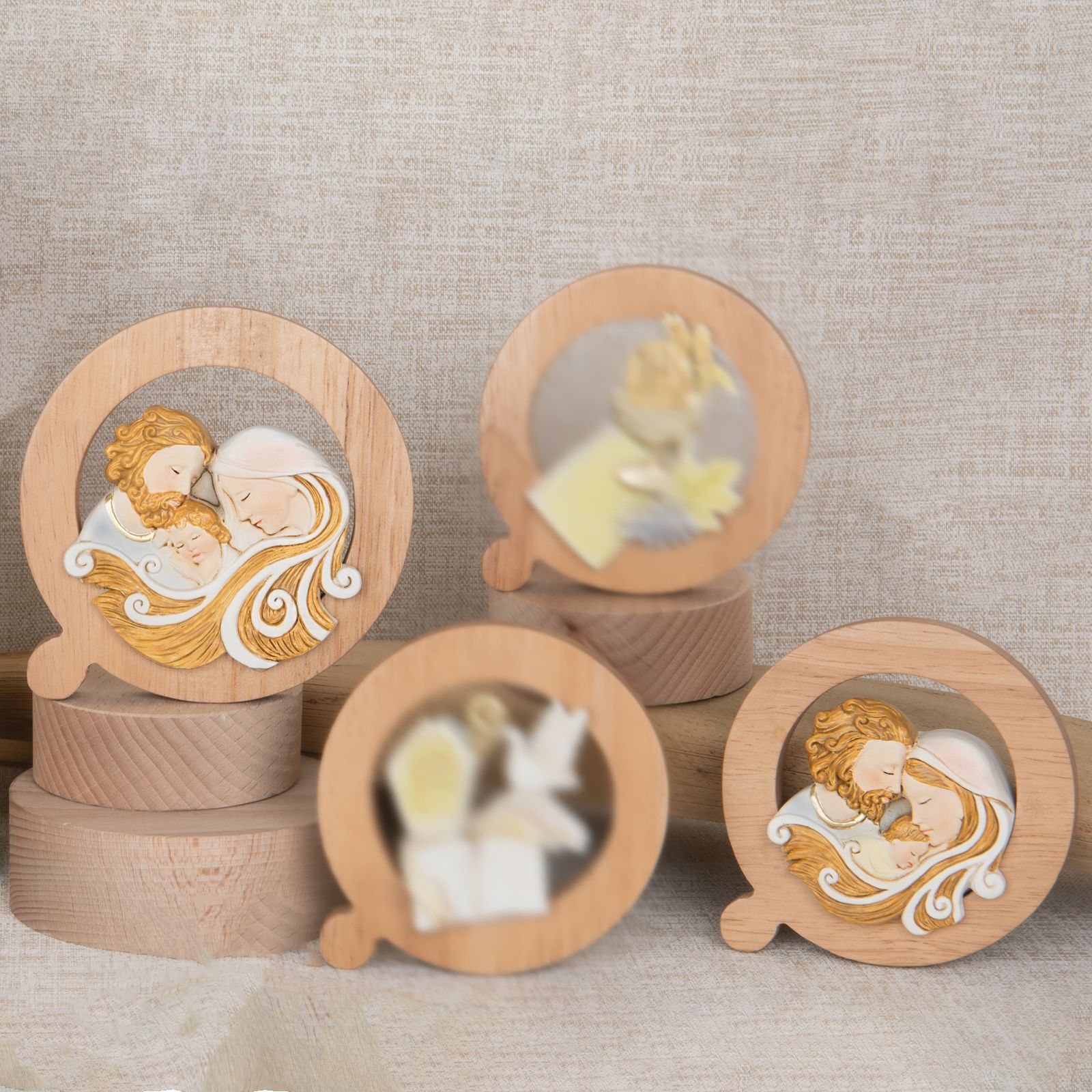 La Cornice Icona Sacra Famiglia è un'idea perfetta per rendere speciale il tuo evento, che sia un battesimo, una comunione o una cresima. Realizzata in resina e legno, questa bomboniera è disponibile in due dimensioni: Standard: dm. 8,5 cm circa ; Grande: dm. 10 cm circa, entrambe caratterizzate da un design delicato e raffinato.