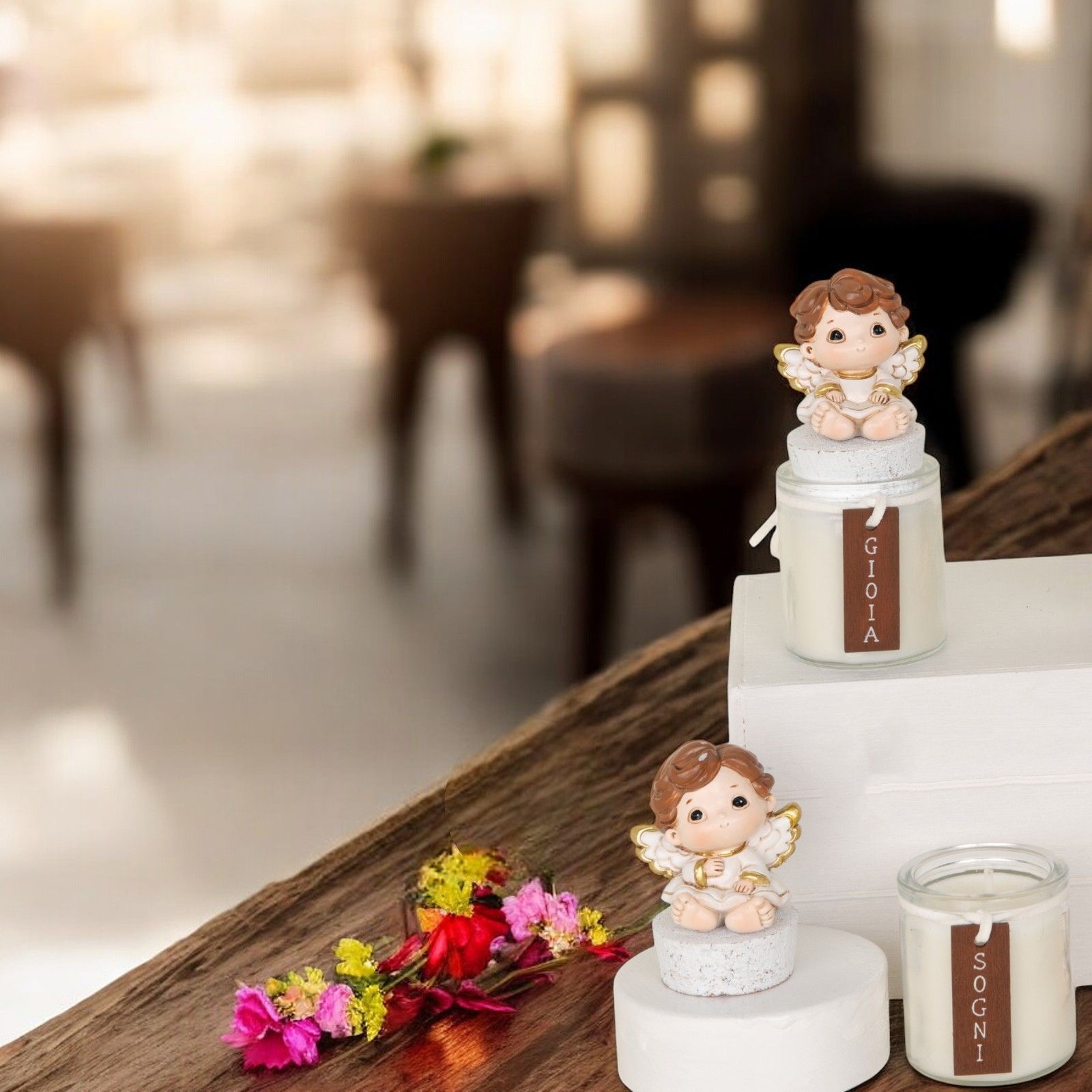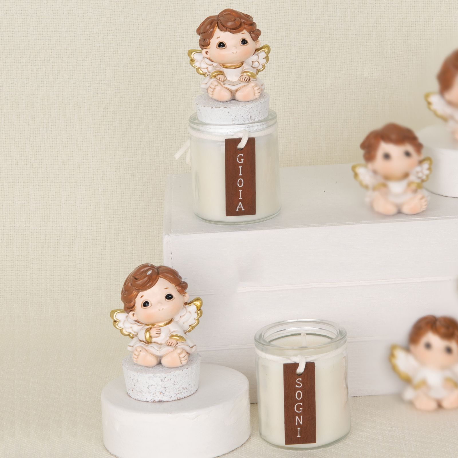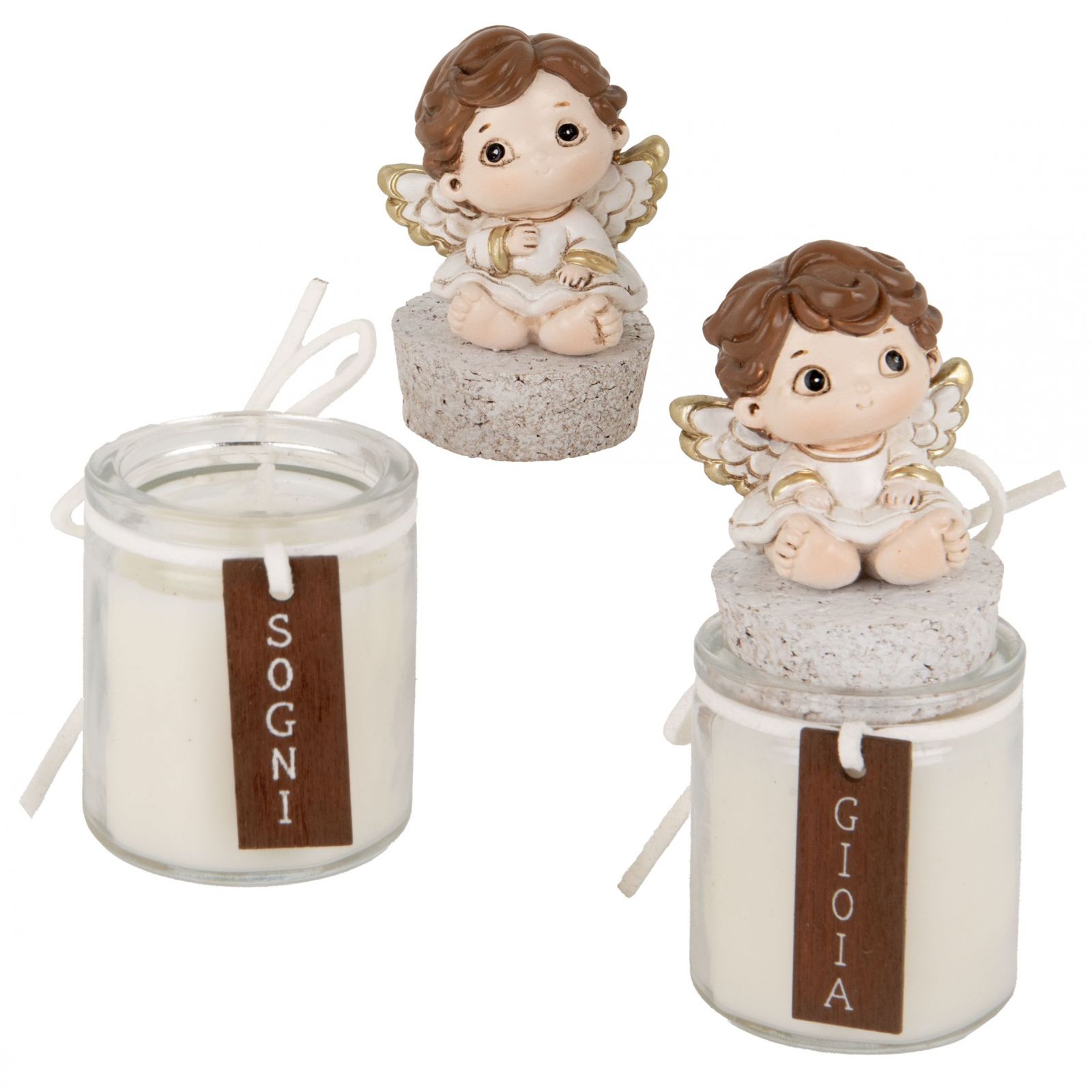 Elegante portacandela con candela, realizzato in resina di alta qualità, decorato con un angioletto e un fiocco panna con la scritta "gioia o sogni". Ideale come bomboniera originale per battesimi, comunioni e cresime. Assortito in due modelli.