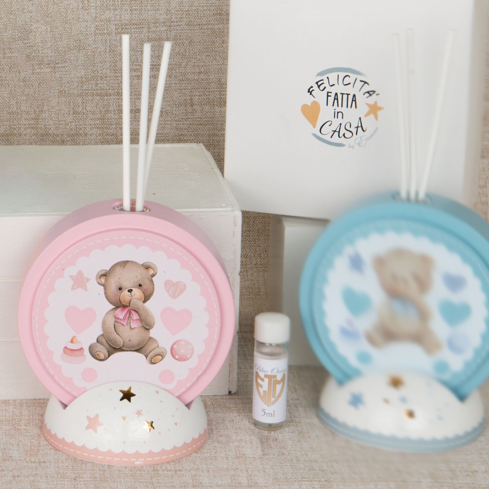 Questa bomboniera è un'idea perfetta per festeggiare il battesimo o il compleanno di una femminuccia. Realizzata in terracotta, presenta un diffusore di essenza circolare su una base decorata con stelline, un tenero orsacchiotto e dei cuori. Le dimensioni di questo prodotto sono di circa 11 cm di altezza, perfette per essere esposte su scaffali o tavoli.