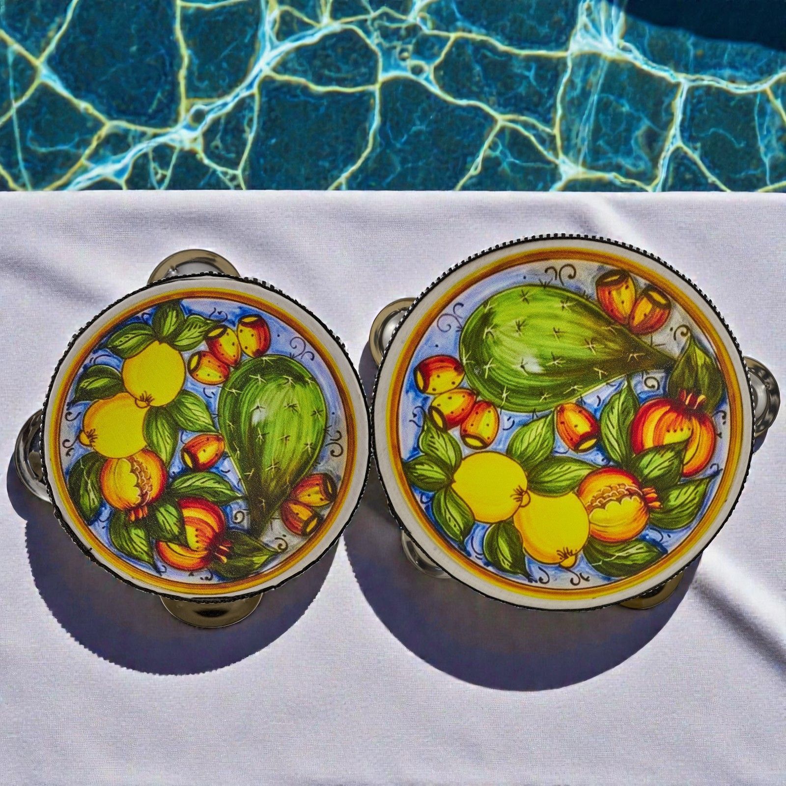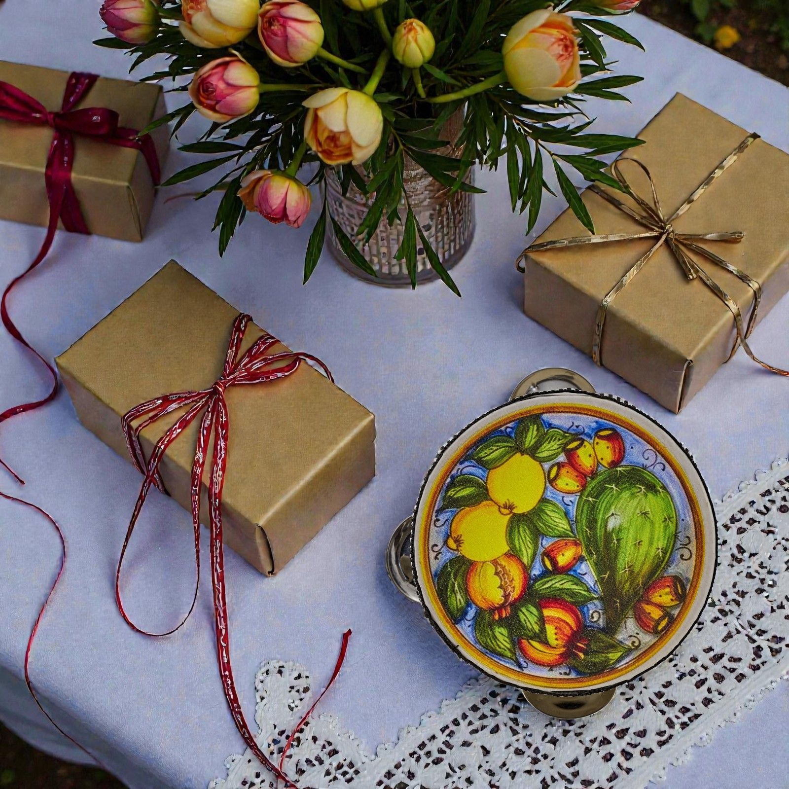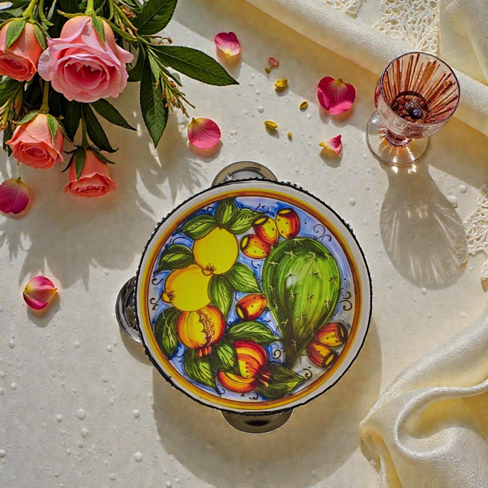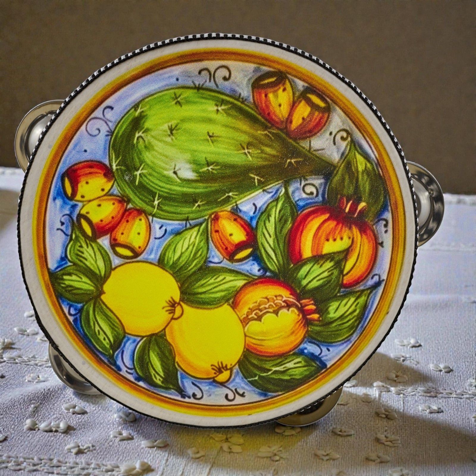 Porta un soffio di Sicilia e allegria alla tua festa con questo tamburello decorato con limoni e cactus, pensato come bomboniera originale per matrimoni, anniversari o compleanni. Regalare questa bomboniera significa donare un frammento di gioia mediterranea, un simbolo di vitalità e prosperità che racconta calore, tradizione e buon augurio agli ospiti.