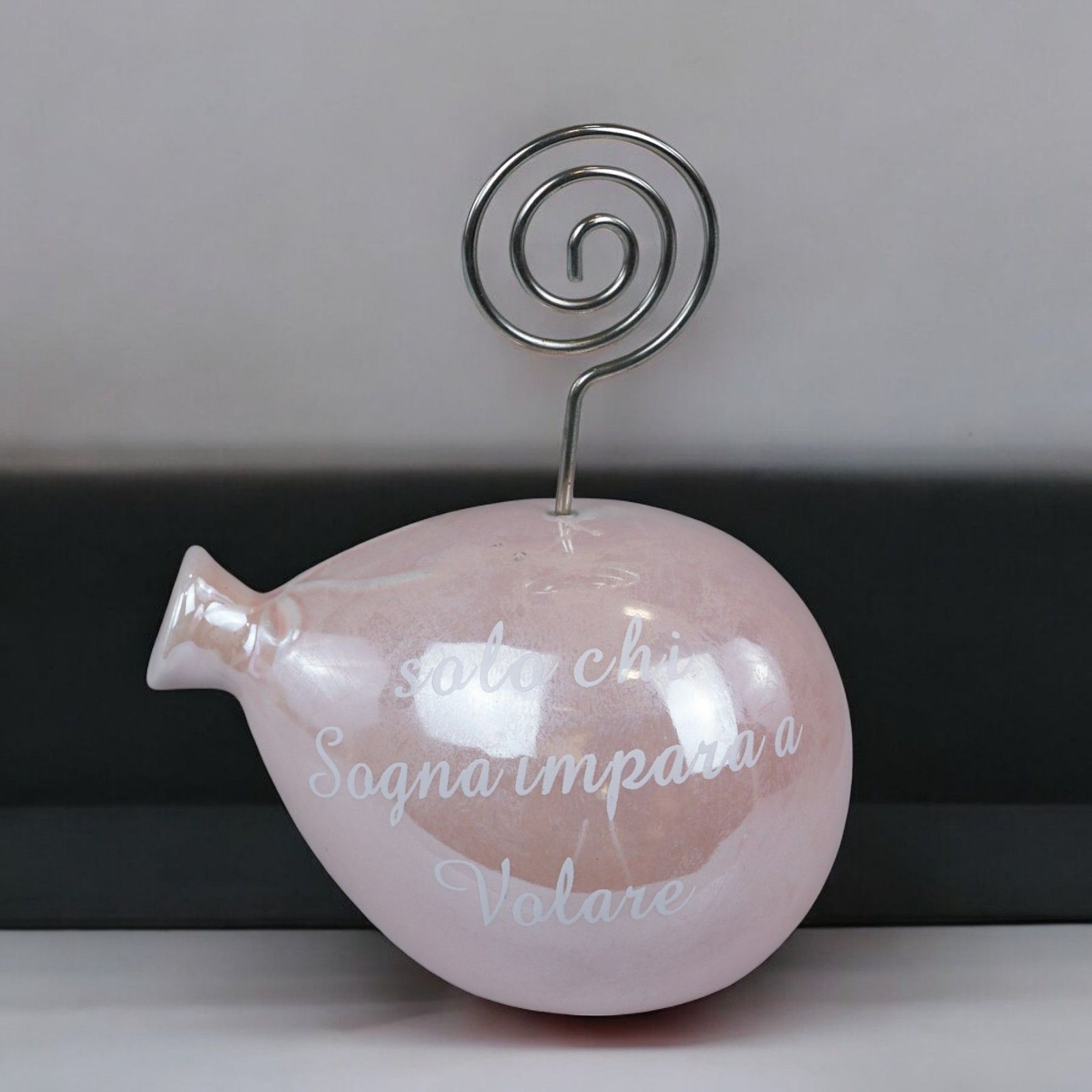 Realizzato in ceramica rosa perlato, questo memoclip a forma di palloncino è un diffusore di emozioni e ricordi. Con la frase incisa "Solo chi sogna impara a volare", rappresenta il desiderio di crescita e speranza per il futuro dei vostri cari.