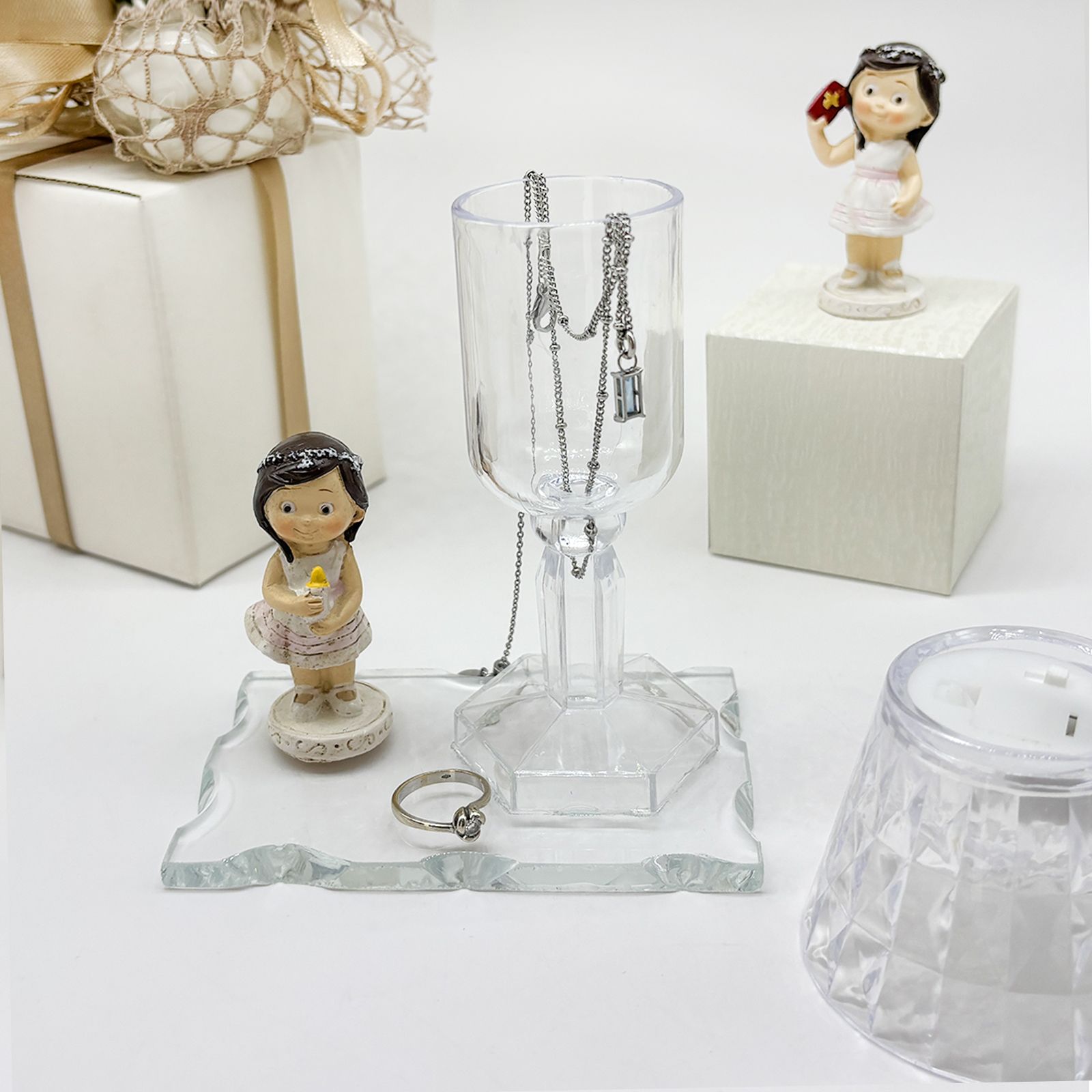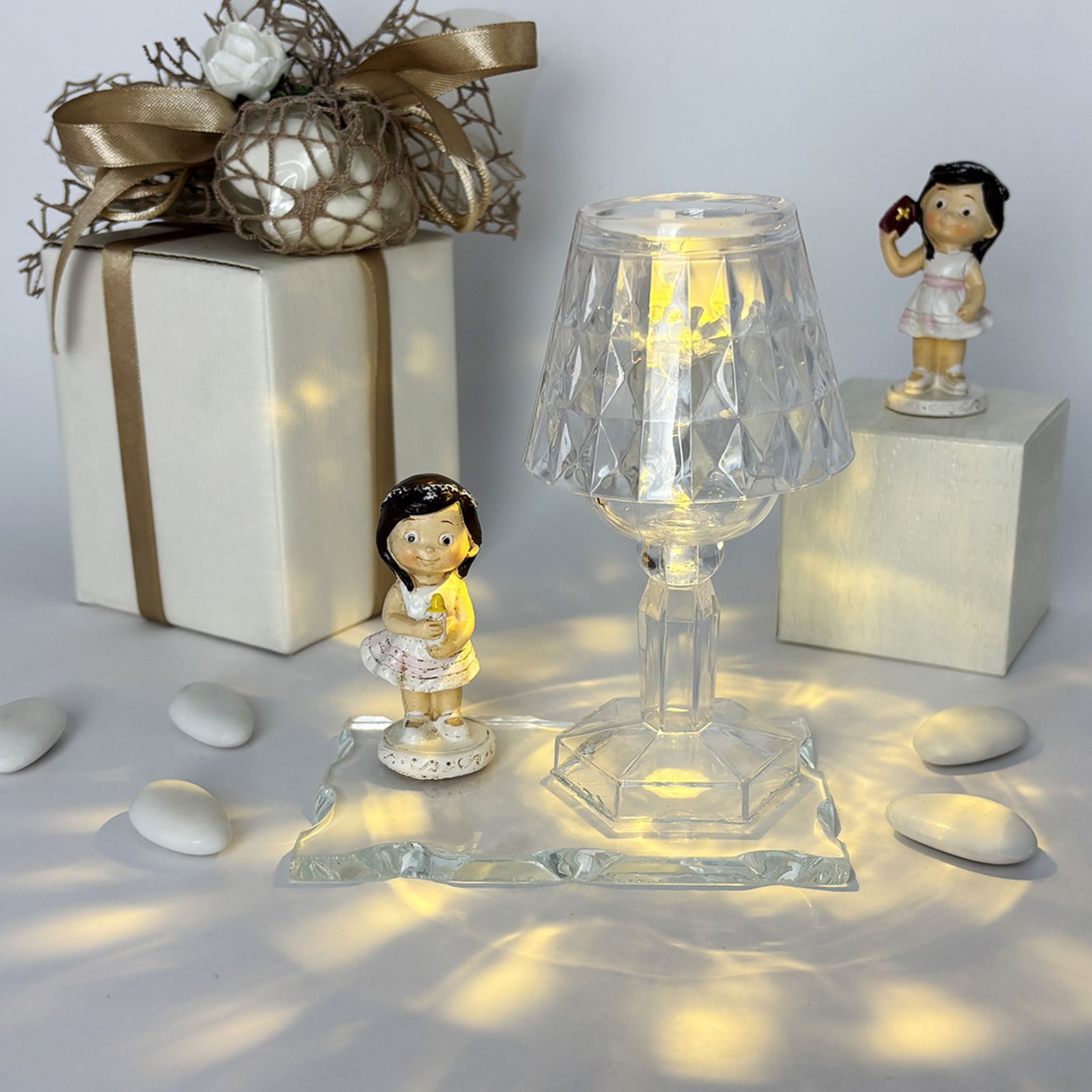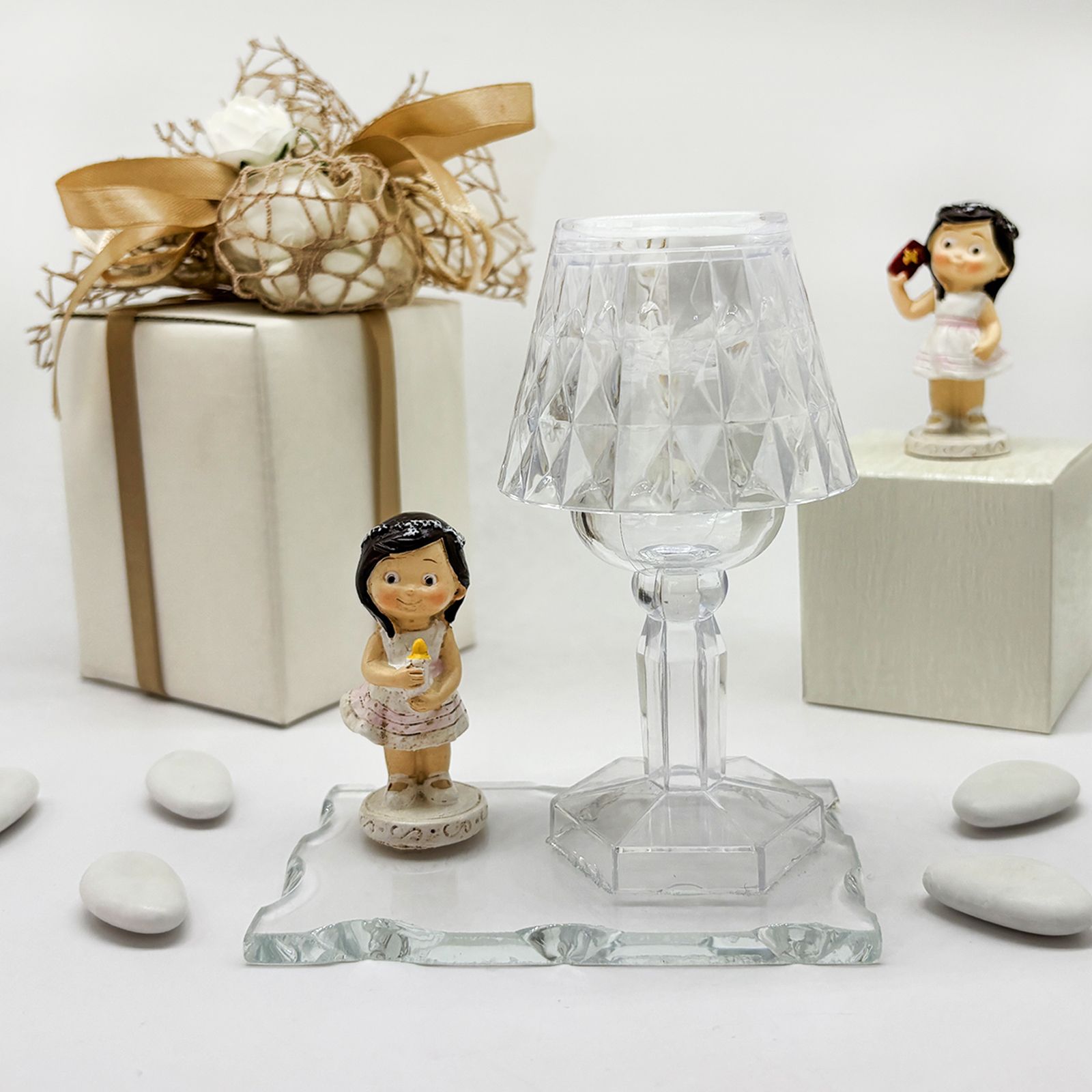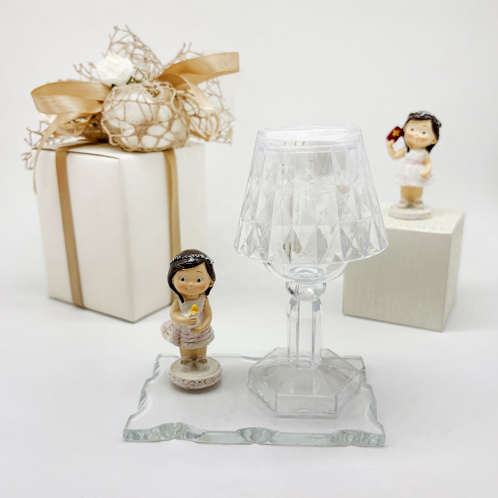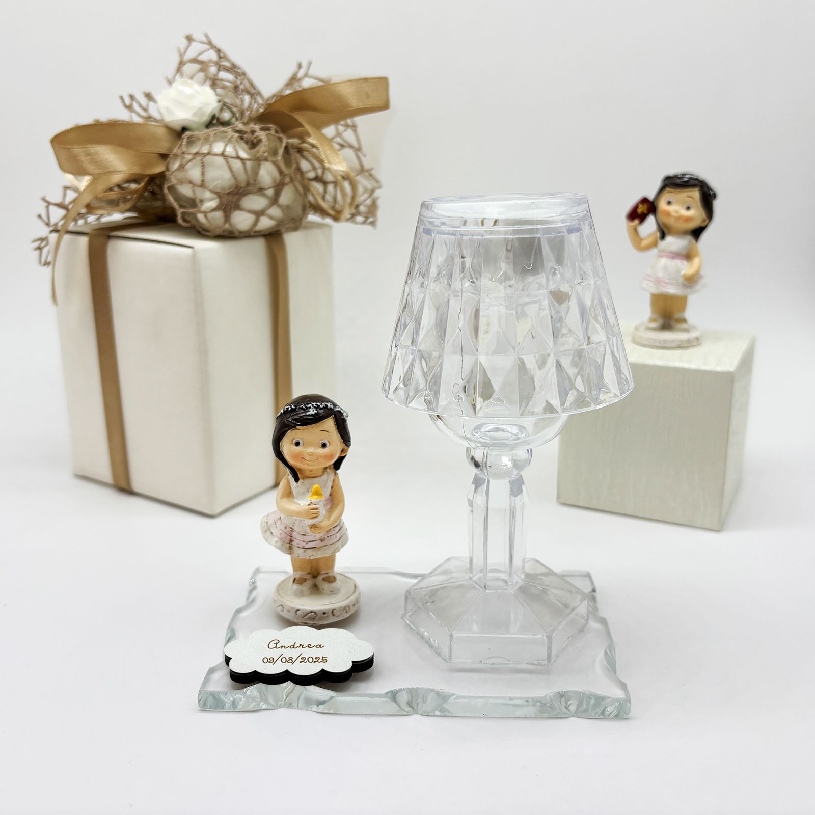 Cerchi un'idea originale e particolare per la cerimonia della Prima Comunione della tua bimba? Questo raffinato set composto da una base in vetro, un lumetto LED in plexiglass e una dolce statuina di bambina in resina è la scelta ideale per celebrare l’evento con un dono elegante e ricco di significato. Perfetto come bomboniera per comunione bambina, unisce praticità e design, regalando agli invitati un ricordo unico e prezioso.