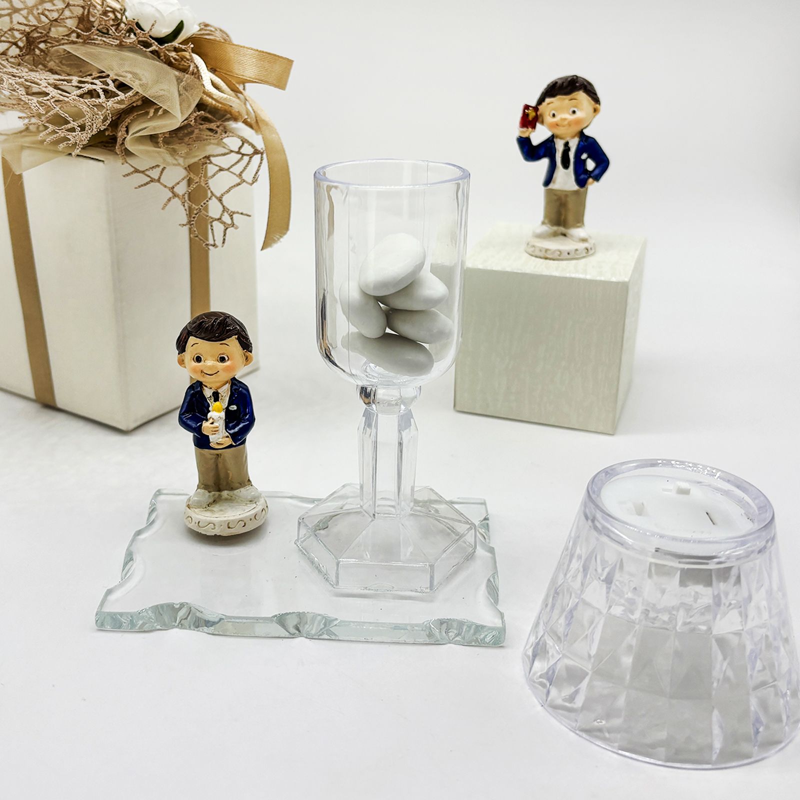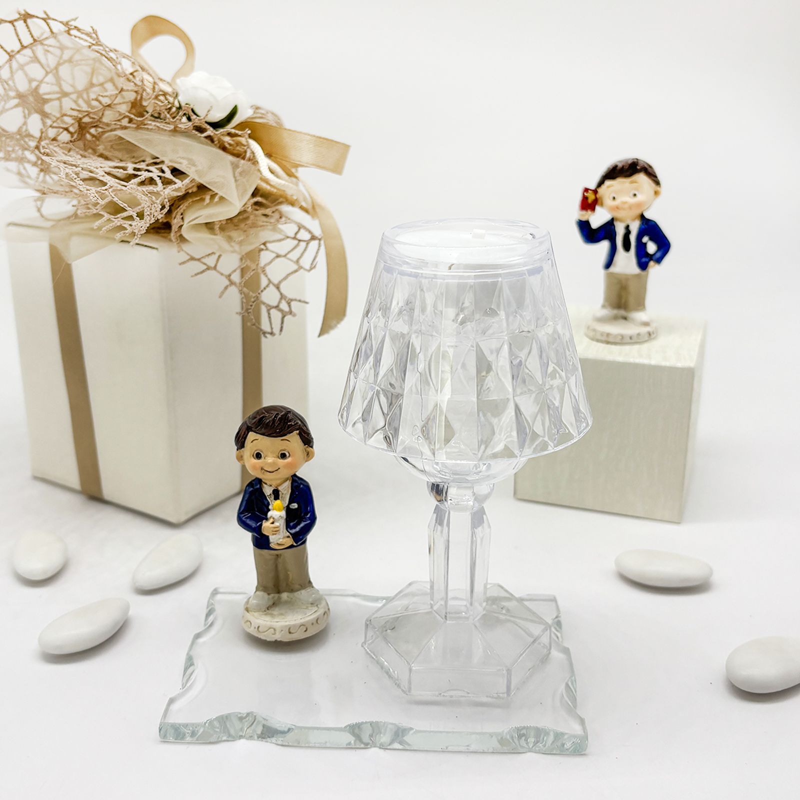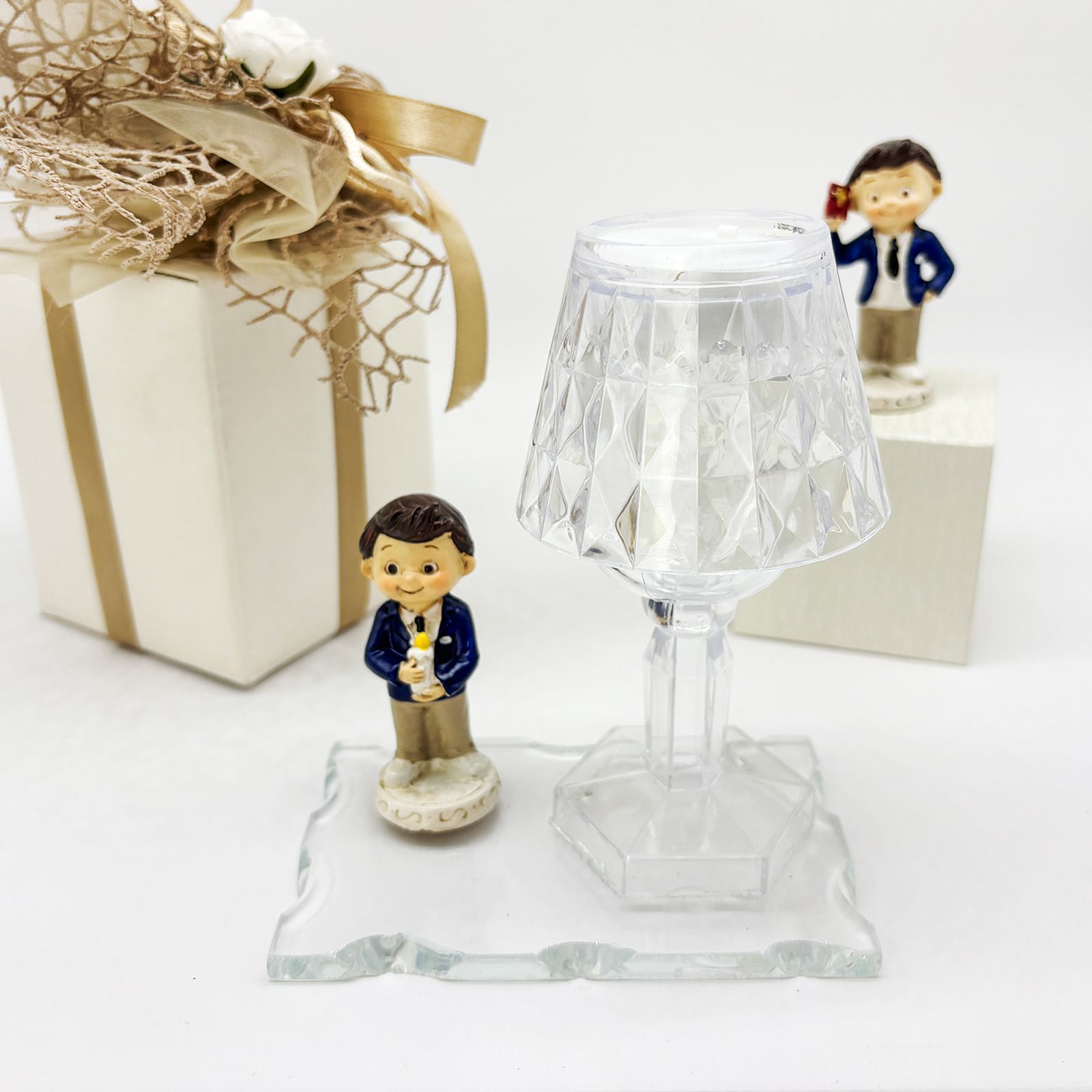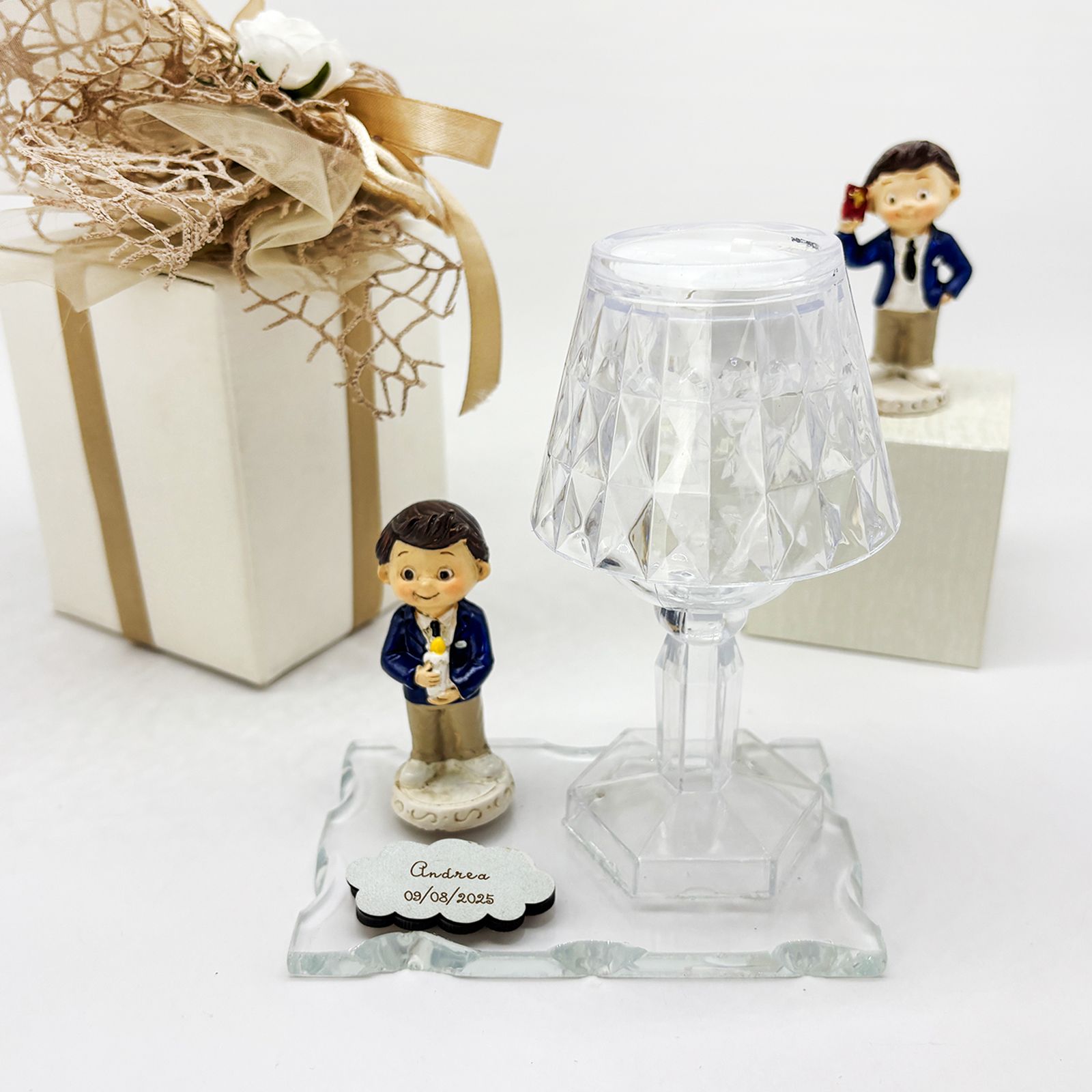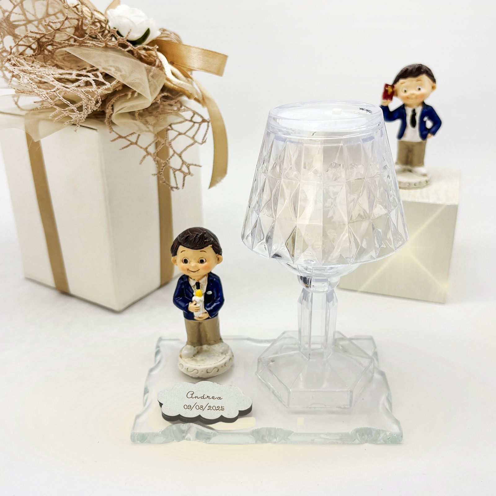 Un dono raffinato e significativo per celebrare un momento speciale. Questa creazione combina una base in vetro, un elegante lumetto LED in plexiglass e una dolce statuina di un bambino in resina, rendendola una delle bomboniere comunione più originali e ricercate. Perfetta per ringraziare gli invitati con un ricordo duraturo, è un simbolo di luce e protezione che accompagnerà nel tempo chi lo riceve.