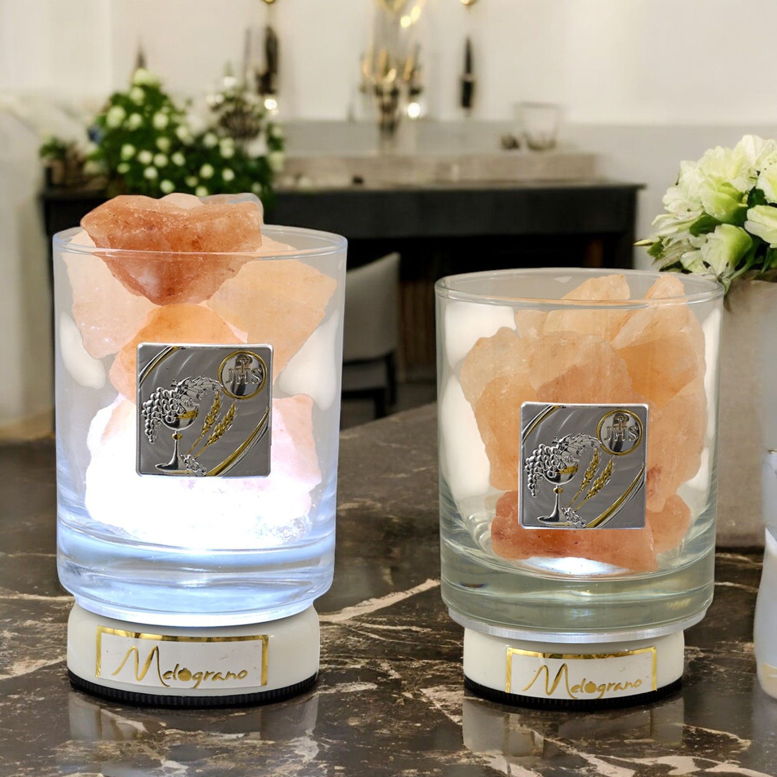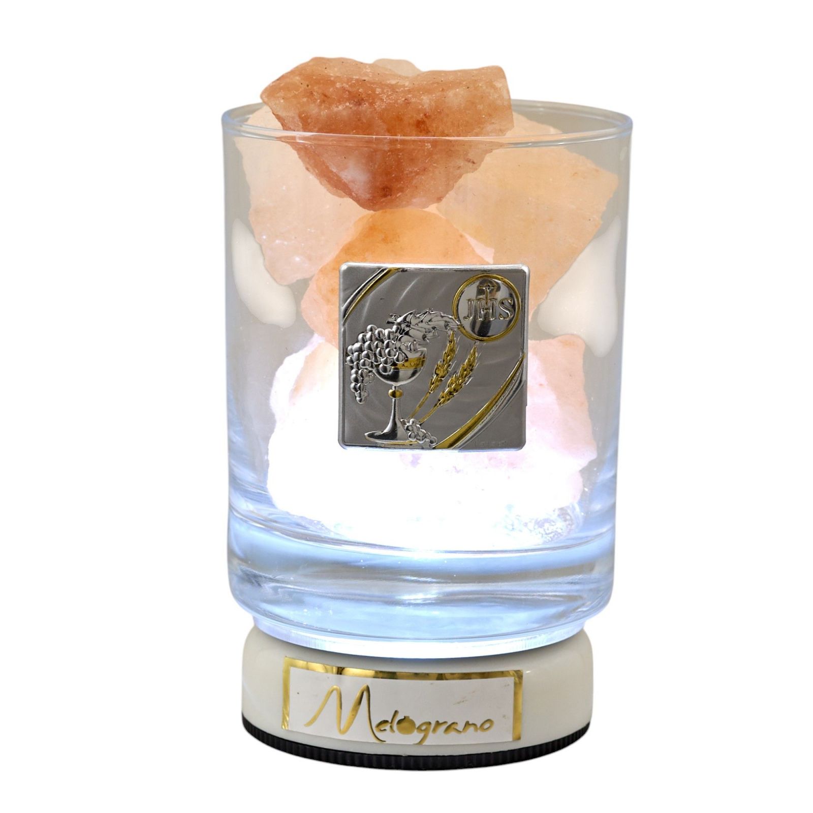 Nella nostra vasta selezione di bomboniere utili e originali, non può mancare la nostra esclusiva Lampada Led con Sale dell'Himalaya. Questo particolare oggetto è realizzato con vetro liscio e all'interno contiene sale dell'Himalaya, noto per le sue proprietà curative. La placchetta argentata con simboli sacri di prima comunione, come il calice e l'ostia, rendono questa bomboniera un regalo simbolico e significativo per celebrare questo importante evento religioso.