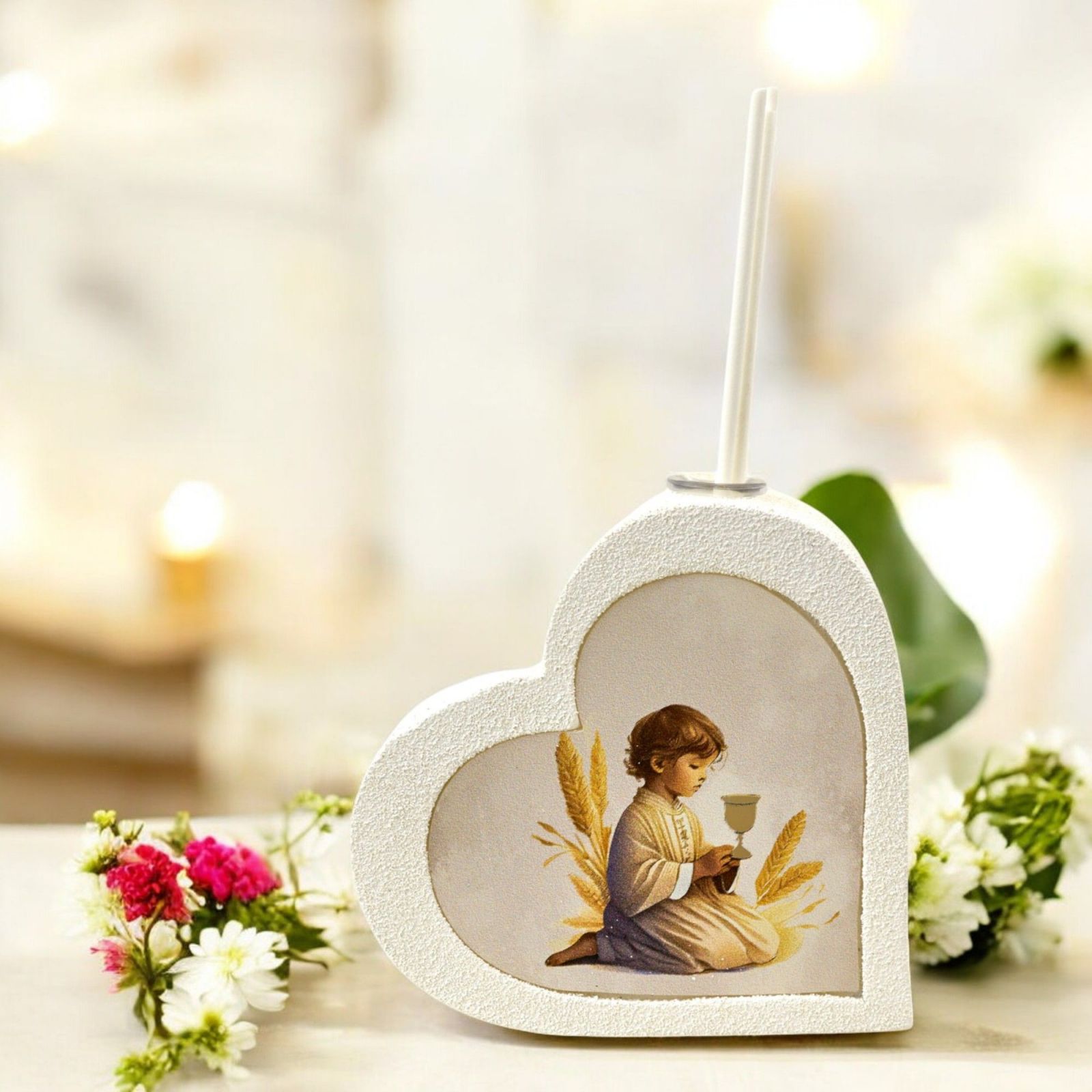 Regala un tocco di dolcezza e spiritualità con questa bomboniera particolare e originale. Realizzata in pregiata resina, presenta un diffusore essenza a forma di cuore con un tenero bimbo in preghiera. Le dimensioni di questa bomboniera sono di circa 10x10x3 cm, perfette per essere esposte e ammirate.