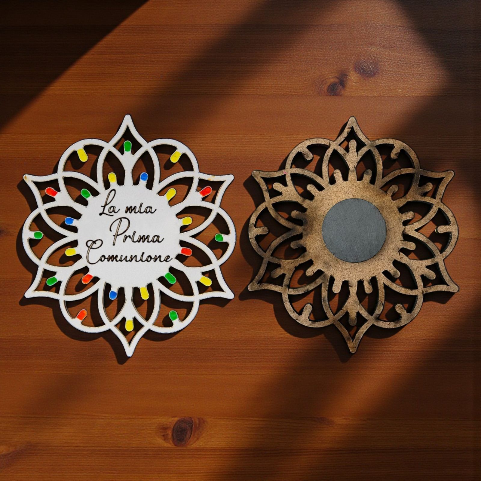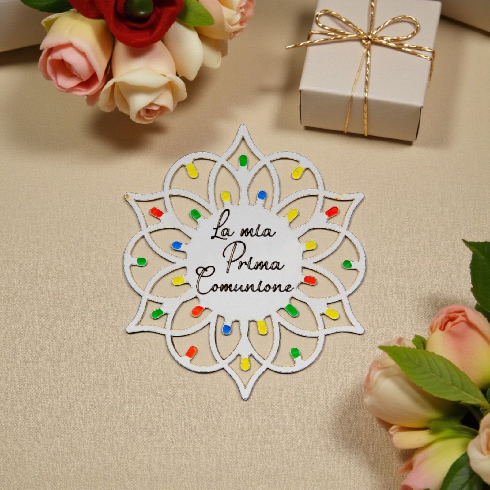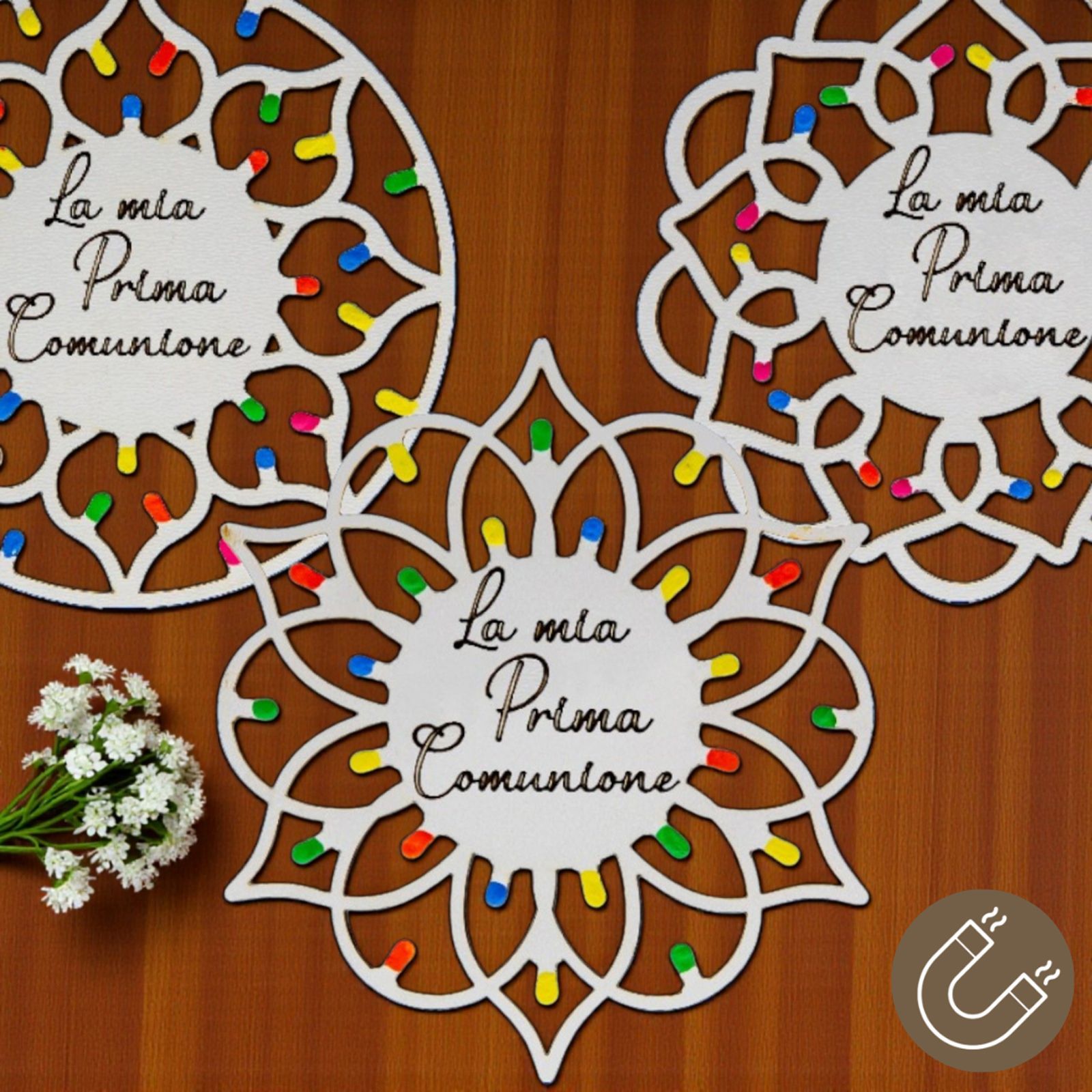 Rendi indimenticabile il giorno della Prima Comunione con le nostre esclusive bomboniere comunione a forma di rosoni pugliesi. Questi deliziosi e suggestivi magneti, realizzati in legno bianco, catturano l'essenza della tradizione pugliese e sono perfetti per celebrare questo momento così speciale nella vita del tuo bambino o della tua bambina. Ogni pezzo è una piccola opera d'arte, arricchita da "lucine" multicolor che evocano le magiche atmosfere delle luminarie delle feste pugliesi.