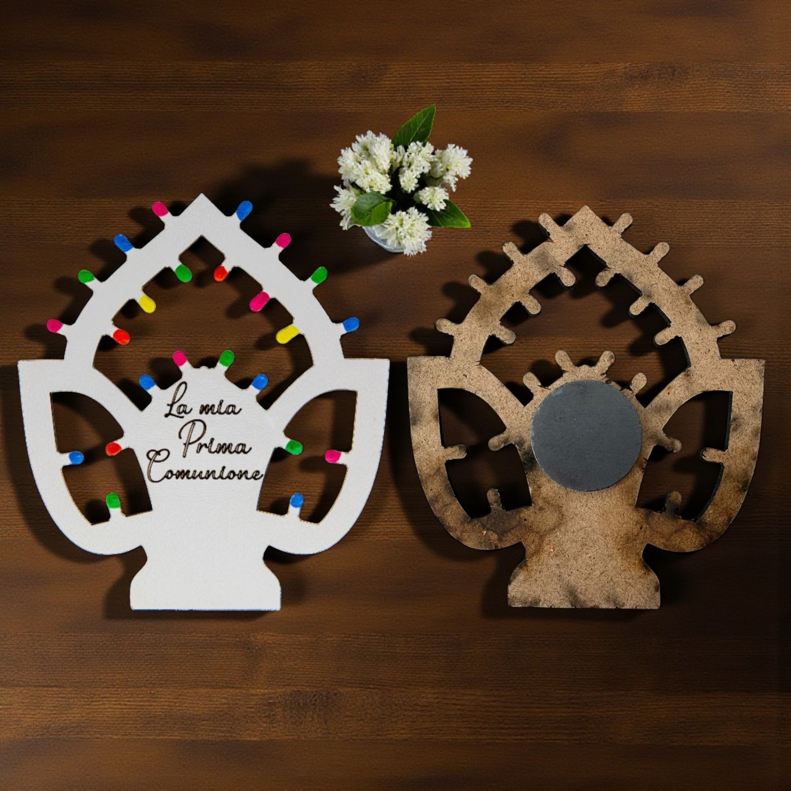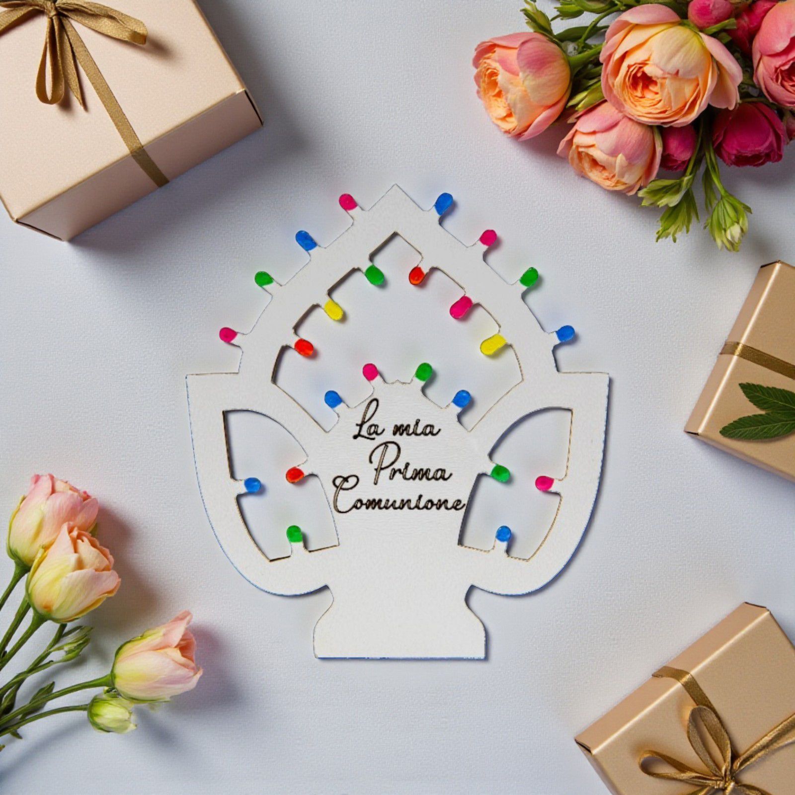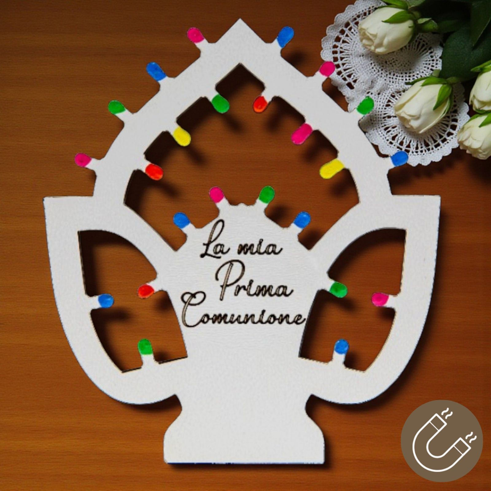 Immagina il sorriso dei tuoi invitati quando riceveranno questo segnaposto unico, un piccolo tesoro da custodire. Al centro, l'incisione "La mia Prima Comunione" rende ogni magnete ancora più personale, trasformando un semplice oggetto in un ricordo indelebile. Le "lucine" multicolor arricchiscono la creazione, facendo brillare ogni momento celebrativo in una festa indimenticabile.