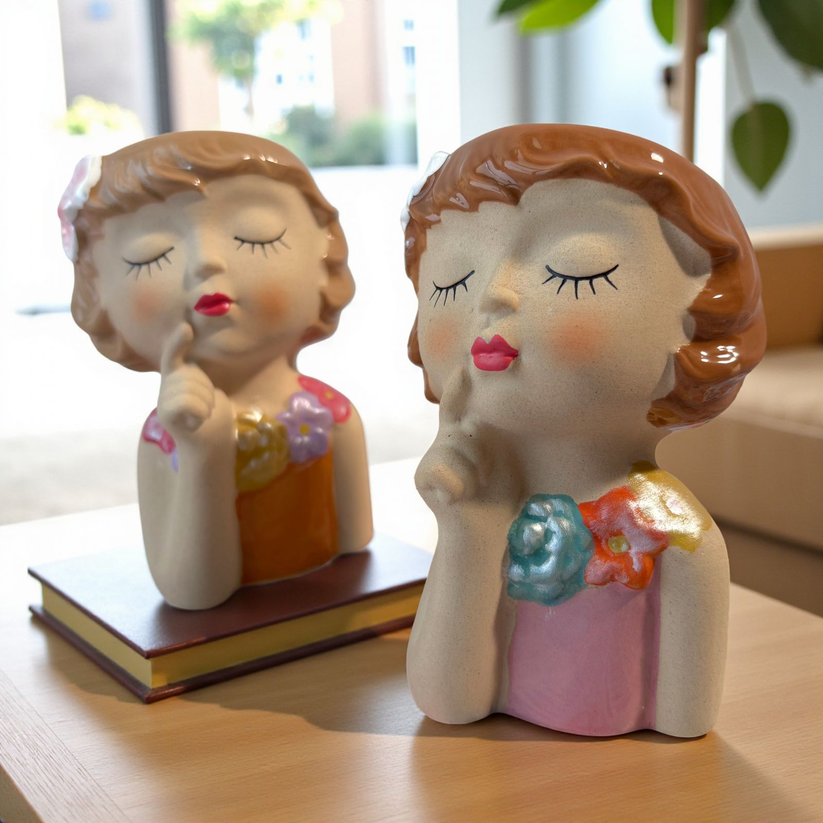 Questo dolcissimo vaso portapianta raffigura una graziosa ragazza dai colori pastello, con fiore tra i capelli e ditino vicino alle labbra, in un gesto tenero e delicato che conquista al primo sguardo. Realizzato in ceramica e assortito in tre varianti di colore come in foto, è perfetto per creare bomboniere comunione, idee bomboniere cresima e idee bomboniere compleanno dal fascino unico e raffinato.