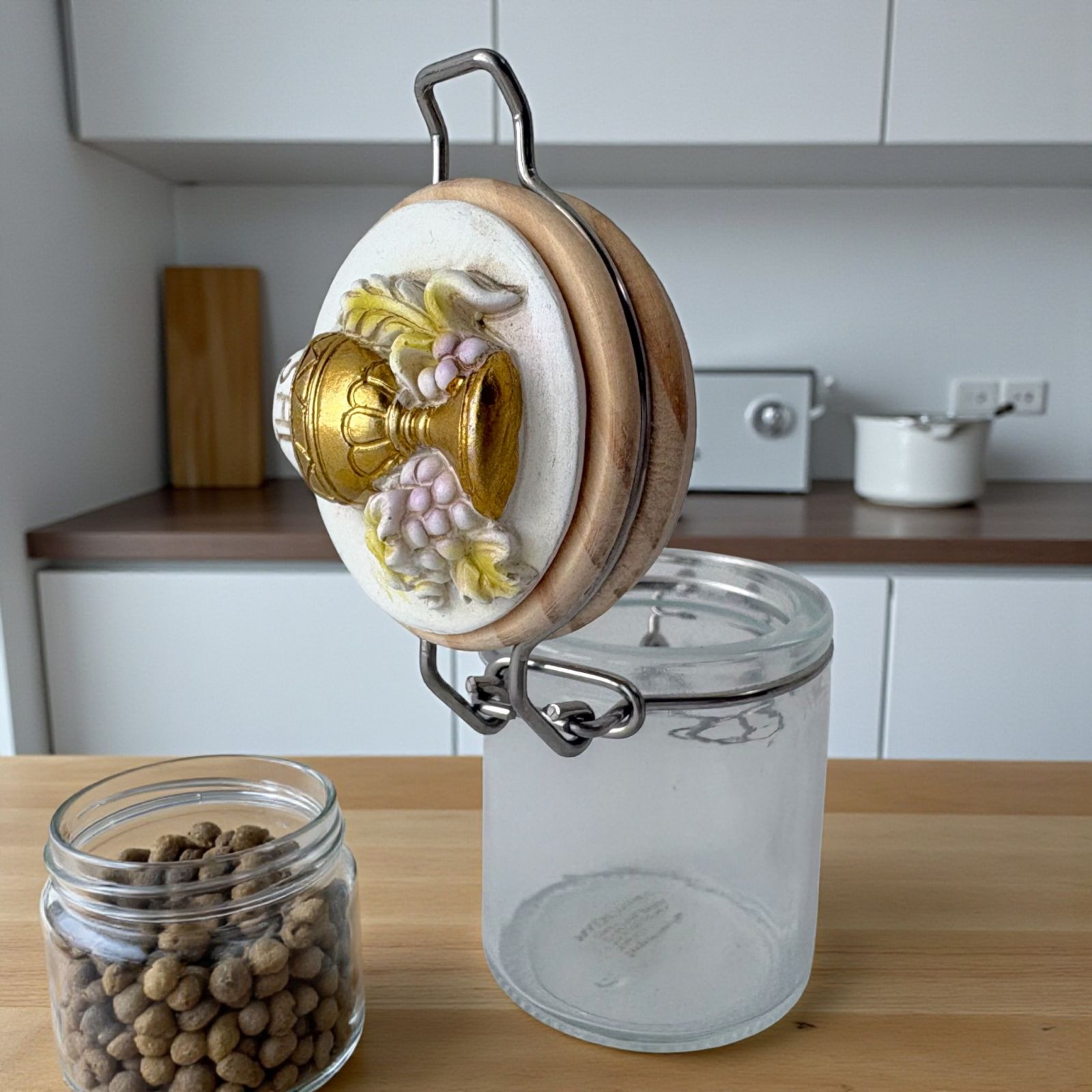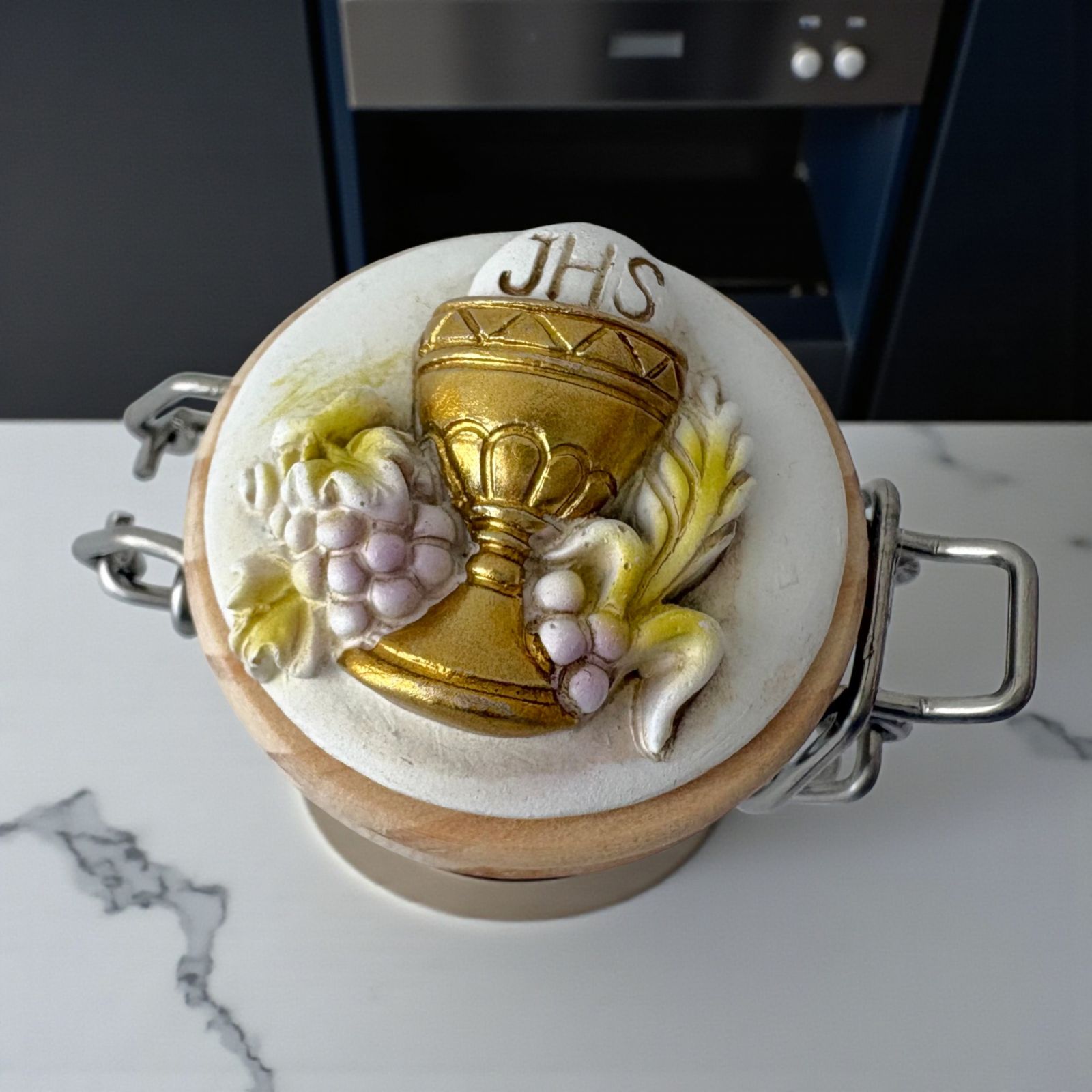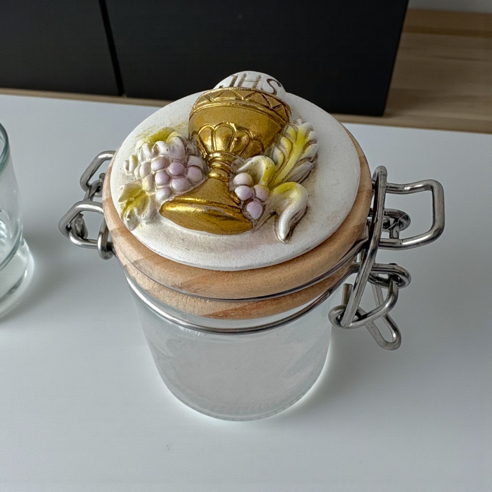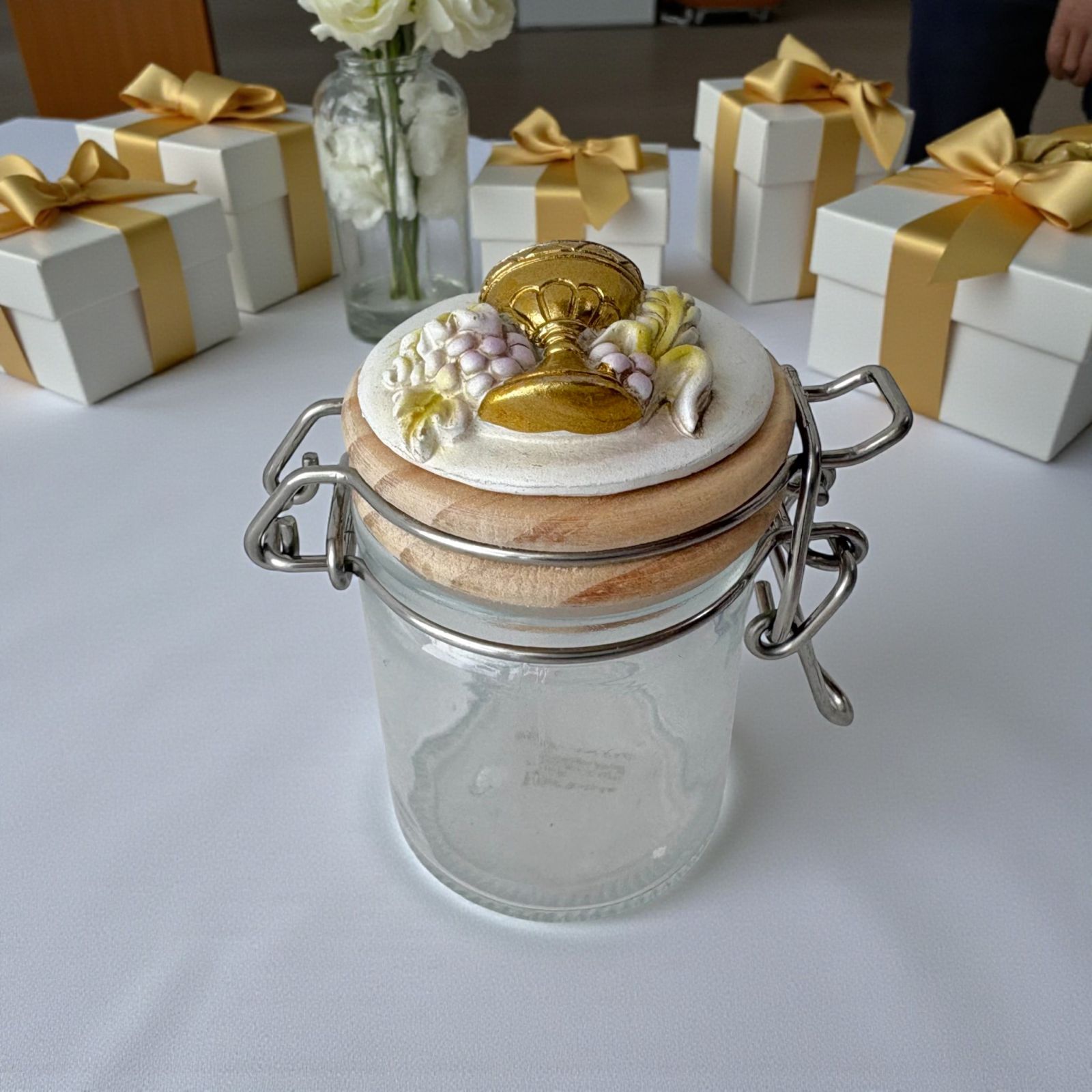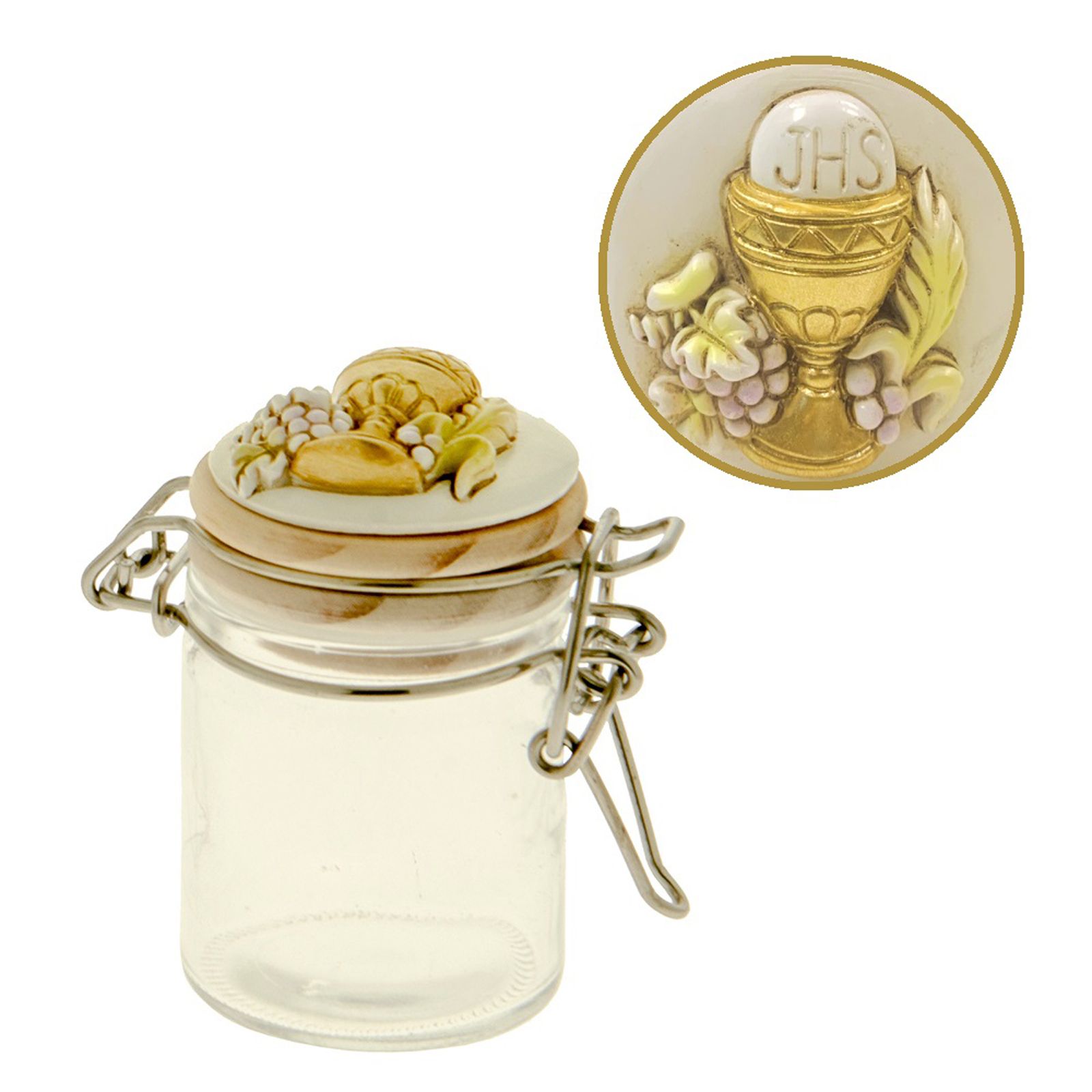 Realizzato in resistente vetro con tappo in legno a chiusura ermetica e gancio in metallo, questo barattolino è impreziosito da una delicata applicazione in resina raffigurante il Calice e l’Ostia, simboli della comunione e della purezza. Ideale come porta confetti o porta spezie, si adatta perfettamente anche come elemento per la confettata, coniugando funzionalità e bellezza.