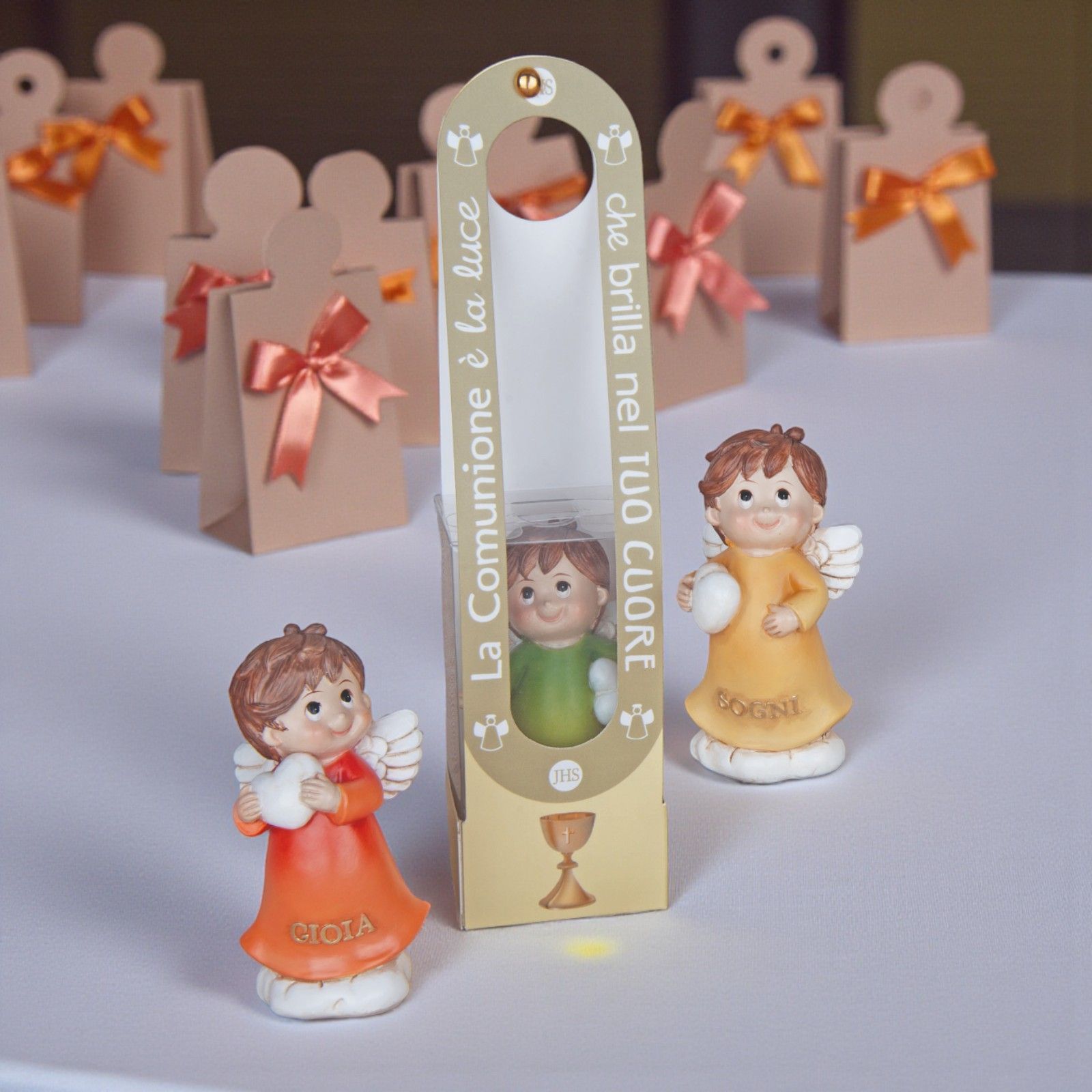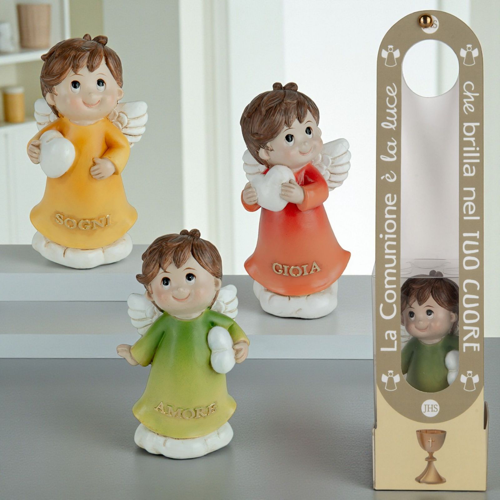 Accogli un’emozione autentica con questa dolce bomboniera dedicata alla Prima Comunione, una statuina in resina che racchiude un tenero angioletto con il cuore tra le mani. Assortia in tre colori – verde, giallo e arancio – e con le parole Gioia, Amore e Sogni, questa creazione diventa un simbolo di luce e dolcezza, perfetta come idea bomboniera prima comunione per bimbo o bimba.