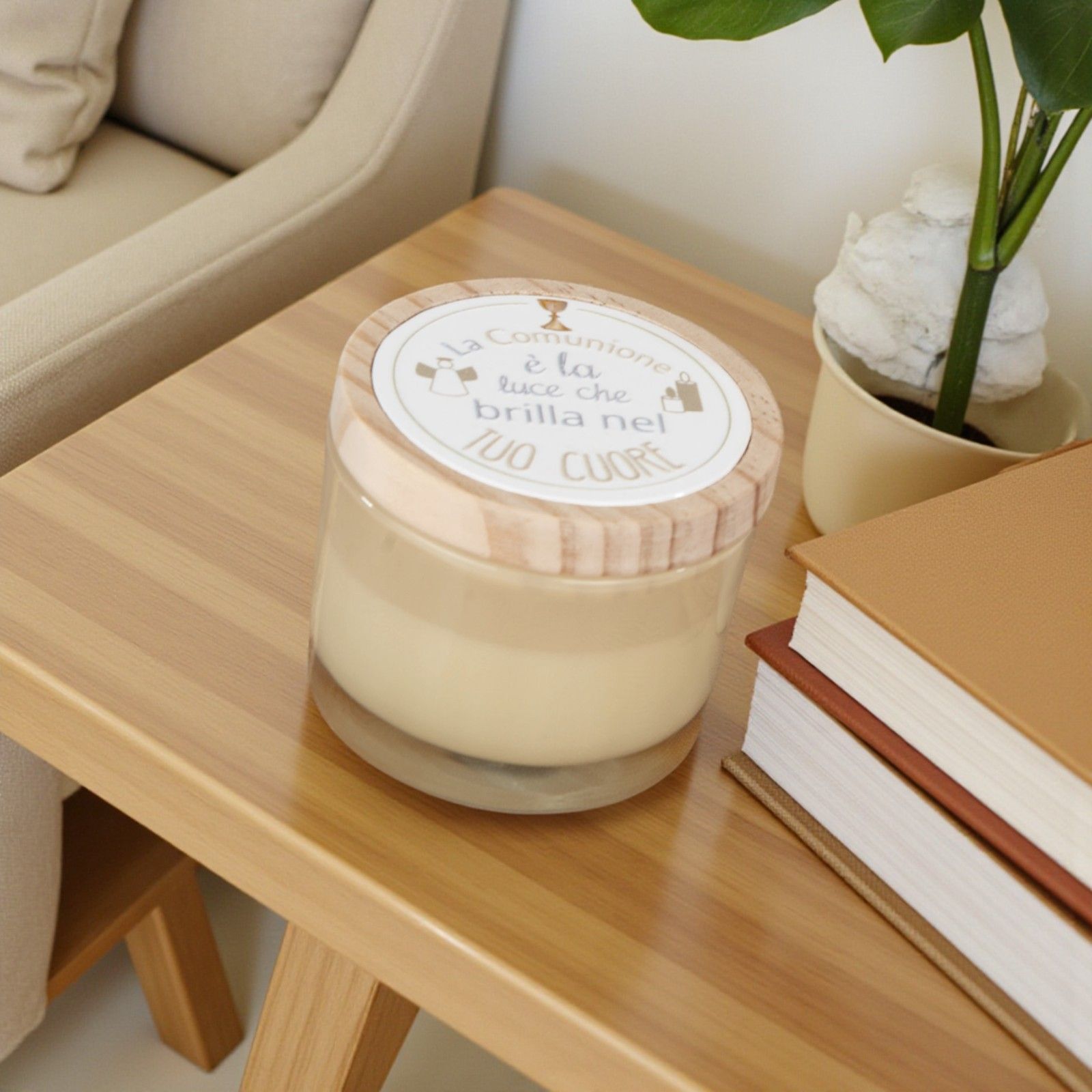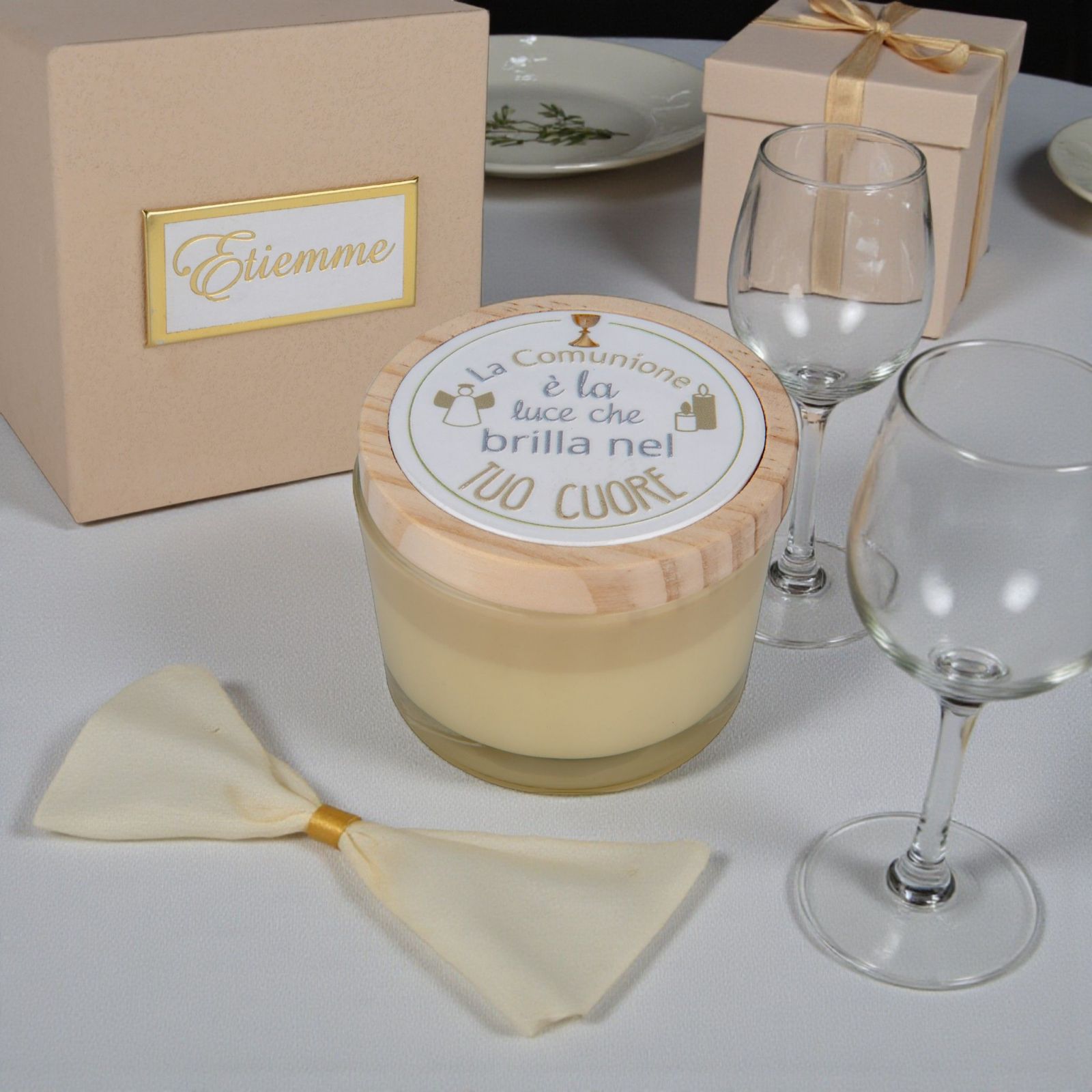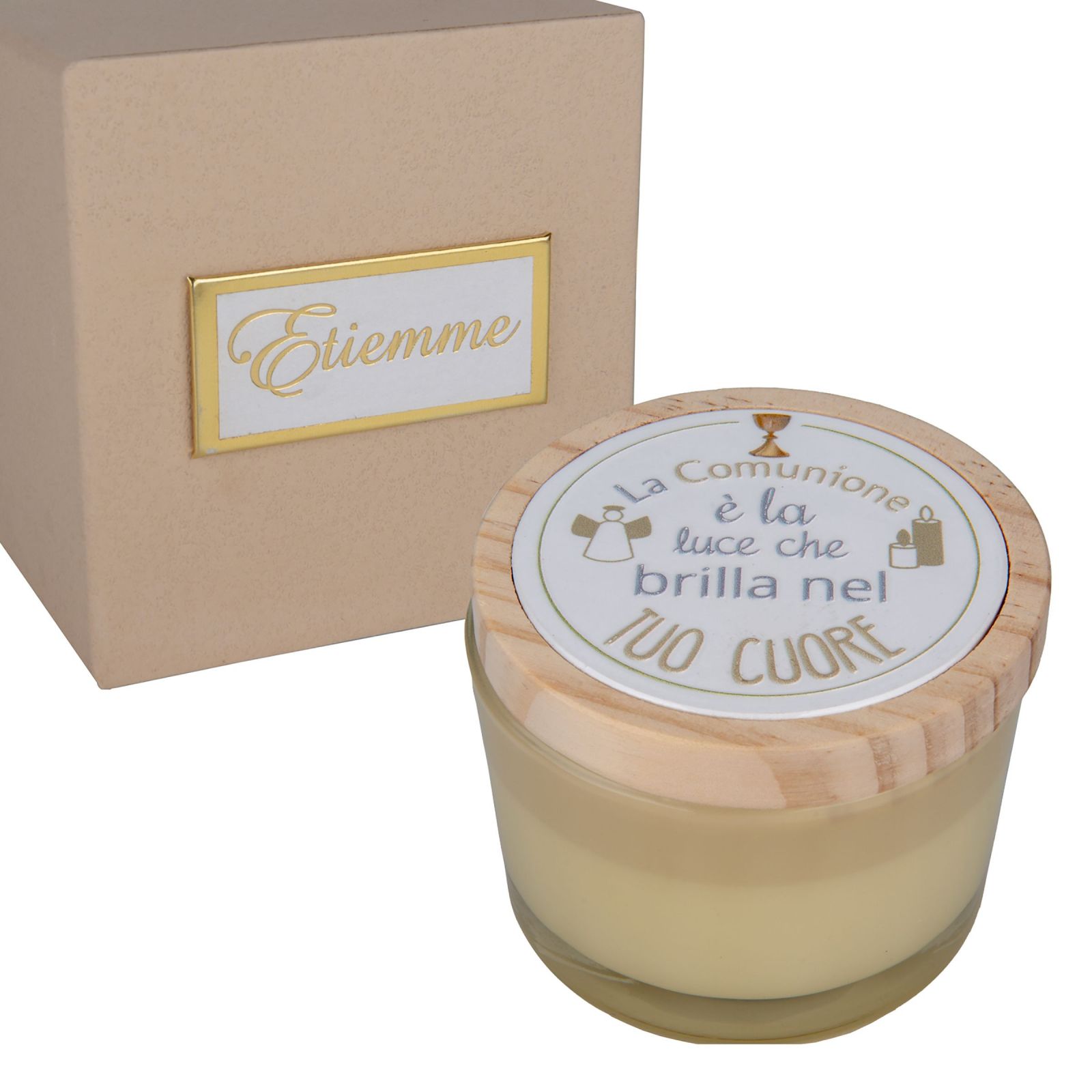 Sorprendi i tuoi invitati con questo portacandela in vetro beige, decorato con la frase "La Comunione è la luce che brilla nel tuo cuore". Una bomboniera pensata per chi partecipa alla festa, un piccolo simbolo di luce e affetto da portare a casa e conservare come ricordo prezioso.