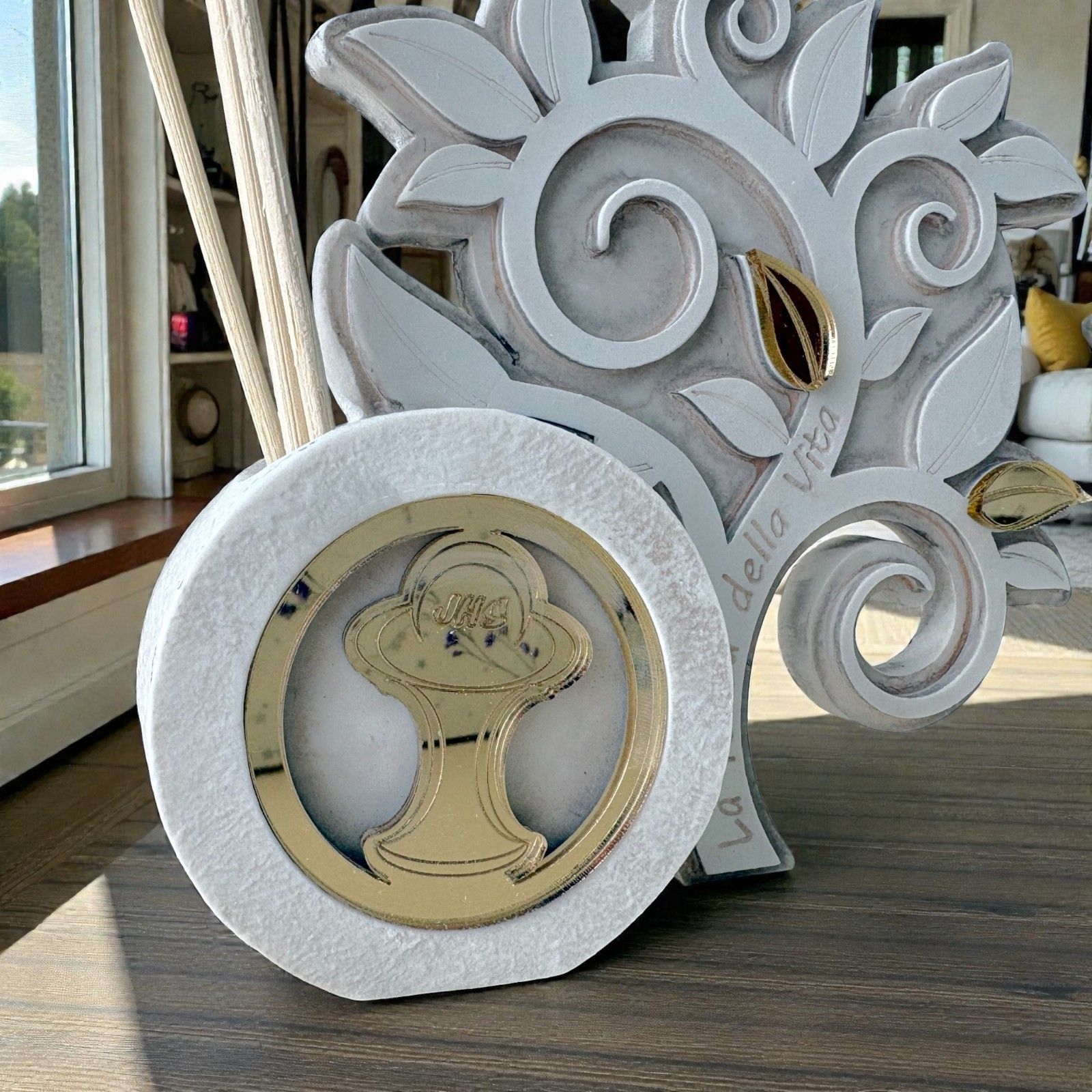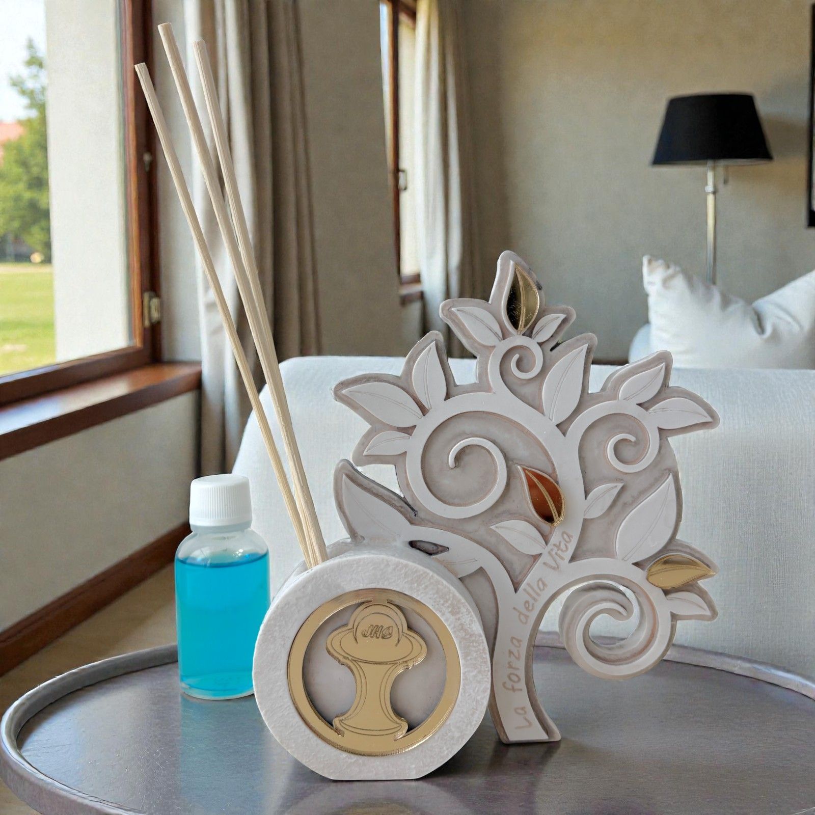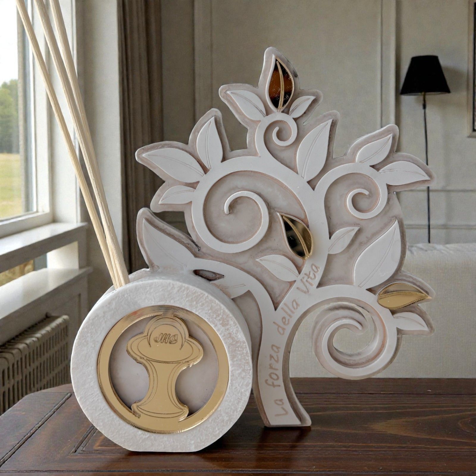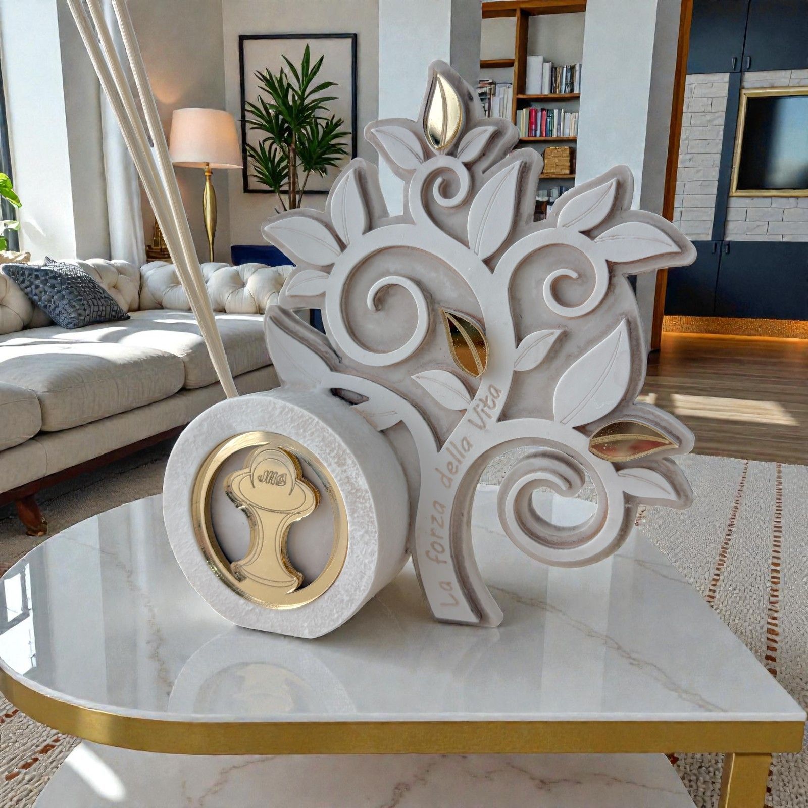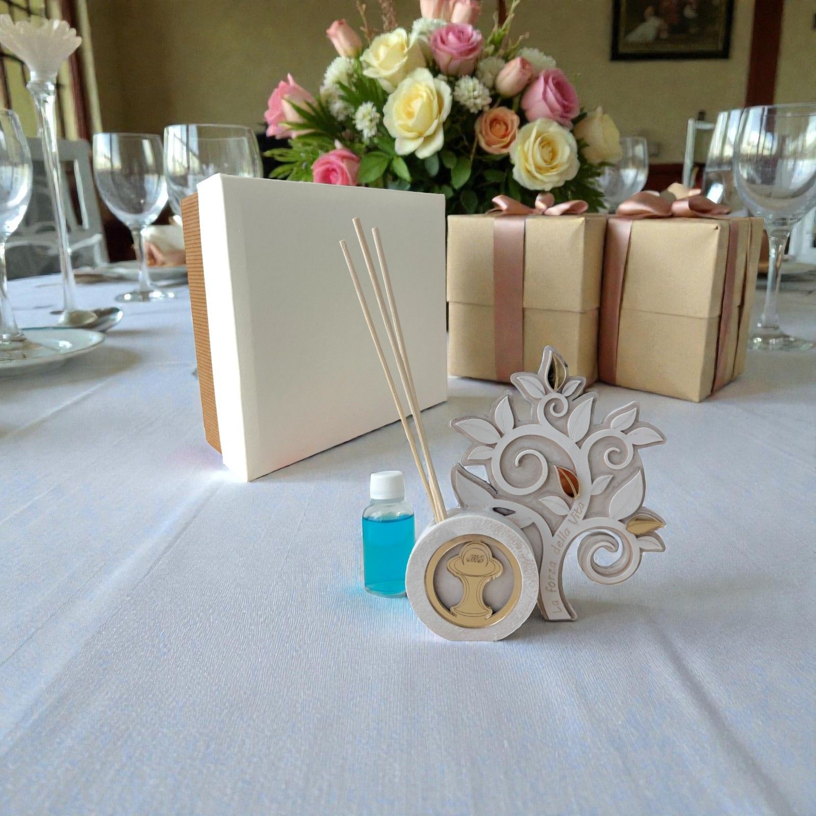 Realizzato in resina di alta qualità, questo profumatore si distingue per il suo elegante design in bianco e beige, capace di adattarsi perfettamente a qualsiasi ambiente. Il profumatore a forma di albero della vita non è solo un accessorio per la casa, ma un vero e proprio portatore di profumi e buone vibrazioni. Il calice e l'ostia, realizzati in plexiglass dorato, aggiungono un tocco di preziosità, rendendo questa bomboniera un regalo indimenticabile.