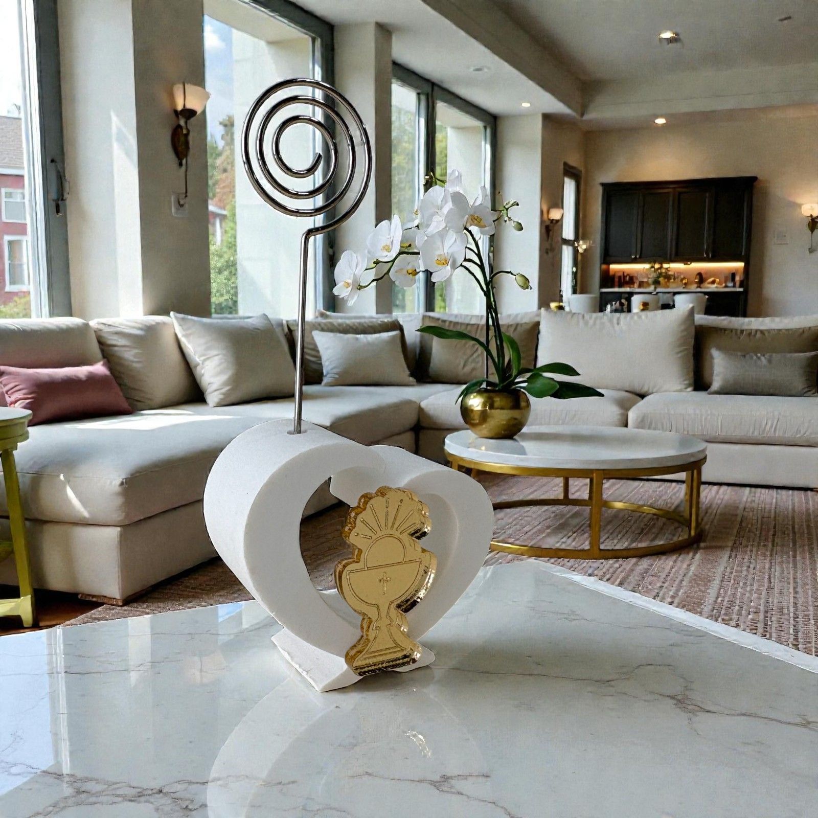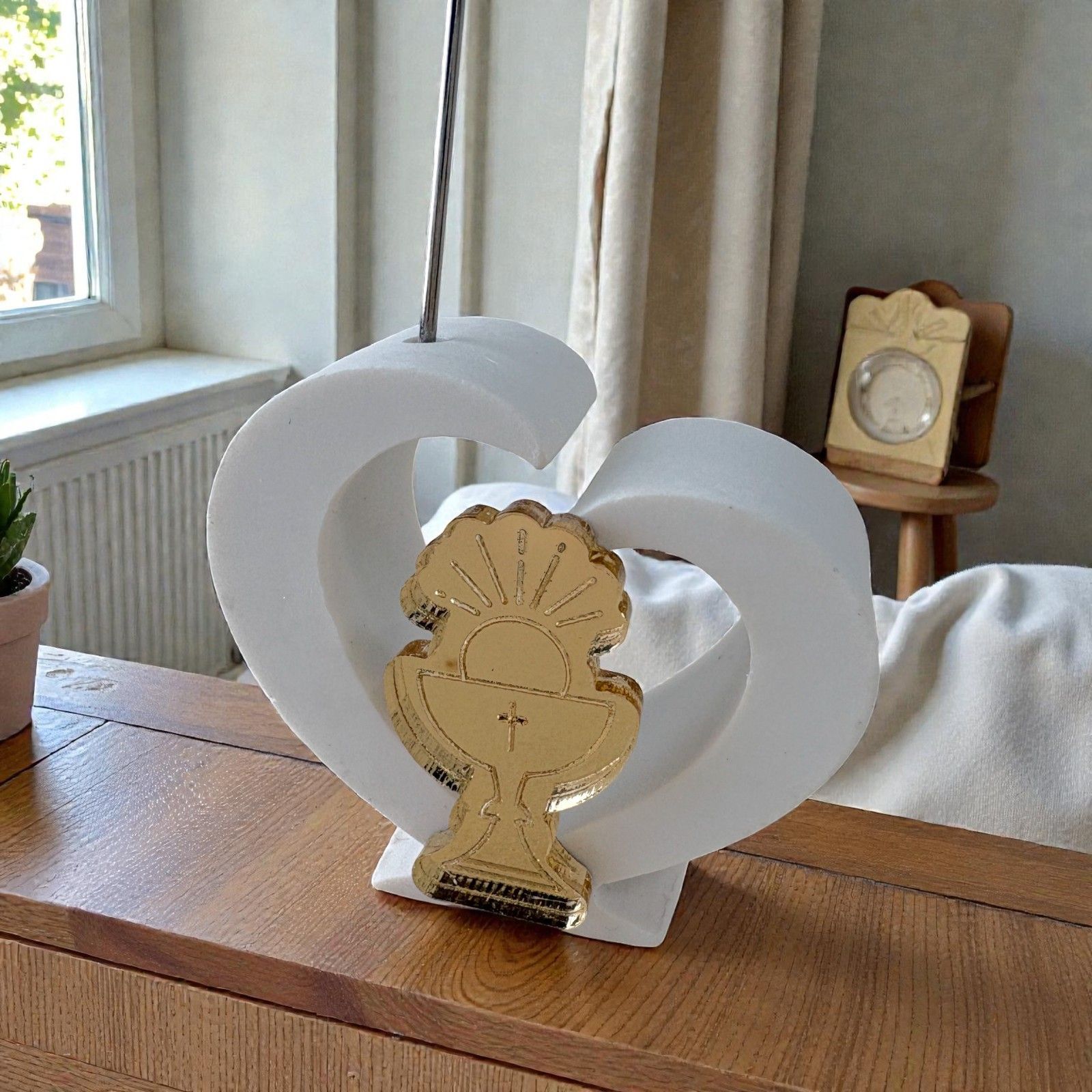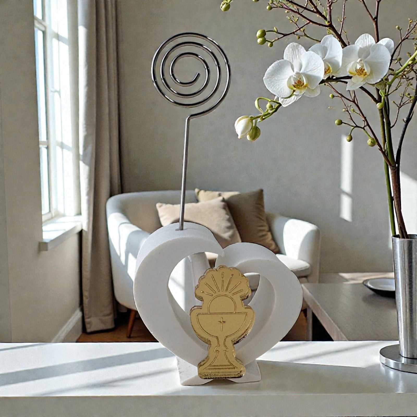 Realizzato in delicata resina e arricchito da un'elegante applicazione dorata in plexiglass a forma di calice e ostia, questo segnaposto a forma di cuore è progettato per accogliere una foto o un bigliettino, rendendo ogni tavola unica e personalizzata. L'asta in metallo a spirale aggiunge un tocco di modernità, rendendo il tuo evento indimenticabile e carico di emozioni.
