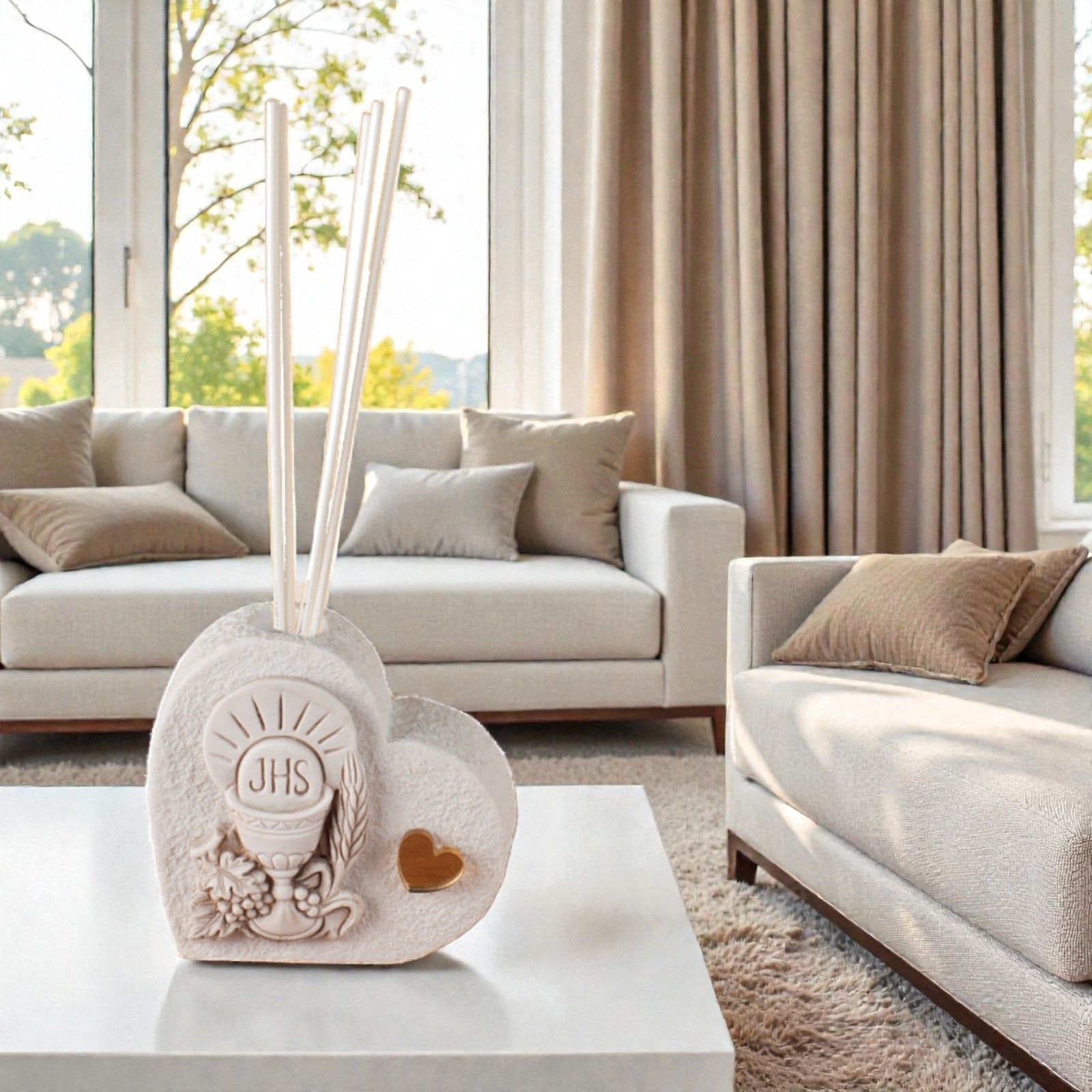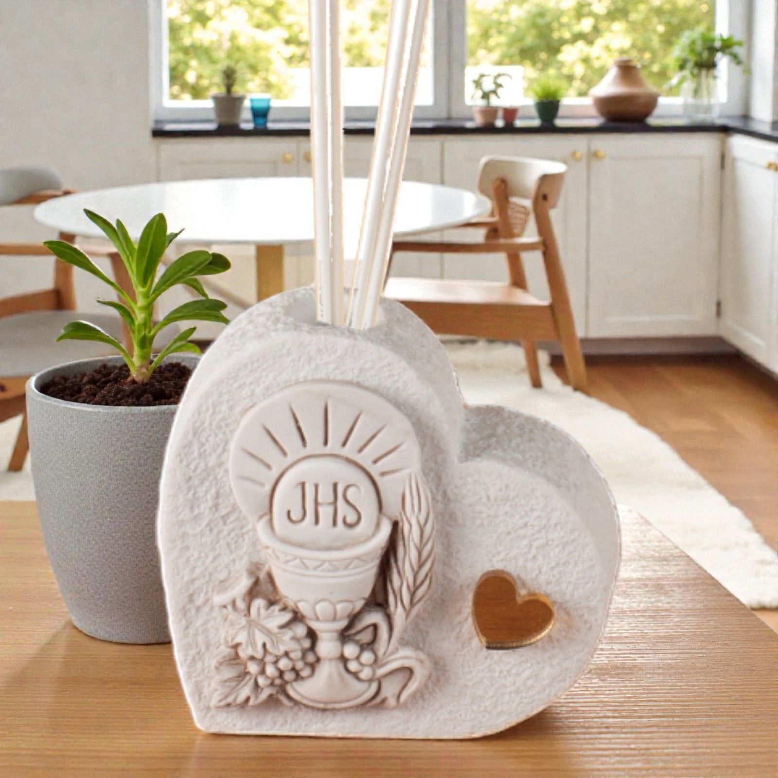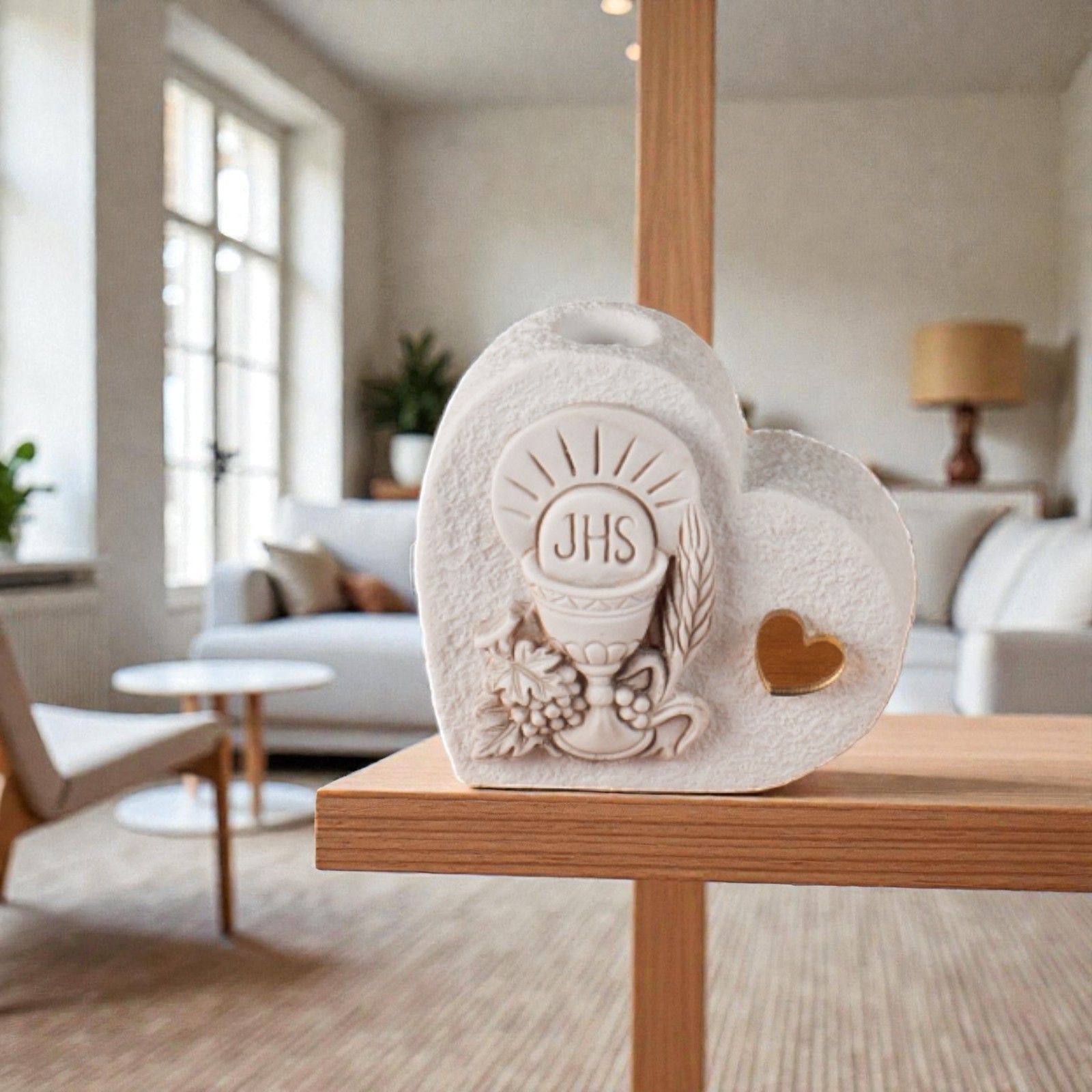 Realizzato in resina effetto pietra, questo profumatore non è solo un elegante accessorio, ma un simbolo di unione e protezione. La raffigurazione in bassorilievo del calice e dell'ostia racconta una storia di fede e amore condiviso, mentre il cuoricino in plexiglass dorato aggiunge un tocco di luminosità e raffinatezza. Un'idea perfetta per festeggiare sia maschietti che femminucce!