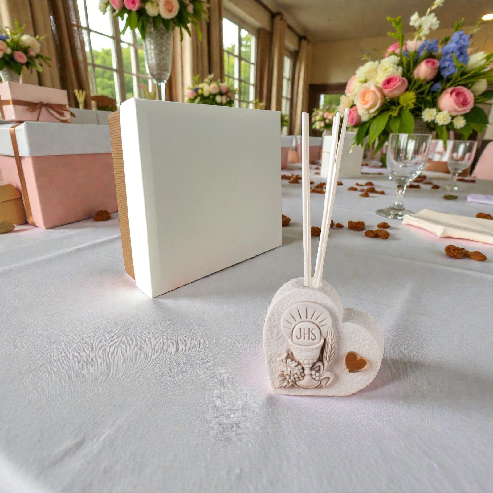 Lasciati avvolgere dalla dolcezza e dalla spiritualità di questo diffusore a forma di cuore, un'emozionante bomboniera per comunione che trasmette amore e devozione. Ogni volta che verrà inserita l'essenza, ricorderà ai tuoi cari il giorno speciale della prima comunione, un momento di gioia e crescita spirituale che resterà nel cuore.