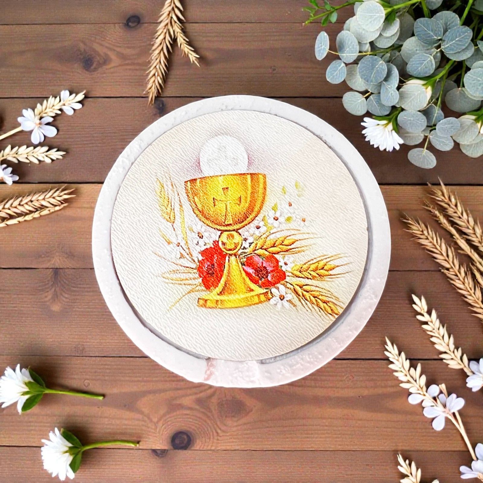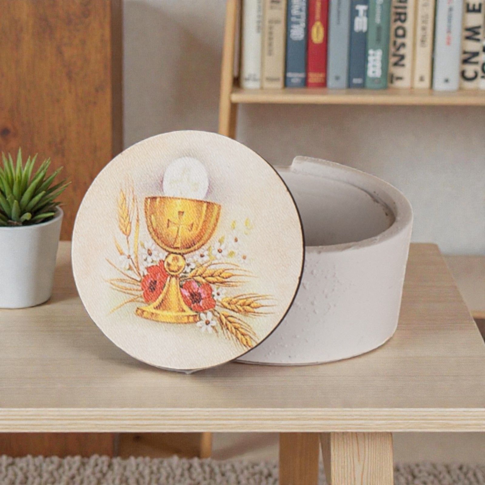 Realizzata in resina effetto pietra, questa scatolina porta rosario unisce eleganza e praticità. Il suo design a base tonda, abbellito da una stampa colorata che rappresenta un calice e un'ostia, rende questo accessorio un complemento d'arredo affascinante. Ogni particolare è curato nei minimi dettagli, per garantire un'esperienza di alta qualità. In aggiunta, il rosario con perline incluso è un gesto di amore e protezione, un tocco prezioso che accompagnerà il ricevente nel suo cammino di fede.