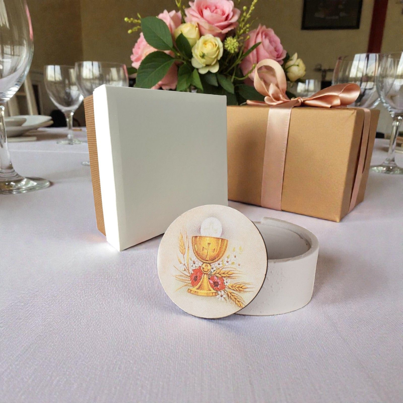 La scatolina con rosario e calice ed ostia è un'emozionante espressione di amore e devozione, perfetta come bomboniera per la comunione di un bambino o di una bambina. Questo delicato oggetto non è solo un regalo, ma un simbolo di un momento unico e memorabile, un ricordo tangibile di una giornata speciale. Ogni volta che lo si guarda, si rivivono le emozioni di quel giorno, trasmettendo un messaggio di fede e speranza.