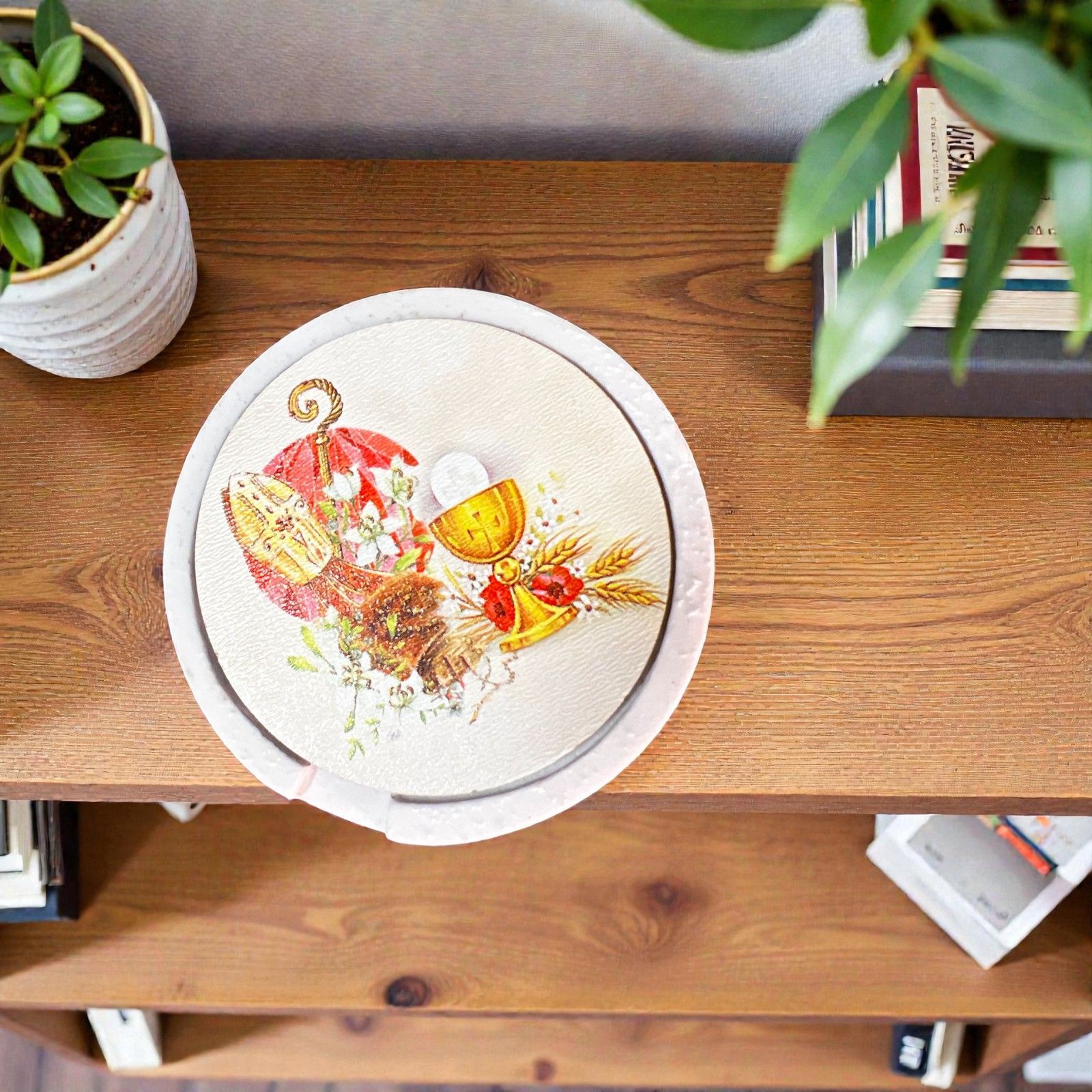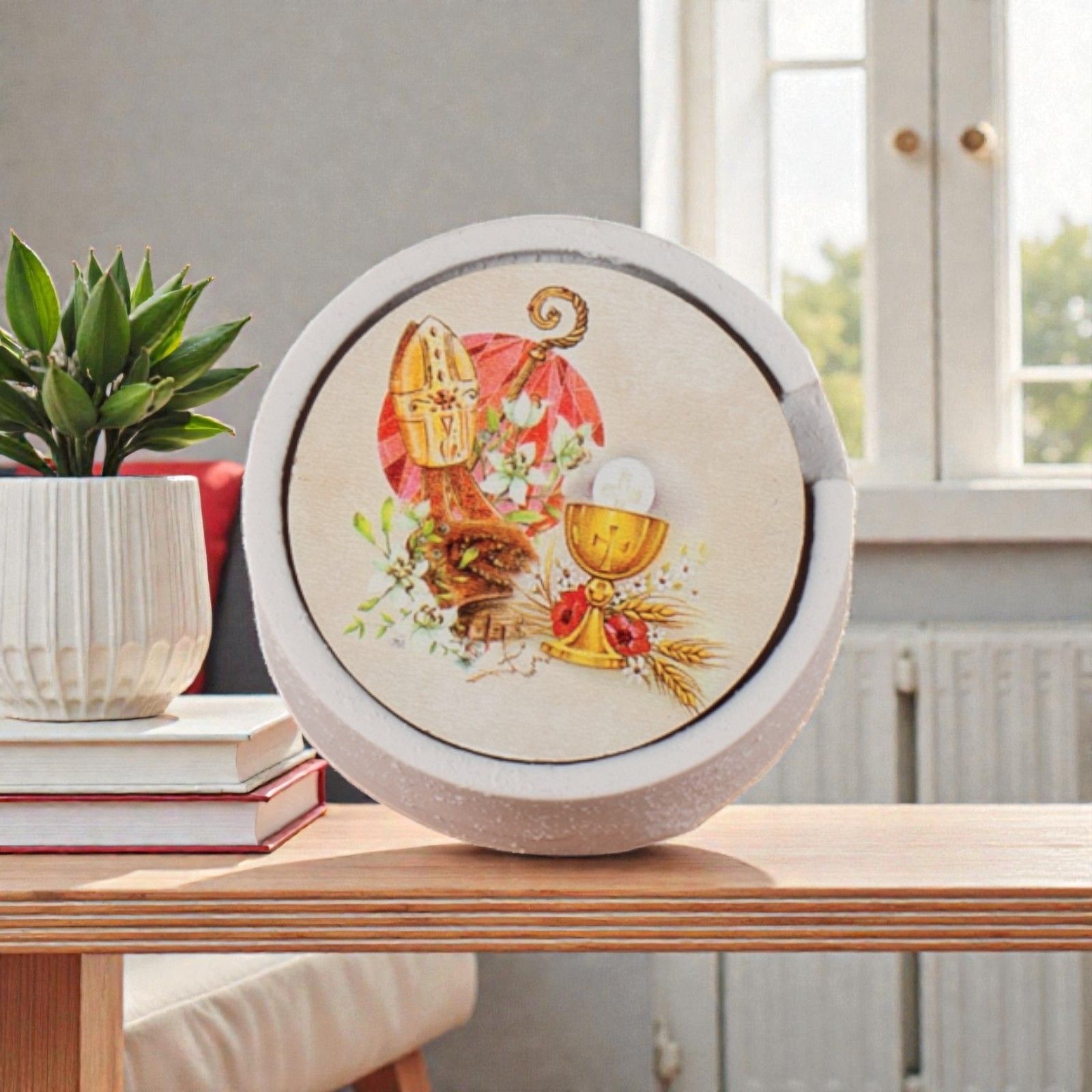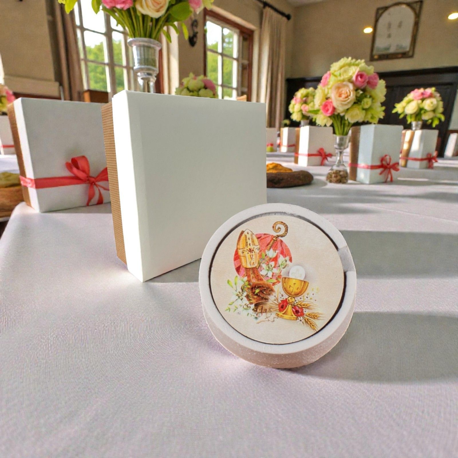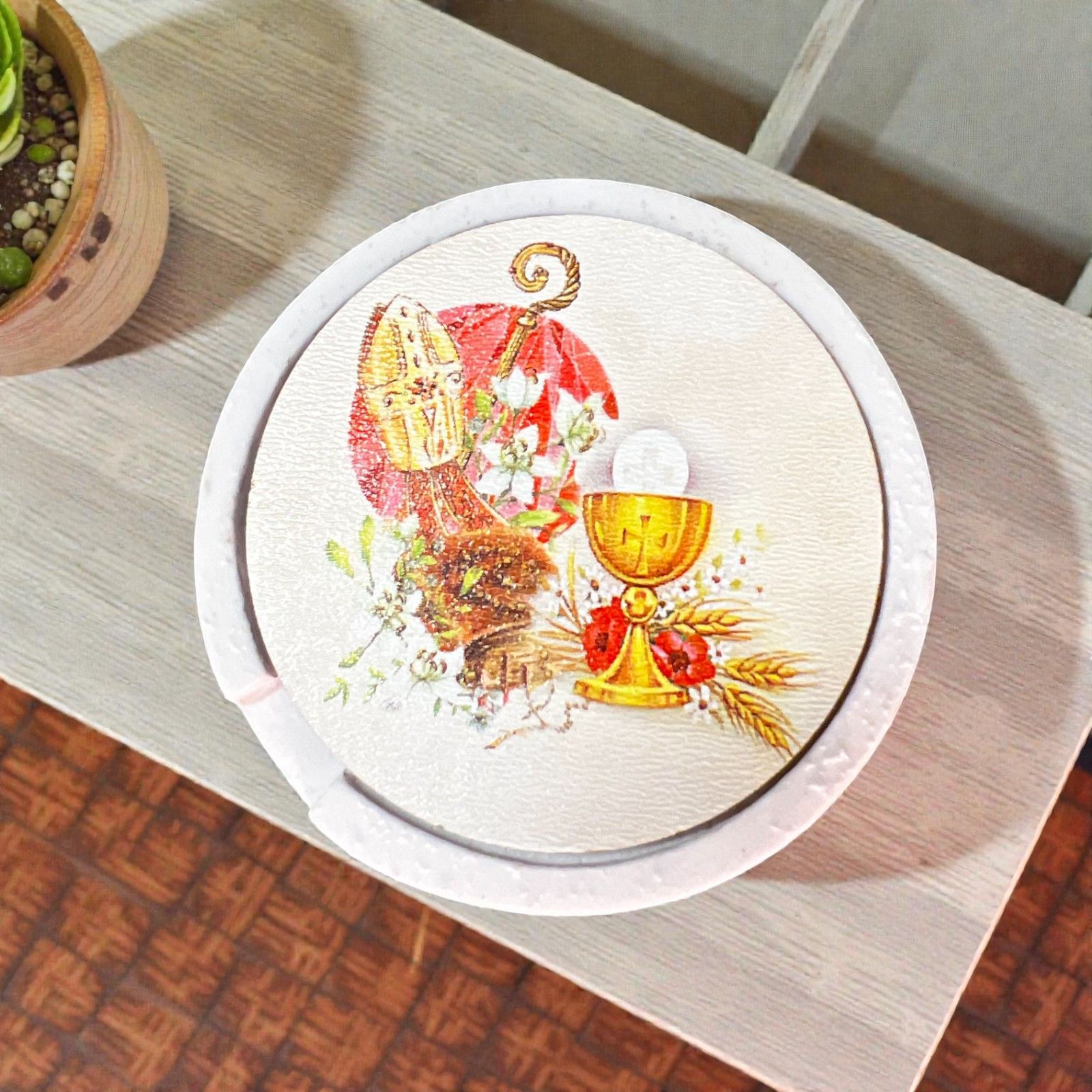 Realizzato in resina effetto pietra e decorato con un coperchio incantevole, presenta una stampa vibrante che rappresenta il calice, l'ostia, la mitra e il bastone, simboli di una tradizione profonda. Questa scatolina porta rosario è perfetto per ragazze e ragazzi, rendendo ogni occasione un momento di condivisione e gioia. Inclusa, la scatola regalo, che aggiunge un tocco di eleganza, mentre il rosario con perline completa questo dono con amore e cura.