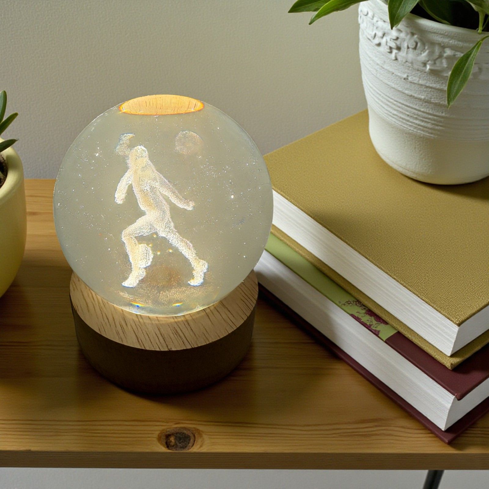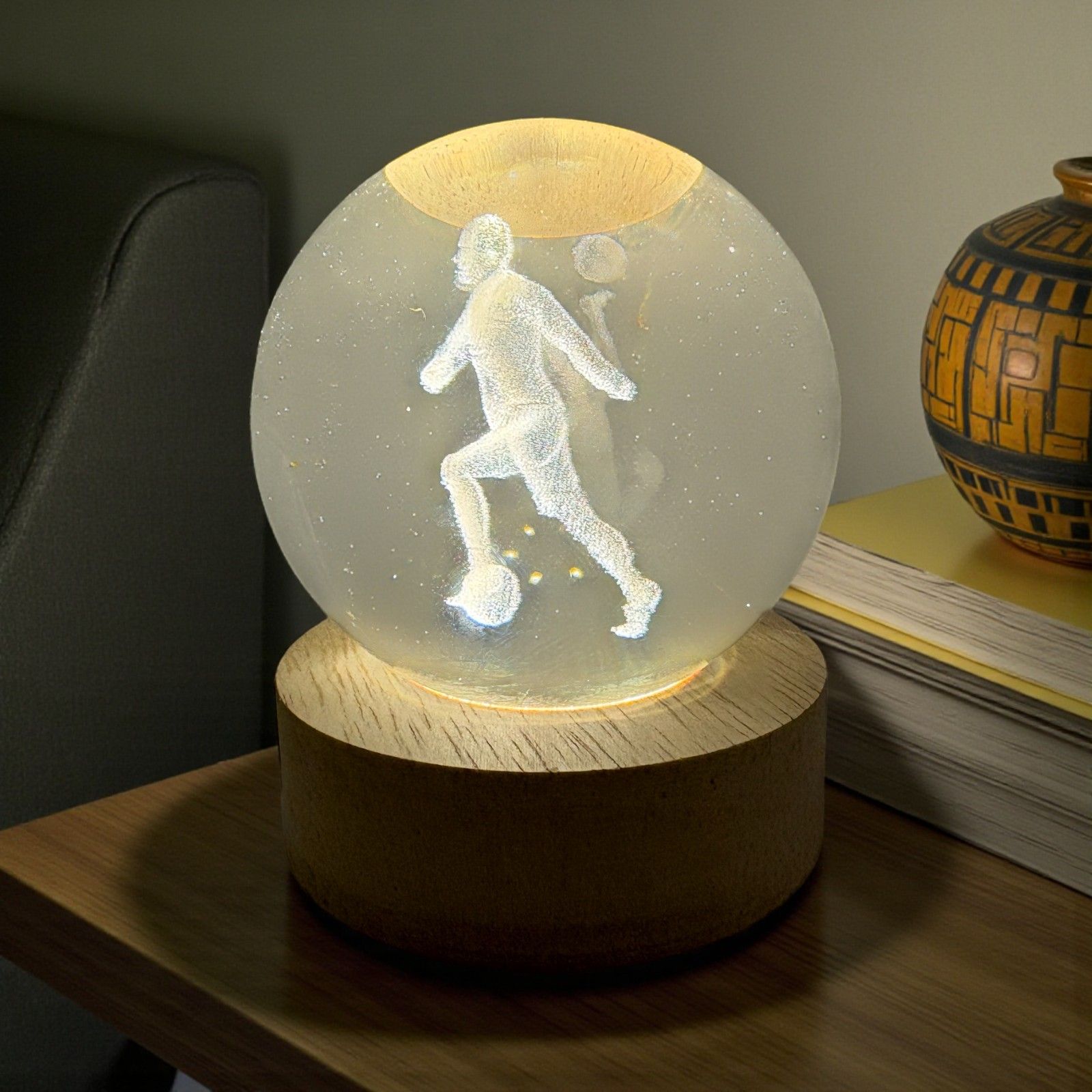 Rendi unico il tuo evento con una bomboniera a tema calcio che stupirà ogni invitato. La lampada led a sfera mostra l’immagine di un calciatore in azione grazie a un modulo led nascosto nella base in legno, che illumina delicatamente la sfera e fa emergere ogni dettaglio dell’atleta.